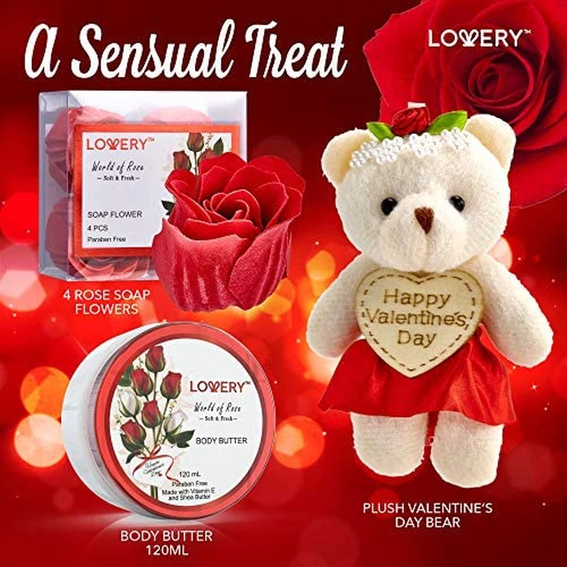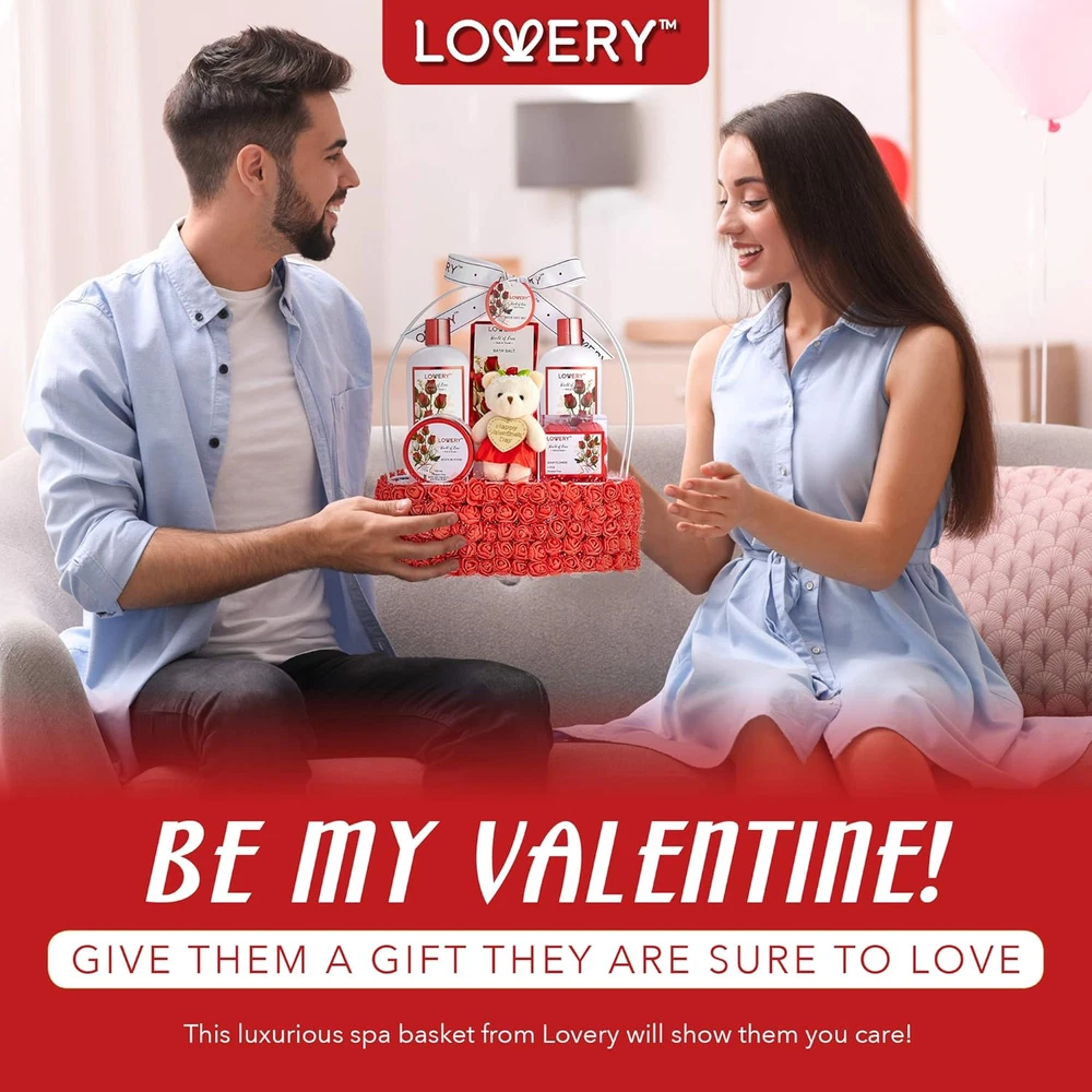 Valentines and holidat gift basket; treat the special lady in your life to a pink and rose themed bath gift basket stuffed with delightful self care goodies that will make her feel like the amazing woman she is. This beautiful handmade basket is filled with aromatic rose scented bath and body products. Reuse for storage or as an eye catching bathroom accent piece 7 piece pampering spa gift set; Lock the door, light the candles, put on some mood music and sink into an infinitely relaxing spa evening all to yourself; you deserve it, girl; Scrub yourself from nose to toes and enjoy a fragrant aromatherapy session with bath salts, bubble bath, shower gel floral soap and body butter, plus a cute teddy bear friend The amazing benefits of Rose; All items are crafted with an exquisite real rose scent. This beautiful fragrant flower is the universal symbol of love and exerts a positive soothing effect on mind, body and skin. The delicate wafting aroma of rose petals helps to calm restlessness; Give your skin more of what it loves with Lovery Pure natural skin soothing ingredients; Lovery women’s luxury bath products are formulated with all natural ingredients like Shea Butter and Vitamin E that deeply moisturize and gently soothe your skin. Delicately cleansing and perfect for all skin types: normal, dry, oily, combination and sensitive. All of our products are 100% pure, safe, free of parabens and harsh chemicals and absolutely never tested on animals Customer satisfaction our priority; Love it or we are here to make you happy. We can'tt wait to add you or the lucky lady to our long list of wonderful women who can't get enough of Lovery bath and body products. And we absolutely love our amazing customers. if you have any issue with your order, please contact us and our dedicated customer service team will make it right Rose is the fragrance of love… show the important women in your life just how much you love and care about them on Valentine’s Day – or any day – with this mood-lifting spa gift basket from Lovery . Give a gift that will put a smile on her face and truly make her heart soar. Perfect for Wives, Girlfriends, Moms, Grandmas, Sisters, Besties, Coworkers, Teachers, Bosses and all the lovely Ladies in your life who could use some much-deserved “me time”! 10 PIECE SET INCLUDES: 250 ml Shower Gel 250 ml Bubble Bath 120 ml Body Butter 100 g Bath Salts 4 pcs Flower Soap Petals Toy Valentine Teddy Bear Handmade Rose Gift Basket Every pampering spa product in this set is crafted with an exquisite real rose scent. This beautiful fragrant flower is the universal symbol of love and exerts a positive soothing effect on mind, body and skin. BENEFITS & FEATURES: Elegant Valentine’s Day Packaging Long-Lasting Rose Scent Formulated with Shea Butter & Vitamin E Safe for All Skin Types Blank Lined Gift Note Attached to Write Heartfelt Message Wrapped & Packaged for the Ultimate Presentation with a Ribbon & Tag Beautiful Handmade Reusable Basket Paraben-Free & Cruelty-Free 100% Satisfaction Guarantee The intricate handmade basket itself is an awesome extra gift to keep after the bath set is all used up. Perfect for Toiletries and Bathroom items. Spread the love with this perfect present for Holidays, Special Occasions or just that Special Someone – even if that special someone is YOU! Start your day off on the right foot and end it on the perfect note with Lovery brand bath and beauty products.