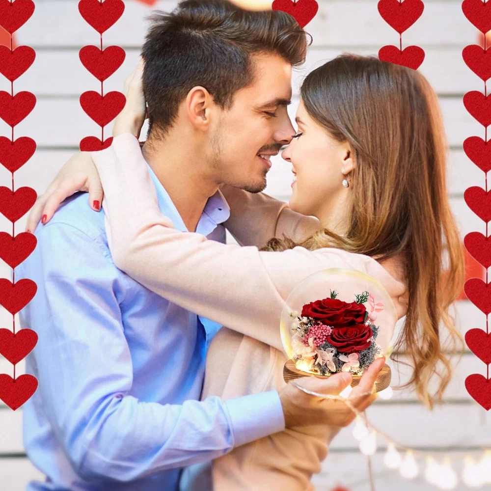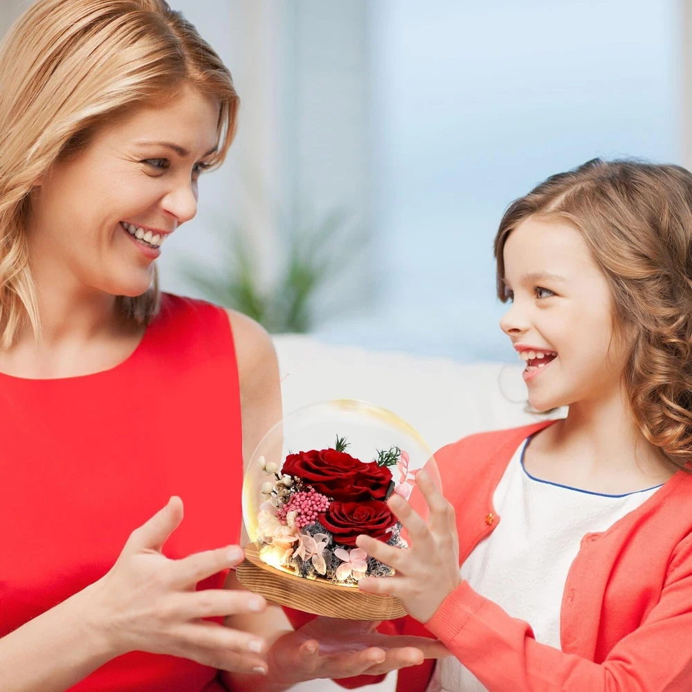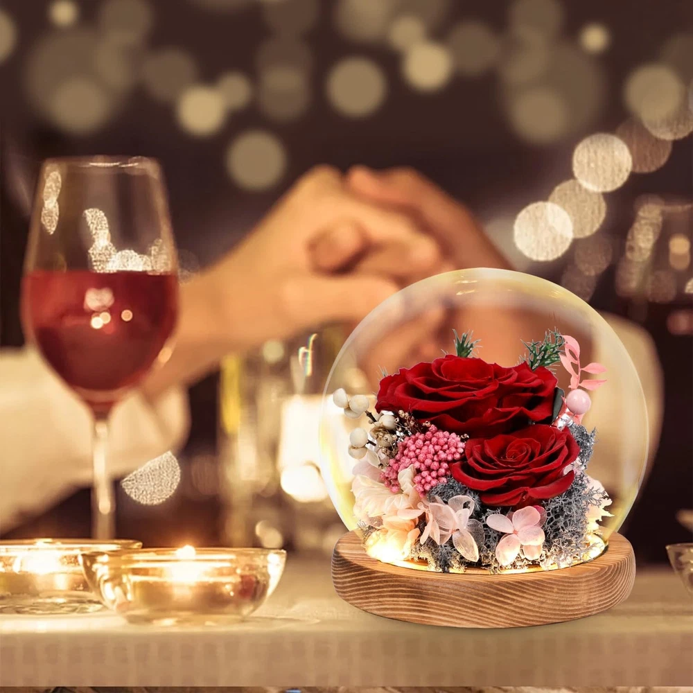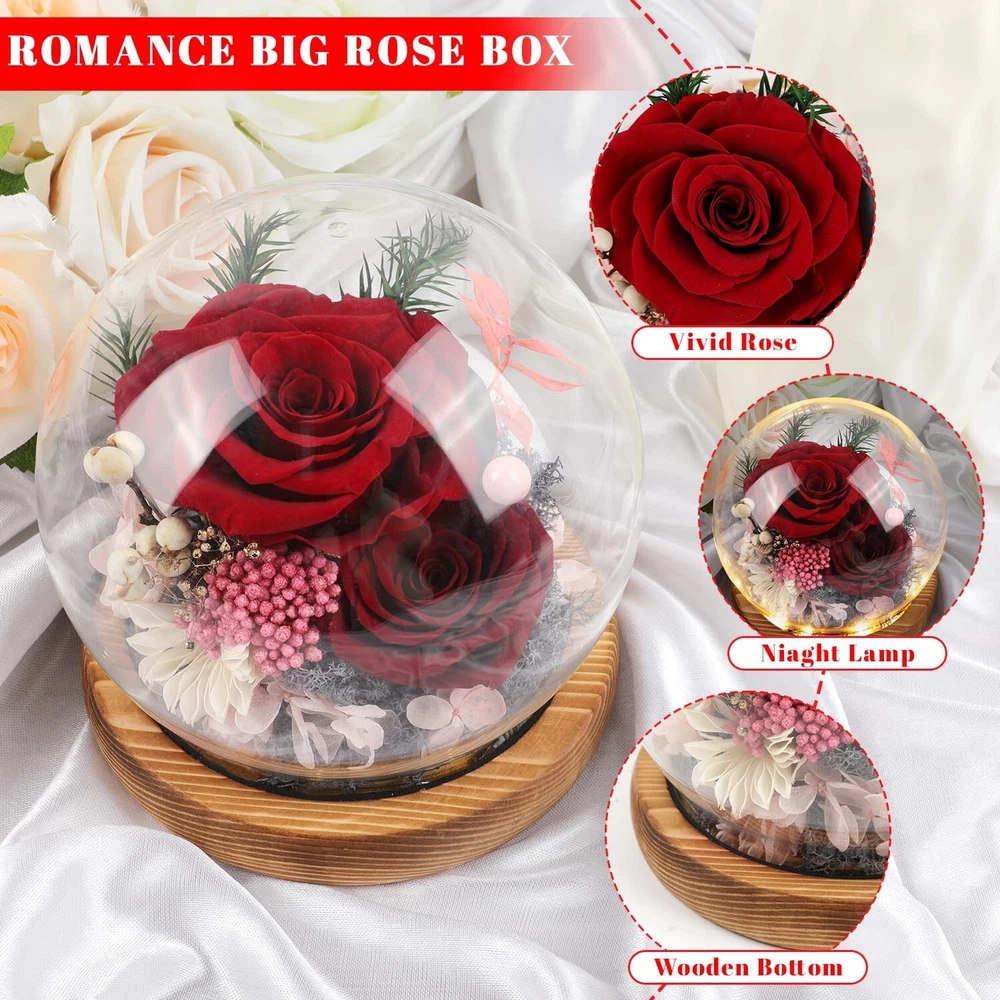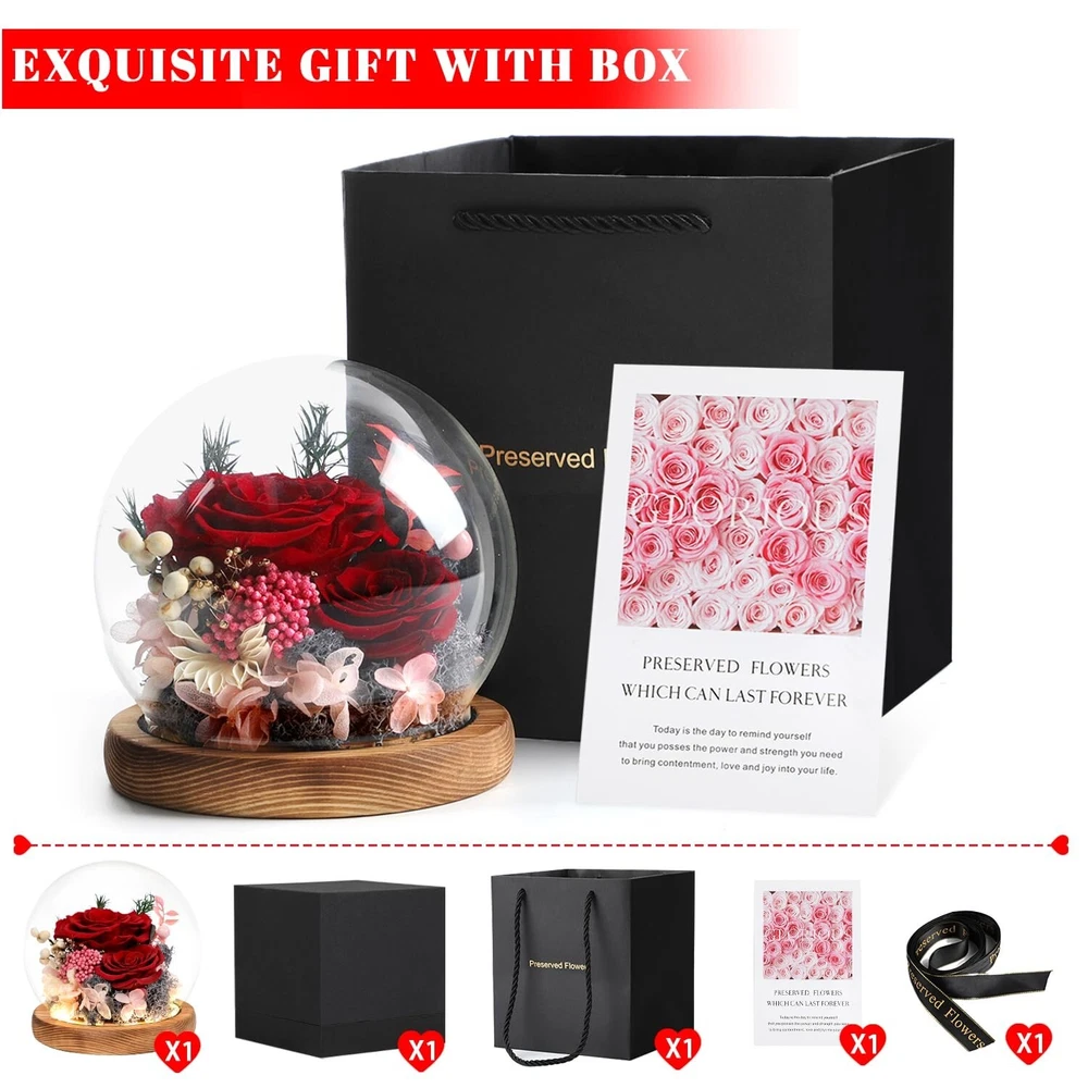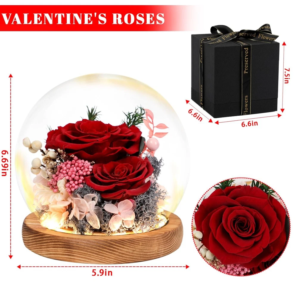 Valentines Day Gifts for Her, Valentine's Day Roses Unique Floral Gift All Occasions for Mom Girlfriend Wife Valentine's Mothers Day Anniversary Wedding Product Details Brand: Erweicet Plant or Animal Product Type: Rose Color: Red Number of Items: 1 Item dimensions L x W x H: 3 x 3 x 3 inches Product Dimensions: 3 x 3 x 3 inches Item Weight: 1.72 pounds Manufacturer: Erweicet Country of Origin: China Item model number: A-YSH Date First Available: October 18, 2023 The Rose box for Women: The red rose dome is made of glass and the bottom is made of solid wood. Through the glass, you can enjoy the elegance of the eternal roses in 360,fully displaying ""Eternal Love"". Can be used as birthday gift,thank you gift,Christmas gift Warm LED String Design: The well-preserved rose flower box in the glass dome will have a beautiful gift box with a size of 6.3 inches * 6.3 inches * 6.3 inches and the bottoms surrounded by LED light trings,which require 3 AAA batteries to power, and the LED strip lights shine through the glass, making them ideal for use at night to create a cozy and romantic atmosphere. Real Floral Gift: This fresh flowers gift suitable for woman to show your love them on Mother's Day,Thanksgiving, Valentine's Day, and Christmas,bridal showers,New Year's Day,anniversaries and so on Service You By Heart And Soul: You will get a real floral gift whit string, a gold and black ribbon, a gift box, each gift box accessories strict quality control, and a number of improvements and selection to ensure customer satisfaction, if you by any doubt, please tell us! Preserved Flower Rose Fresh Flowers Real Floral Gift for Women Birthday Gifts Forever Roses Romantic Gifts for Mom Girlfriends Wife for Birthday Gifts for Women, Mothers Day, Christmas. Flowers for Delivery: Fresh flower gifts for women,moms,and girlfriends. Every rose is fresh, and we use special techniques to preserve it for 3-5 years to maintain its beauty. Each rose is different in size, shape, and color,showcasing natural beauty.Our unique flower arrangement philosophy blends luxury and warmth into elegance The Rose box for Women: The red rose dome is made of glass and the bottom is made of solid wood. Through the glass, you can enjoy the elegance of the eternal roses in 360,fully displaying ""Eternal Love"". Can be used as birthday gift,thank you gift,Christmas gift Warm LED String Design: The well-preserved rose flower box in the glass dome will have a beautiful gift box with a size of 6.3 inches 6.3 inches 6.3 inches and the bottoms surrounded by LED light trings,which require 3 AAA batteries to power, and the LED strip lights shine through the glass, making them ideal for use at night to create a cozy and romantic atmosphere. Real Floral Gift: This fresh flowers gift suitable for woman to show your love them on Mother's Day,Thanksgiving, Valentine's Day, and Christmas,bridal showers,New Year's Day,anniversaries and so on Service You By Heart And Soul: You will get a real floral gift whit string, a gold and black ribbon, a gift box, each gift box accessories strict quality control, and a number of improvements and selection to ensure customer satisfaction, if you by any doubt, please tell us!