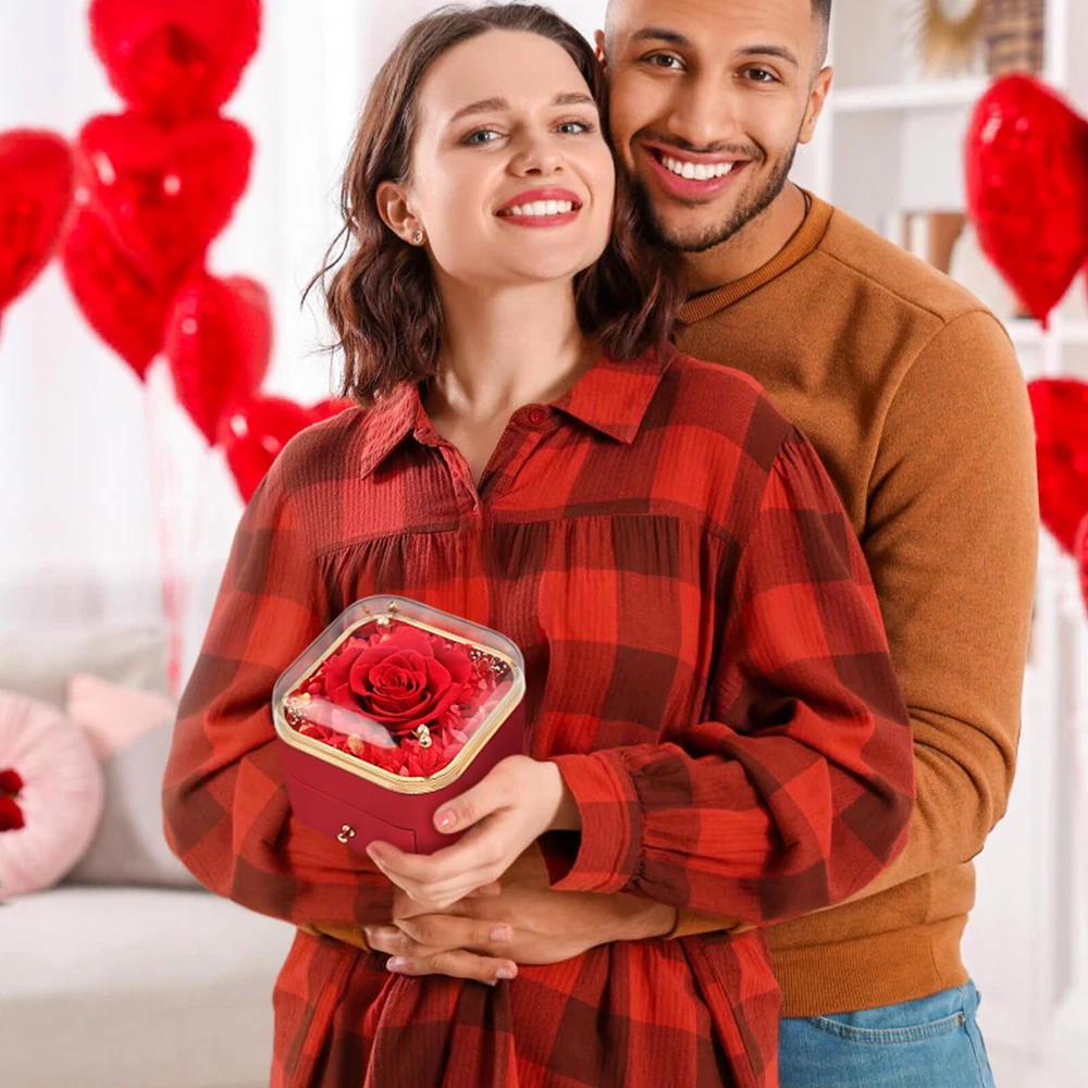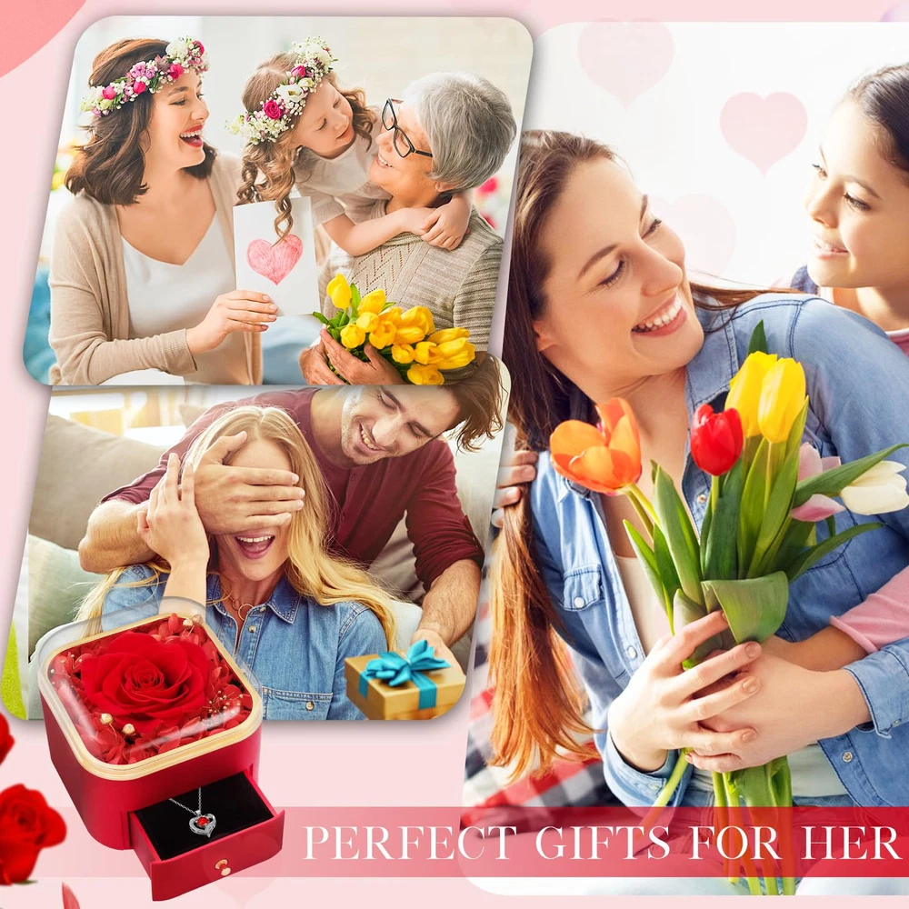 PRESERVED REAL ROSE WITH NECKLACE:Forever Roses are made of high quality real roses with a unique preservation process that never fades, signifying everlasting love. For the upcoming special day, pick one in her favorite color and create more surprises. ETERNAL ROSES GIFTS FOR WOMEN:Luxury Exquisite Set Eternal Rose Gift Box includes Preserved Real Rose 1pc + Rose Gift Box 1pc + Heart Necklace 1pc , Rose Gift Box It can also store other jewelry or rings. Please keep it at room temperature without water or direct sunlight to maintain the quality. VALENTINES DAY ROSES FOR HER:Each glass rose delivered to you is a unique piece of art. Surprise your loved one with a stunning forever rose that will hold memories for years to come. UNIQUE BIRTHDAY GIFTS FOR HER: Uniquely designed heart necklace and long-lasting beautiful forever roses make a well-presented gift. A charming eternity flower and a heart necklace will keep your memories alive for years to come, making this the perfect gift for your mother, wife and girlfriend. PERFRCT GIFTS FOR ANY OCCASION: Exquisite gifts for mom, wife, girlfriend, daughter, grandma, sister, can be given to women as Christmas, Valentine's Day, Birthday ,Thanksgiving, Mother's Day, Anniversary, Wedding or other holiday gifts.