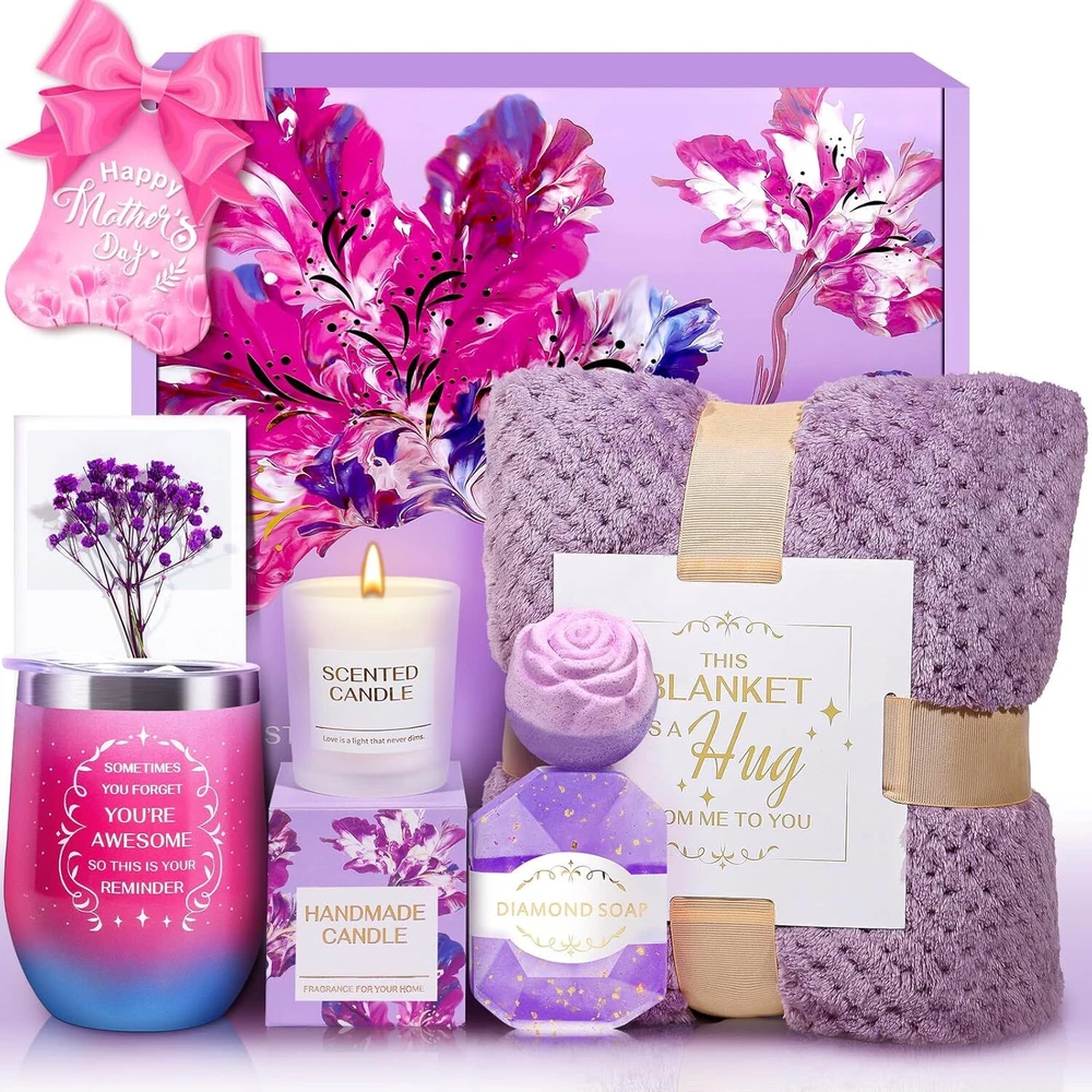 Birthday Gifts for Women, Self Care Gifts, Get Well Soon Gifts, Purple Relaxing Spa Care Package with Luxury Flannel Blanket, Unique Mothers Day Gifts, Mom, Women, Sister, Wife, Girlfriend Unique Gifts for Her – Cozy & Thoughtful Surprises Make this winter season extra special with a beautifully designed gift set featuring a soft purple flannel blanket. This elegant and cozy addition brings warmth and comfort while sending heartfelt winter blessings to the woman you love. Perfect for Mother’s Day, birthdays, or as a thoughtful gift for mom, grandma, daughter, or a dear friend. It also makes an ideal choice for self-care gifts, get-well presents, care packages, and thank-you gestures. 7-Piece Self-Care Gift Set for Women This carefully curated self-care package includes an insulated mug, a lavender-scented candle, a luxurious flannel blanket, a bath bomb, handmade soap, a heartfelt gift card, and an elegant gift box. Whether you want to uplift someone's spirits, show appreciation, or send warm wishes, this set is designed to bring joy and relaxation. Luxurious Get-Well Gift Basket with Flannel Blanket A classic flannel blanket is included, offering the perfect balance of thickness and softness. Lightweight and breathable, it provides year-round coziness—perfect for unwinding after a long day. Whether as a birthday gift, holiday surprise, or a thoughtful gesture, this self-care package is a wonderful way to show love and support. Spa-Inspired Relaxation Gifts for Women Indulge in a luxurious at-home spa experience with lavender-scented bath products, including bath bombs and bath salts made from premium natural ingredients. This set is ideal for anyone who deserves a moment of relaxation—perfect for best friends, moms, sisters, or any woman in need of self-care and pampering. The Perfect Gift for Any Occasion With a beautifully designed floral gift box and carefully selected accessories, this thoughtful gift basket suits various occasions—birthdays, Christmas, Mother’s Day, Thanksgiving, or retirement celebrations. Show your love and appreciation for the special women in your life, whether it’s your mom, wife, grandma, best friend, sister, or neighbor.