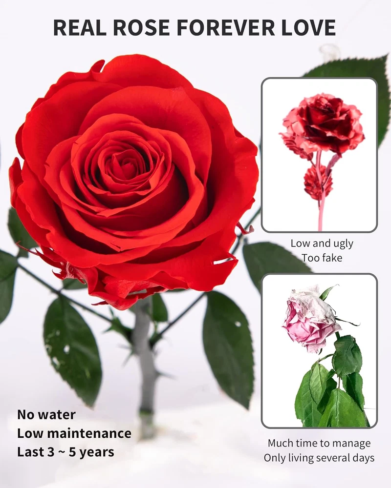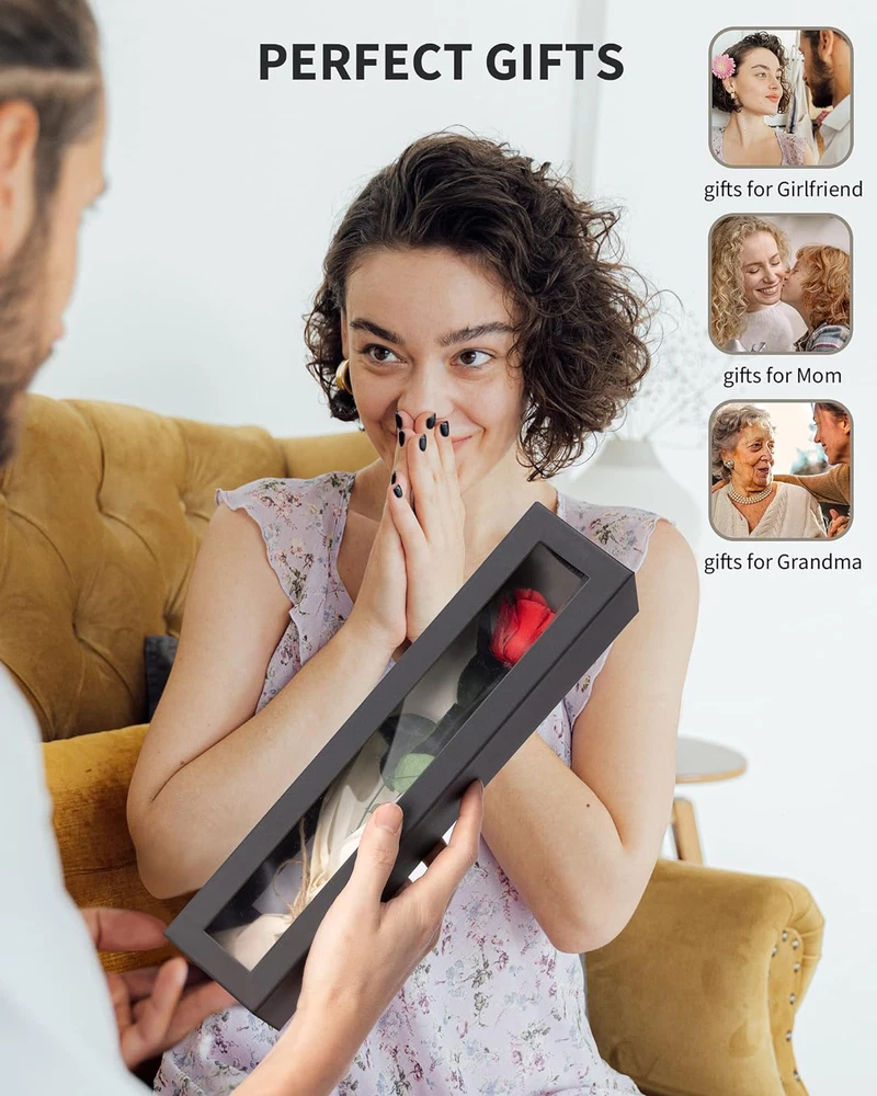 Flower Birthday Gifts for women - Preserved rose is made of nature fresh rose. With a special preservation technique, maintain most of characteristics of beauty when the flowers are at their best, These never withered roses are no need to water and low maintenance, keep fresh at least for 3-5 years. Pick up this rose gifts for women to express your forever love, appreciation and true respect Preserved Real Rose - Artificial roses generally are expense, fading color, and waste. And artificial flower is also not ideal gifts, definitely not real. In comparison, preserved roses are 100% real and natural, produce little to zero waste, appreciated for the sentimental value, and cost-effective. With gorgeous shapes, our flora has an exceptional collection of preserved flowers to ensure that you’re sending only the finest, high-quality real roses to your family and friends Long Stem Single Rose for Women - One rose flower, a symbol of you are the one, special, unique, beautiful way to represent positive, appreciation and true love. Affordable, suiting for every taste. Different color roses preserved are also best home decorations Anniversary Gifts for her - This rose keep longer could be as mom gifts, grandma gifts, girlfriend gifts, wedding gifts, valentines gifts, birthday gifts, mothers' day gifts, anniversary gifts etc. Flowers for delivery prime, roses for delivery prime, giving her surprise as soon as possible Package & Guarantee - No need to spend extra time and money on gift wrapping, while we have prepared an exquisite package. Hurry up,someone is waiting for you. Packages include: 1* preserved red rose, 1* exquisite rose gift box. If you have any questions, please feel free to Product Description Single Preserved Rose | A Deep Expression Of Love Our brand believes in the transformative power of a single flower. Our arrangements bring joy, comfort, and inspiration, strengthening bonds and inspiring courage. Each arrangement is crafted with care and attention to detail, conveying messages of positivity and joy. The video showcases the product in use. The video guides you through product setup. The video compares multiple products. The video shows the product being unpacked. Our Handcrafted Forever Roses We offer a wide variety of flowers in different colors, each with their own special meaning. Our selection includes red, white, black, blue, purple, sky blue, gradient, and many more. Whether you're looking for a symbol of love or a gesture of appreciation, we have the perfect flower for you. Enduring Patience In Mom Mother's Day Gifts for Mom I know we argue, but please know that you are the most essential, the most critical, and the most important person in my life. I couldn’t be who I am without your support and devotion. Thank you for forgiving me when I mess up, and loving me as if nothing had ever happened. I want to hold this eternal rose box to truly appreciate how much you have always done for me. Enduring friendship In Friends Christmas Gifts for Her This Christmas, a gift of eternal flowers for you, my friend. A symbol of everlasting friendship and joy. Wishing you a Merry Christmas! Enduring Commitment Of Life Anniversary Gifts for Wife My dear wife, thanks for being the only support I have ever had and I will ever be needed.You are the best thing that happened to me. You are the best thing that is still happening to me and you are going to be the best thing to happen to me. I don't wait for special occasions like Valentine’s Day, anniversaries, or birthdays to appreciate you. I can't wait to take this long-lasting rose to bring my appreciation to you now. Enduring Surprise For One Birthday Gifts for Mom/Grandma Preserved flowers as birthday gifts offer enduring surprise. They symbolize eternal love and admiration. Delight awaits as they unwrap vibrant petals frozen in time. The gentle fragrance evokes memories of a blossoming garden. This lasting gift reminds them of your affection for years. Its beauty remains unchanged, a significant surprise. Enduring Joy In Tears Valentine's Day Gifts for Girlfriend On Valentines day, this romantic forever roses preserved box gifts set is your elegant gift choice. Pick up the valentines day gifts for her, valentines gifts for her, women valentine gifts, mom valentines day gift, rose valentines day gift, valentines day gift for mom, gift for valentine day for women, rose for valentines day, best valentines day gift for wife, valentine's gifts for her, valentines day roses, let beauty and romance surrounding them. Gifts for Mom Mothers day gifts Gifts for mom Gifts for mom from daughter Gifts for mom from son Gifts for Girlfriend Cute girlfriend gifts Gifts for her Gifts for girlfriend Unique girlfriend gift Gifts for Wife Anniversary gift for her Birthday gift for wife Anniversary for her Birthday gifts for women Gifts for Grandma I love you gifts for her Grandma gifts Gifts for women Mom birthday gifts Christmas Flowers Decoration Unique Christmas Gifts For Mom From Daughter To Brighten Up this holiday Preserved Floral Elegance for Dining Adding enduring elegance to your dining experience Timeless Beauty on Your Office Desk Boost your productivity and add charm to your workspace Forever Blooming on Your Bedside Table Wake up to the beauty of everlasting flowers adding a touch of serenity to your bedroom Preserved Floral Elegance for Dining Adding enduring elegance to your dining experience Listen To Different Voices SofLiv Single Rose Family Add to Cart Add to Cart Add to Cart Add to Cart Add to Cart Add to Cart Add to Cart Customer Reviews 4.4 out of 5 stars 748 4.4 out of 5 stars 748 4.3 out of 5 stars 76 4.4 out of 5 stars 748 4.4 out of 5 stars 748 4.4 out of 5 stars 748 4.4 out of 5 stars 748 Price $11.99 $ 11 . 99 $22.99 $ 22 . 99 $21.99 $ 21 . 99 $30.99 $ 30 . 99 $49.99 $ 49 . 99 $49.99 $ 49 . 99 $16.99 $ 16 . 99 SofLiv New Product ✘ ✔ ✘ ✘ ✘ ✘ ✘ Product Type Preserved Rose Flower Preserved Rose Flower Flower Vas