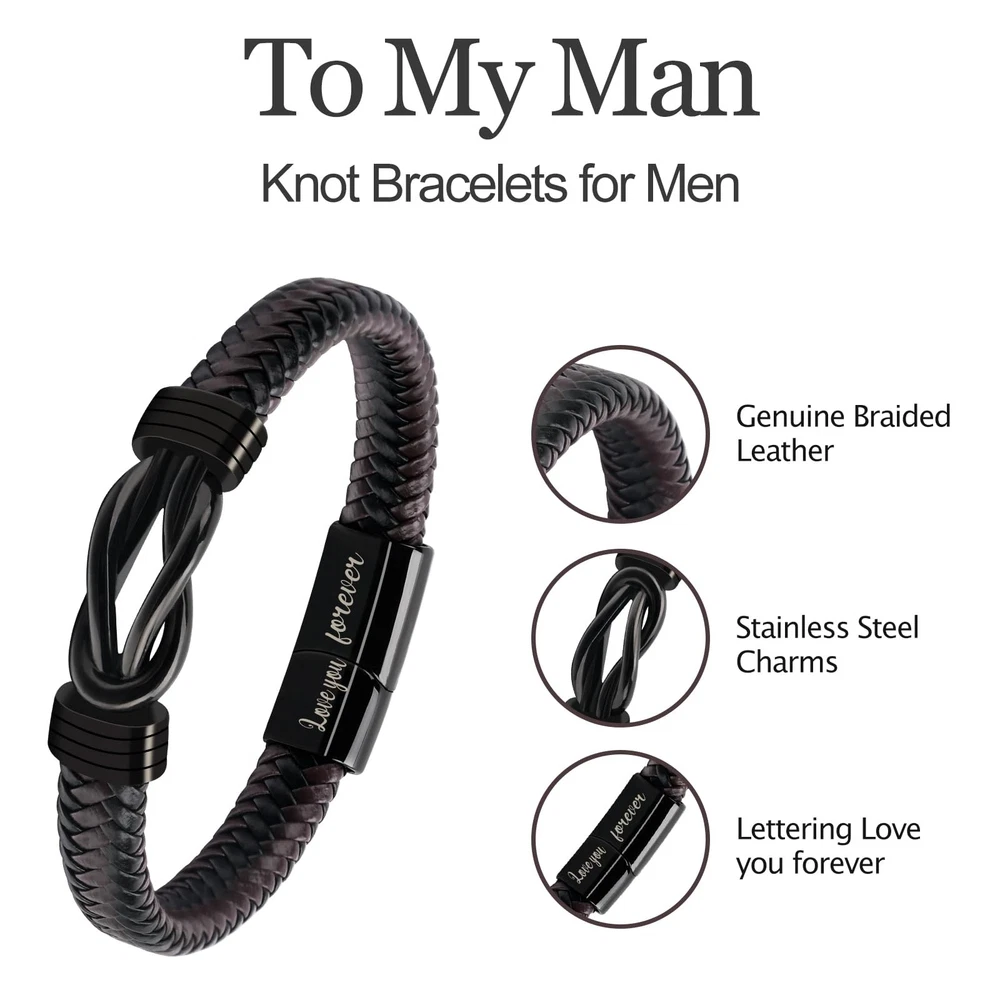 Valentines Day Gifts for Him: Bracelets Gifts for Men Leather Couples Bracelets Anniversary Romantic Gifts for Boyfriend Husband from Wife Valentine's Birthday New Meaningful Valentines Day Christmas Anniversary Gifts for Him Husband Boyfriend:Our knot bracelet means always linked together, and lettering love you forever can directly express your love for him, no matter when, no matter where. Valentine’s Day Ideal Gifts Bracelet for Men:The Leather bracelet for men comes with a designed wish card and a pretty box, Ready to treat your man him boyfriend husband for Birthday, Anniversary, Valentine’s Day,Sweetest Day, Christmas,Stocking Stuffers,Wedding,Holiday and galentines day any special occasion gifts or just a surprise to remind that special one how much you care. Materia and Size:Our knot bracelet is made of superior braided leather and stainless steel charms, so the men leather bracelet is soft durable and comfortable.Our bracelet is 8.5inches and the length can fit most men to wear. How To Wear: Using two opposing forces,you can open it gently.Mens bracelet perfect gifts for men, him, boyfriend, husband, the bracelet has a novel style that never goes out of style. To My Man-"WHEN YOU WEAR THIS PROMISE BRACELET ALWAYS REMEMBER.WHEREVER THE JOURNEY TAKES US. I WANT US TO GO THERE HAND IN HAND.YOU ARE THE ONE I WANT TO BE WITH.THIS IS THE RELATIONSHIP I WANT TO BE IN. AND THIS IS THE LOVE I WANT TO LAST FOREVER.I Love You"The card printed saying you will always be there for him and love him forever. Shipping We offer FREE shipping on all orders! We ship within Three business days of payment, usually sooner. We use a selection of shipping services such as UPS, FedEx, USPS etc. We only ship to the lower 48 states, no APO/FPO addresses or PO Boxes allowed. Local pickups and combined shipping options are not provided at this time. Return You can return a product for up to 30 days from the date you purchased it. Any product you return must be in the same condition you received it and in the original packaging. Please keep the receipt. Payment We accept payment by any of the following methods: PayPal Please pay as soon as possible after winning an auction, as that will allow us to post your item to you sooner! Feedback Customer satisfaction is very important to us. If you have any problem with your order, please contact us and we will do our best to make you satisfied. Contact Us If you have any queries, please contact us via ebay. We usually respond within 24 hours on weekdays. Please visit our eBay store to check out other items for sale! Thank you for shopping at our store.