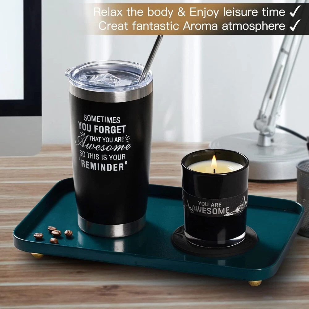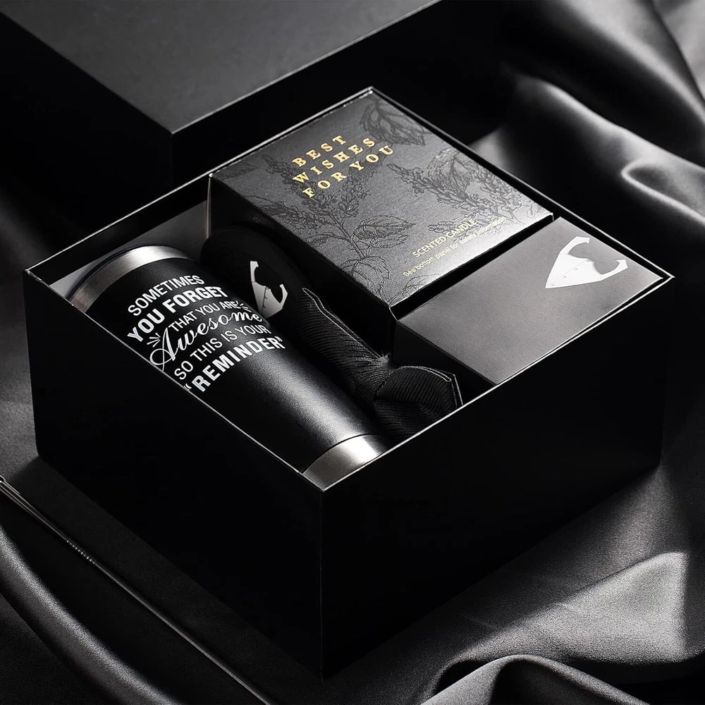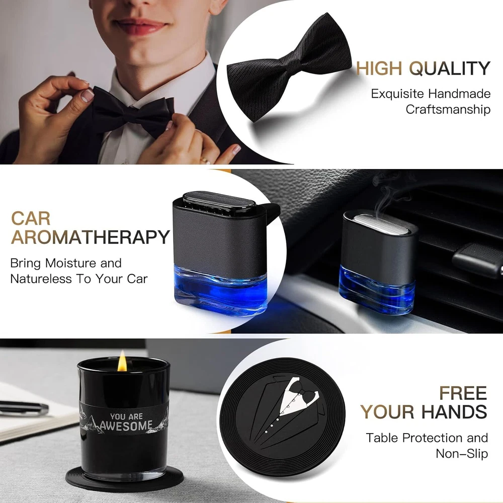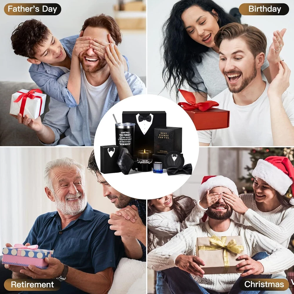 < ul >< li >πγ PREMIUM MENS GIFTS γ Our gifts for men unique is gift packaged ready . The entire things come in the high - quality beautifully gifts basket box packaged in a better way with protective padding inside to withstand any possible damage or bending in transit . This curated gift box is sure to make that special gentlemen in your life feel cherished and loved . < li >πγ VALUE BIRTHDAY BOX FOR MEN γ 6 pieces happy birthday gift box , each birthday gift baskets for men contains : 1 x insulated stainless steel wine tumbler , 1 x exquisite Bowtie , 1 x Coaster , 1 x soy wax teak tobacco scented candles , 1 x car aromatherapy , 1 x Soap , 1 x gift box . It ' s a perfect men birthday gift ideas for Best Friends , Grandpa , husband , father , son , boyfrend , coworker or any man you care . < li >πΉγ HIGH QUALITY GIFTS PACKAGE γ Every item in our gift box is all made of quality materials . Great quality vacuum insulation tumbler is made from 18 / 8 stainless steel which is double - wall design , durable , resistant to stains and unbreakable . You could use the tumbler to drink coffee , juice , wine everyday . It ' s a thoughtful gifts for people who use it . And comes with uniquely designed cup holders , these silicone coasters do not create a vacuum effect when lifting . < li >πΊγ UNIQUE BIRTHDAY GIFTS FOR HIM γ Made with pure plant essential oils and 100 % natural soy wax , this scented candle for men is non - toxic , smokeless and burns evenly . Stylish , unique , and high - quality , this bow tie is a true must - have . This cold - pressed bar soap is made with natural essential oilsbased cleanser to gently cleanse and hydrate skin . Car Air Freshener with carefully selected high - quality ingredients . It is a unisex fragrance that adds a touch of sophistication to any place or time . < li >π₯γ MEMORABLE GIFTS FOR ANY OCCASIONS γ This gift set for men has been curated with thought and care to create the most special moment and help to make their day a memorable one . for the gentlemen in your life . Whether it ' s for a recently birthday or soon to be man birthday party , our birthday gift box including everything in the box is your perfect idea , it ' s a special gift box for men which is perfect for birthday , wedding , anniversary , valentine ' s Day , Christmas , fathers day gifts and more . < br >< div > < div > < h2 > Product Description < div > < div > < div > < h3 > PREMIUM MENS GIFT < h3 > Are you struggling to choose unique gift set for men , dad , husband , boyfriend , son ? < ul >< li >< span > This funny gift basket for men is a thoughtful gift for any celebration . < li >< span > When he receive the mens gifts he will deeply feel your love ! < li >< span > You will never regret choosing this as a gift for the important men in your life . That Would Remind Him of you every time when he uses the mens gift . < div > < div > < div > < div > < div > < br > < div > < div > < p > It ' s also an excellent way to show your love and appreciation for men who have everything < div >< div > < ul > < li >< span > < span > Father ' s Day Gifts for Dad < li >< span > < span > Birthday Gifts for Men < li >< span > < span > Christmas Gifts for Men < li >< span > < span > Valentines Day Gifts for Men < li >< span > < span > Retirement Gifts for Dad < div > < h3 > Personalized Gifts for Men for any occasion < p > The personalized men gift set is perfect for Father ' s Day , birthday , Christmas , Halloween , Valentines Day , Easter , Thanksgiving Day , anniversary celebrations and retirement < div > < div >< div > < ul > < li >< span > < span > YOU ARE AWESOME Pattern : " SOMETIMES YOU FORGET THAT YOU ARE AWESOME SO THIS IS YOUR REMINDER " < li >< span > < span > YOU ARE AWESOME Pattern : " SOMETIMES YOU FORGET THAT YOU ARE AWESOME SO THIS IS YOUR REMINDER " < li >< span > < span > 1 . Premium quality tumbler double - wall design 2 . seamless smooth and resistant 3 . BPA - free lid < li >< span > < span > Scented candles : < li >< span > < span > 1 . 100 % natural soybean and a cotton wick 2 . Capacity 12 . 9oz 3 . Up to 40 hours burning 4 . Safe and non - toxic , without black smoke < div > < div > < h3 > GIFTS BOX Included : < h3 > CANDLES / GIFTS COLLECTION < p > At , we work hard to create the best products possible at prices that are as low as possible . We believe everyone can enjoy a life of happiness and abundance , and we β re here to help you chart your own joyful path . < ul >< li >< span > Embrace positivity and begin your journey toward the life of your dreams today !