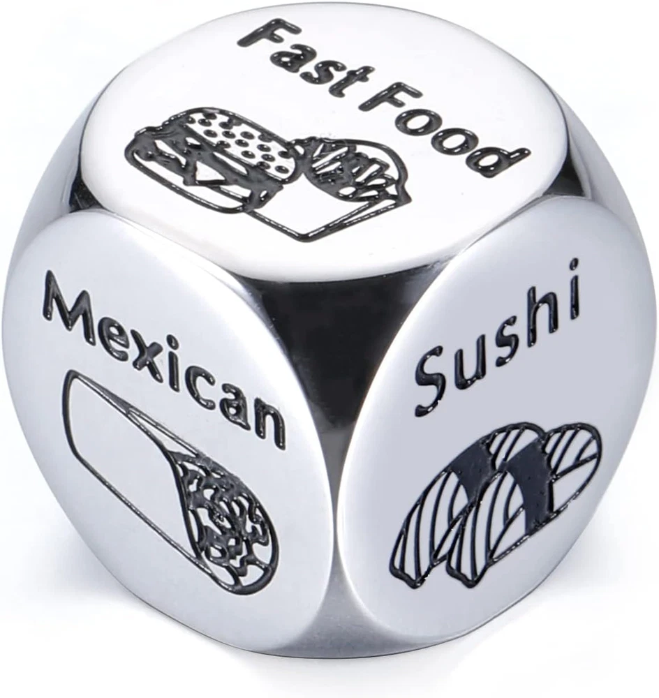 ❤Valentines Day Gifts for him her: This Valentine's, end gift stress with the Food Choice Dice! Roll it to decide where to eat, what to cook. It's more than a dice—it's a playful companion for food-loving couples, making every meal a shared surprise. Valentines Day Gifts for her, Valentines Day Gifts for him, Valentines Day Gifts for boyfriend, Valentines Day Gifts for girlfriend, Valentines Day Gifts for couples, Valentines Day Gifts for wife, Valentines Day Gifts for husband! ❤Valentines Day Gifts for Women Men--Can't decide on a Valentine's gift? Let our Food Choice Dice make the decision deliciously fun! A simple roll picks your next food adventure—from takeout to homemade dinners. It's a unique, interactive gift that turns ordinary nights into romantic culinary experiences! Perfect valentines present for him, valentine gift for him, valentine for him gift! Valentines Day Gifts for sister, Valentines Day Gifts for friend, Valentines Day Gifts for mom! ❤Funny Date Night Gifts for Couples--Do you often have trouble deciding what to eat with your partner on your date night? Roll this food decision dice and let it solve your troubles! Funny valentines day gifts for boyfriend girlfriend husband wife sweetheart, wedding gifts for couple, anniversary gifts for her him, engagement gifts for couples, birthday gifts for girlfriend boyfriend, couple gifts, boyfriend gifts, girlfriend gifts, bridal shower gifts. Just roll the dice and enjoy your night! ❤Anniversary Gifts for Him Her--Racking your brain and not knowing what to eat tonight, throwing the problem of the century to your significant other? No! Just use this funny food decision dice! Perfect wedding anniversary gifts for couple, 1 year anniversary gifts for boyfriend girlfriend, anniversary gifts for husband wife, fathers day gifts for husband boyfriend, fathers day gifts from wife girlfriend, sweetest day gifts for her him fiance fiancee groom bride sweetheart soulmate partner. ❤11 Year Anniversary Gifts for women men--Funny food decision dice to solve your daily problems--What to Eat Today? And steel represents the strength and resilience of a marriage, it is a traditional anniversary gift, which symbolizes your eleven years of marriage strong as steel. This cute stainless steel food dice makes best 11 year anniversary gifts for him her to celebrate your 11th wedding anniversary. Funny 11th anniversary gifts for him her, steel anniversary gifts for 11th anniversary. Product description Couple Gift Idea! Funny Valentine's Day gifts! The video showcases the product in use. The video guides you through product setup. The video compares multiple products. The video shows the product being unpacked. Valentines Day Gifts for Him Her Merchant Video This Valentine’s, let our stainless steel Food Choice Dice plan the romance for you! Roll for dinner ideas, sweet treats, or cozy cooking nights. Chic, durable, and full of surprises, it’s the unique gift that turns indecision into delicious connection. A meaningful gift for Valentine’s and beyond! Discover More Gifts for Your Loved One