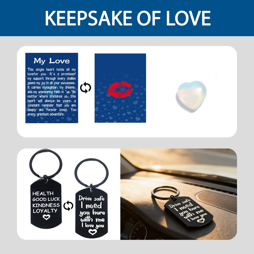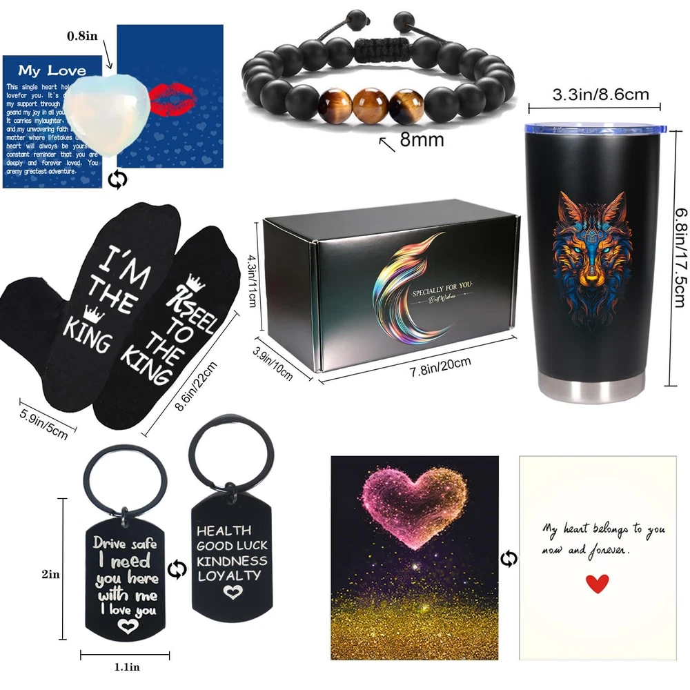 Valentines Day Gifts for Him Men Boyfriend, Unique Birthday Gifts for Husband, Funny Wedding Anniversary Romantic Gifts for Men 【Valentines Day Gifts for Him】This gift set is more than just items—it’s a sweet whisper of your love, a tangible way to tell him how much he means to you on Valentine’s Day, anniversary, birthday or any special moment. 6pcs gift set includes tumbler, bracelet, keychain, socks, opal heart, greeting card 【Exclusive King-Themed Flirty Socks, Ignite the Spark of Intimacy】 The socks printed with the slogan "I am the king, kneel to the king" add a bold and teasing hint to your intimate moments, filling the atmosphere with ambiguous interaction that makes him instantly understand your subtle thoughts and heightens the heat between you 【The symbol of eternal love in protein stone hearts】 - This set features a delicate protein stone heart, symbolizing unbreakable love and commitment. Paired with a message card full of love, let the information it contains speak for you, expressing your deep love for your boyfriend/husband, It’s a timeless keepsake he’ll cherish forever. 【Premium 20oz Wolf Tumbler】Made of food-grade 304 stainless steel, this double-walled vacuum-insulated cup keeps drinks cold for 24 hours and hot for 12 hours. Featuring a bold wolf design and the quote “My other form is even wilder,” it adds rugged style to every day, travel, or adventure. 【Warm Hearted Keychain】A double-sided keychain engraved with heartfelt messages. One side reads “Drive safe, I need you here with me. I love you,” and the other “HEALTH, GOOD LUCK, KINDNESS, LOYALTY.” It’s a daily reminder of your care, keeping your love close wherever he goes. 【Natural Tiger Eye Stone Bracelet】 - Crafted with 8mm genuine tiger eye stones and black matte agate, the bracelet features a adjustable drawstring design for comfortable wear on most wrist sizes, symbolizing courage and protection.