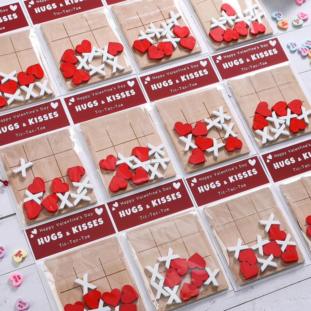 Package includes 12 Valentines Day Cards, 12 Wooden Tic Tac Toe and 12 clear bags.Cards Size 7.3x4.9 inch. Valentine's Day tic-tac-toe set is crafted from quality beech wood, The smooth, solid wood offers a premium tactile experience, making it stand out from ordinary plastic gifts. Each card is printed with Valentine’s Day-themed sayings related to tic-tac-toe,spreading friendship among children.The cards also have a space for kids to write their own name, adding a interesting touch to Valentines Day. Featuring red heart and white "X" game pieces, this set is visually delightful, capturing the spirit of Valentine's Day with love and hugs. Whether it’s a preschool party, school exchange, or family gathering, this Valentine’s gift Tic Tac Toe set suits all occasions, making it perfect for boys, girls, and toddlers to share and enjoy.