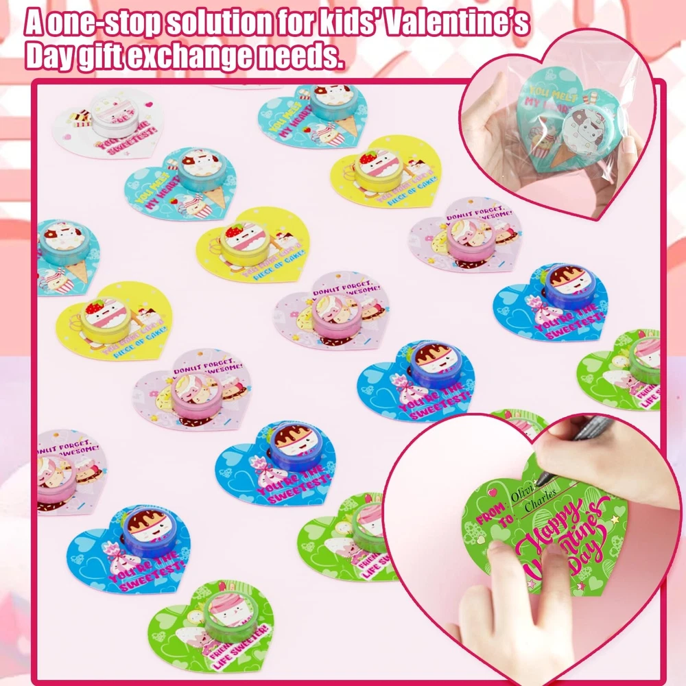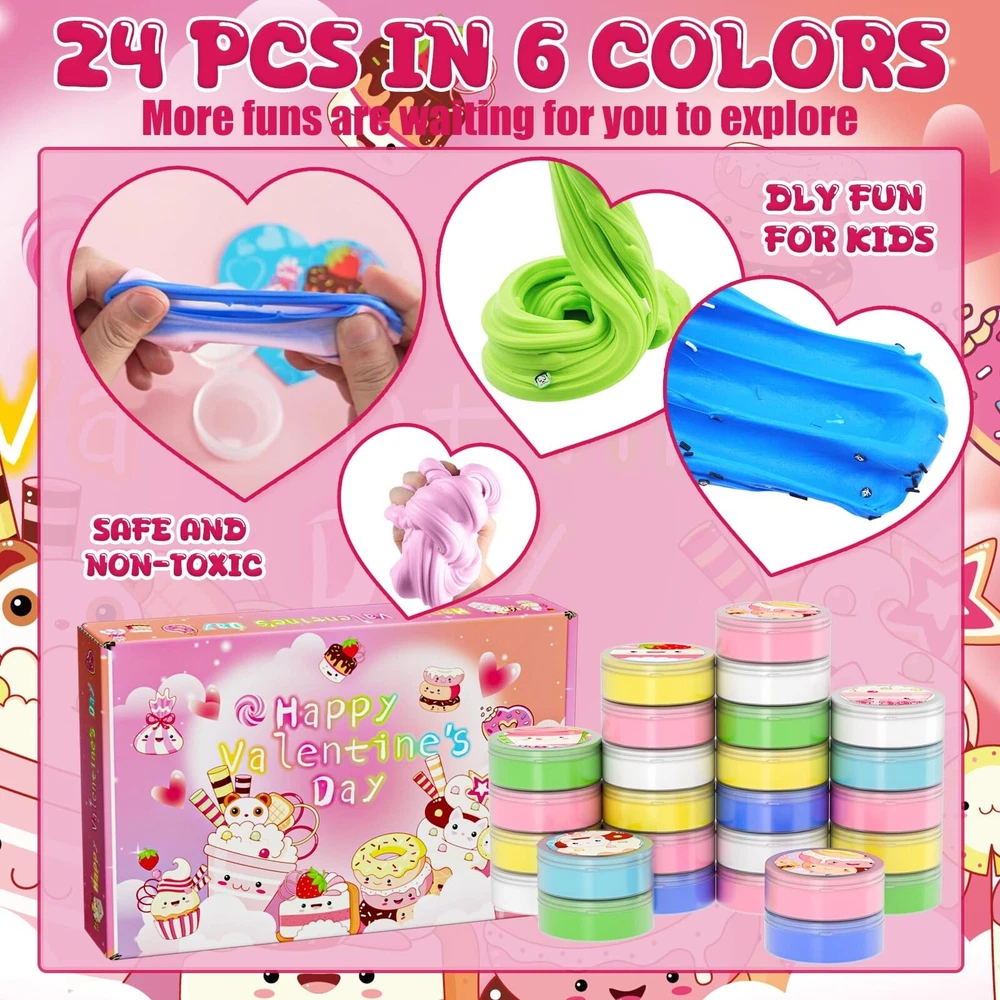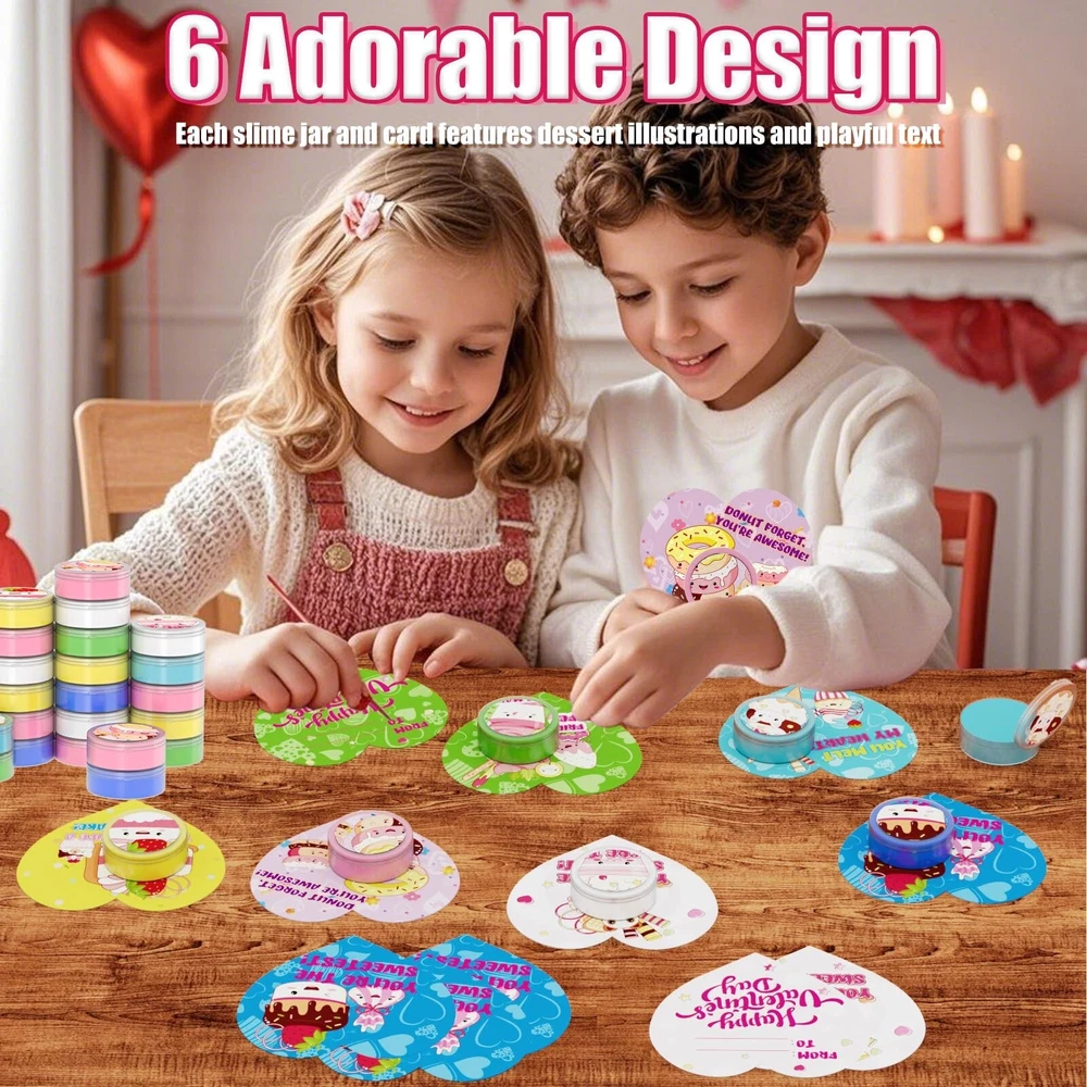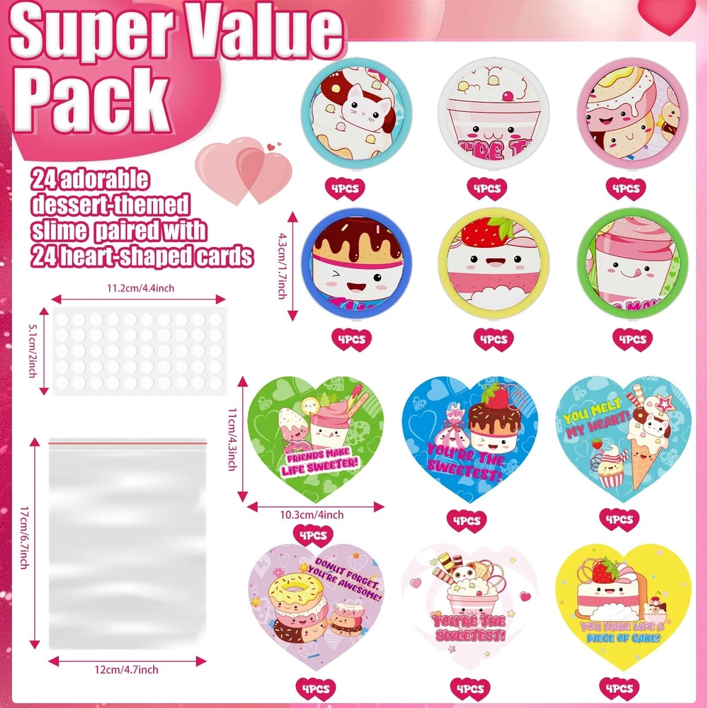 Valentines Day Gifts for Kids, 24 Valentines Ice Cream Butter Slime Card Bulk, Valentine Exchange Cards for Girls Boys School Class Classroom Party Favors Age 3 Year and Up Product Details Color: Red, Pink, White Material: Polyvinyl Alcohol (PVA) Brand: Funewest Theme: Love Item dimensions L x W x H: 11 x 6.1 x 2 inches Occasion: Valentine's Day Manufacturer: Funewest UPC: 708436958147 Age Range (Description): Kid Product Dimensions: 11 x 6.1 x 2 inches Item Weight: 1.32 pounds Country of Origin: China Manufacturer recommended age: 3 years and up Super Value Pack- 24 adorable dessert-themed slime jars paired with 24 heart-shaped cards, and DIY tools (bags and adhesive dots). A one-stop solution for kids' Valentines Day gift exchange needs. 6 Adorable Design- Each slime jar and card features dessert illustrations and playful text (e.g., Donut Forget, Youre Awesome!), adding fun and warmth to Valentines Day. DIY Fun for Kids- The soft, stretchy, squeezable, swirly, and poppable slime can be paired with heart-shaped cards to create unique sweet gifts, sparking kids creativity. Valentine's Day Gifts for Kids- Perfect for classroom exchanges, preschool or elementary school parties, or any Valentines event! Safe and Certified- Non-toxic materials, meeting multiple international safety standards for parents peace of mind. If (valentines day cards for kids school) don't meet your expectations, let us know