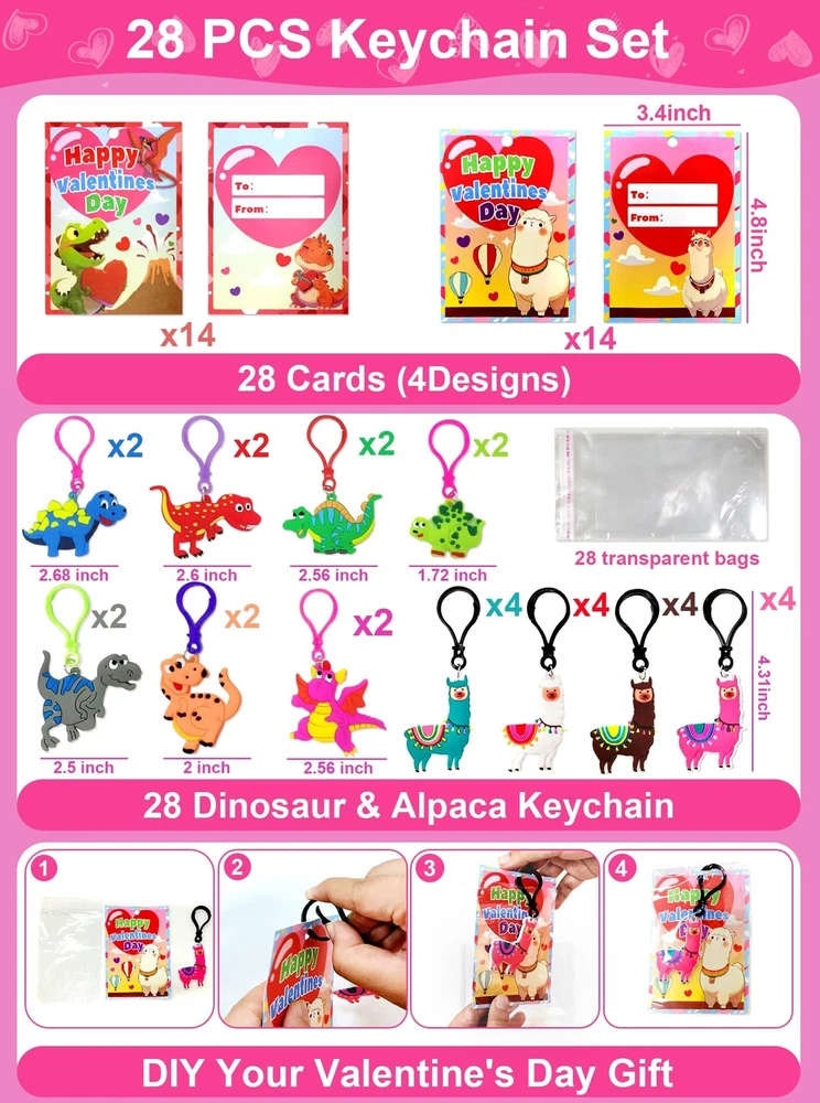 Valentine's Day Gifts for Kids - 28 Pack Alpaca & Dinosaur Keychains Set with Heart Theme Kids Valentines Cards School Exchange, Classroom Prizes, Valentines Party Favors Product Details Color: Colorful Material: Polyvinyl Chloride (PVC) Brand: Dealot Theme: Valentine's Day Decorations Item dimensions L x W x H: 1 x 1 x 1 inches Occasion: Classroom Prizes, Party Goodie Bag Fillers, Valentine's Day Decorations Manufacturer: EZY-TJ-VG25YK28-1 Age Range (Description): Kid Product Dimensions: 1 x 1 x 1 inches Item Weight: 9.9 ounces Country of Origin: China Manufacturer recommended age: 12 years and up Department: mens Animal Keychain Valentines for Kids Class: You will receive 28 animals,which is 14 of dinosaur and alpaca ,28 animals theme cards. It's bright colors,novel and exquisite pendant charms are suitable for your different decoration use.Perfect Valentines Day gifts for kids Unique Design: Our animals keychain pendant are very realistic and cute, it contains dinosaur and alpaca design! You can use them to decorate your kids' birthday parties, creating a cute environment and joyful atmosphere, bringing more happiness to them. Very mini, easy to put in a candy bag. Funny animals keychain Valentines for kids High-quality Materials: These backpack animals squishy keychains are made of premium rubber, highly flexible, preventing easy breakage for safe carrying. It can be easily hung on the key as a keychain, also can be hung on your backpack as an adorable decoration Widely Use: These animals keychains make excellent decorative accessories for backpacks, wallets, cell phone straps, and other personal items, allowing you to add a touch of personality and style. Can be used as party favors or event favors,Valentines Day gifts decorations Surprise Fun Valentine's Day Gifts: With these animal keychains, your kids can dress up themselves or decorate jungle animal party for more joy; These animal keychains can also be applies as gifts for your kids' friends or guests children, even as classroom rewards for students Feature: -These animal birthday party favors keychains are suitable for birthday party, game theme party and other related parties, this varied party favors supplies can meet your various occasion needs and bring joy for your carefully prepared party -These farm animal shaped keychains are favored for boys or girls, and you can decorate your schoolbags, backpacks, wallet and so on. And they are good favors for parties, classmates gatherings, daily life, going out for dating, etc Package includes: 14 x dinosaur keychains 14 x alpaca keychains 28 x animals theme cards 28 x transparent bags Size: card 3.44.8 inch Keychain: Alpaca: 1.624.31 inch Rose + yellow dinosaur: 2.564.37 inch Orange dinosaur: 24.45 inch Red dinosaur: 2.63.43 inch Dark green dinosaur: 2.563.43 inch Gray dinosaur: 2.53.66 inch Blue dinosaur: 2.683.58 inch Light green dinosaur: 1.753.35 inch Material: PVC Color: colorful NOTE There might be a little color difference due to the monitor, camera or other factors. Please understand. Manual measurement, please allow 0.3inch error.