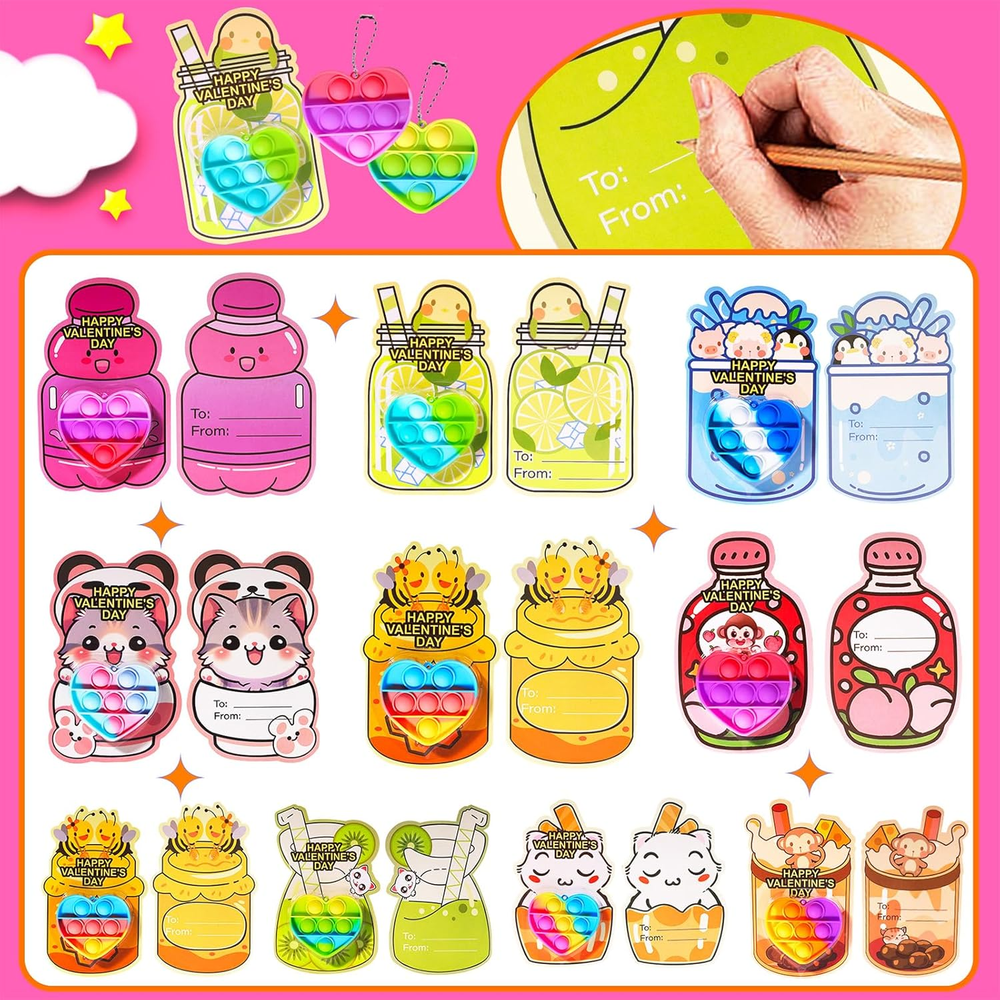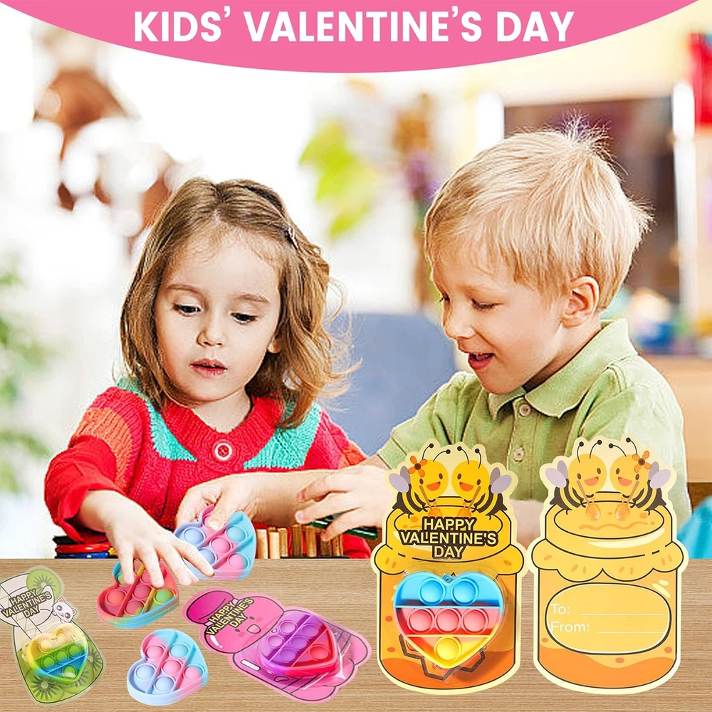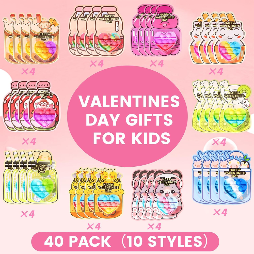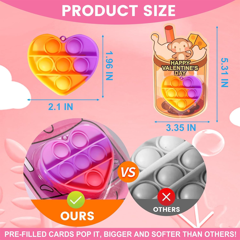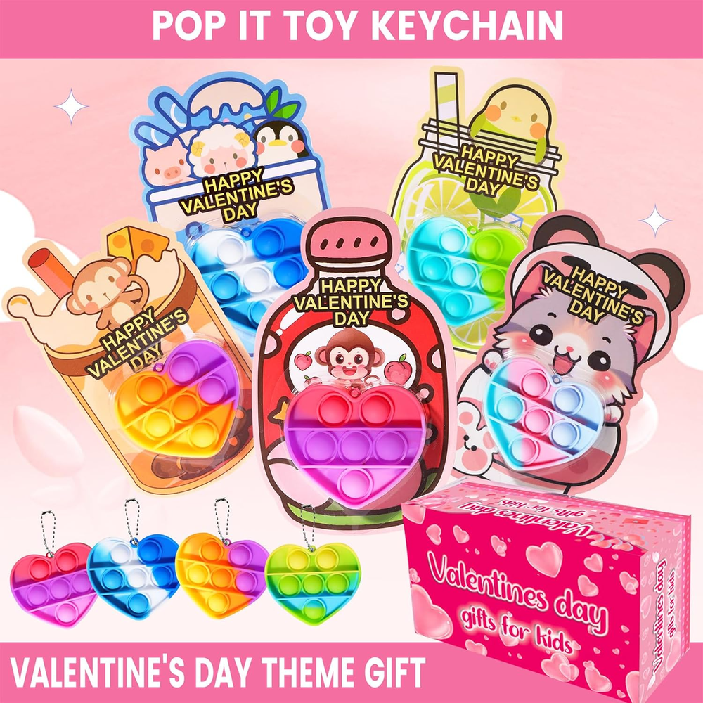 40PACK VALENTINES DAY GIFTS: This valentines day gifts contains 40 x pop it keychains and 40 x valentines day cards. Each color mixing toy color echoes the card color. Ideal valentines day gifts for kids. SAFE & NON-TOXIC MATERIALS: Each product is made of child-friendly materials and the toys are nationally CPC safety certified to ensure compliance with U.S. safety standards. Ensure a safe and joyful Valentine's Day for the kids. PRE-FILLED VALENTINES HEART POP IT: Our Valentine's Day toy cards are pre-filled and designed to save you time wrapping gifts by eliminating the need to purchase additional cards or toys. Making it easy for you and the kids to enjoy a fun-filled Valentine's Day. PERSONALIZED VALENTINE DAY CARDS: The back of the card is designed with a special “FROM” & “TO” section where kids can write their names and share the joy of Valentine's Day. The personalized design makes children feel more involved in the holiday. VALENTINE PARTY FAVORS FOR KIDS: These Valentine's Day themed sets are perfect for classroom exchanges, school Valentine's activities, elementary gatherings, and as Valentine's party gifts, add fun and creativity to any event. Product Description
