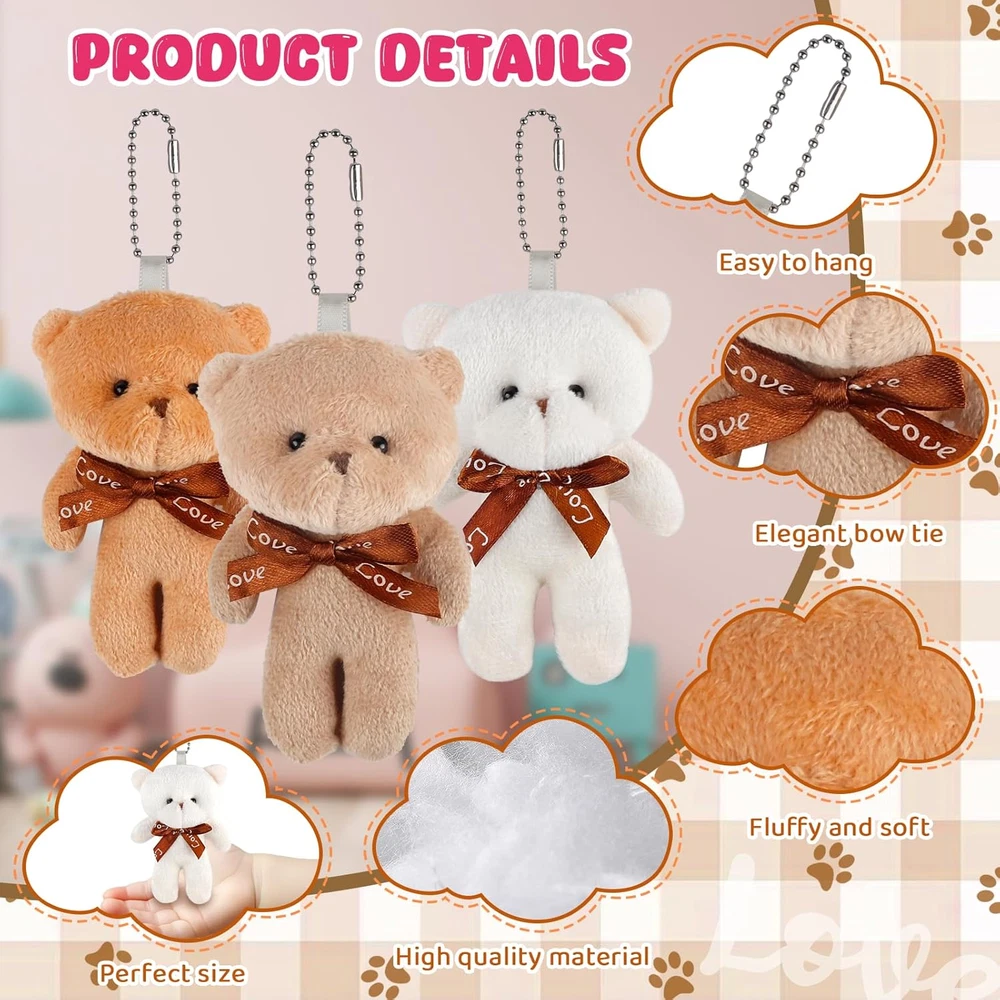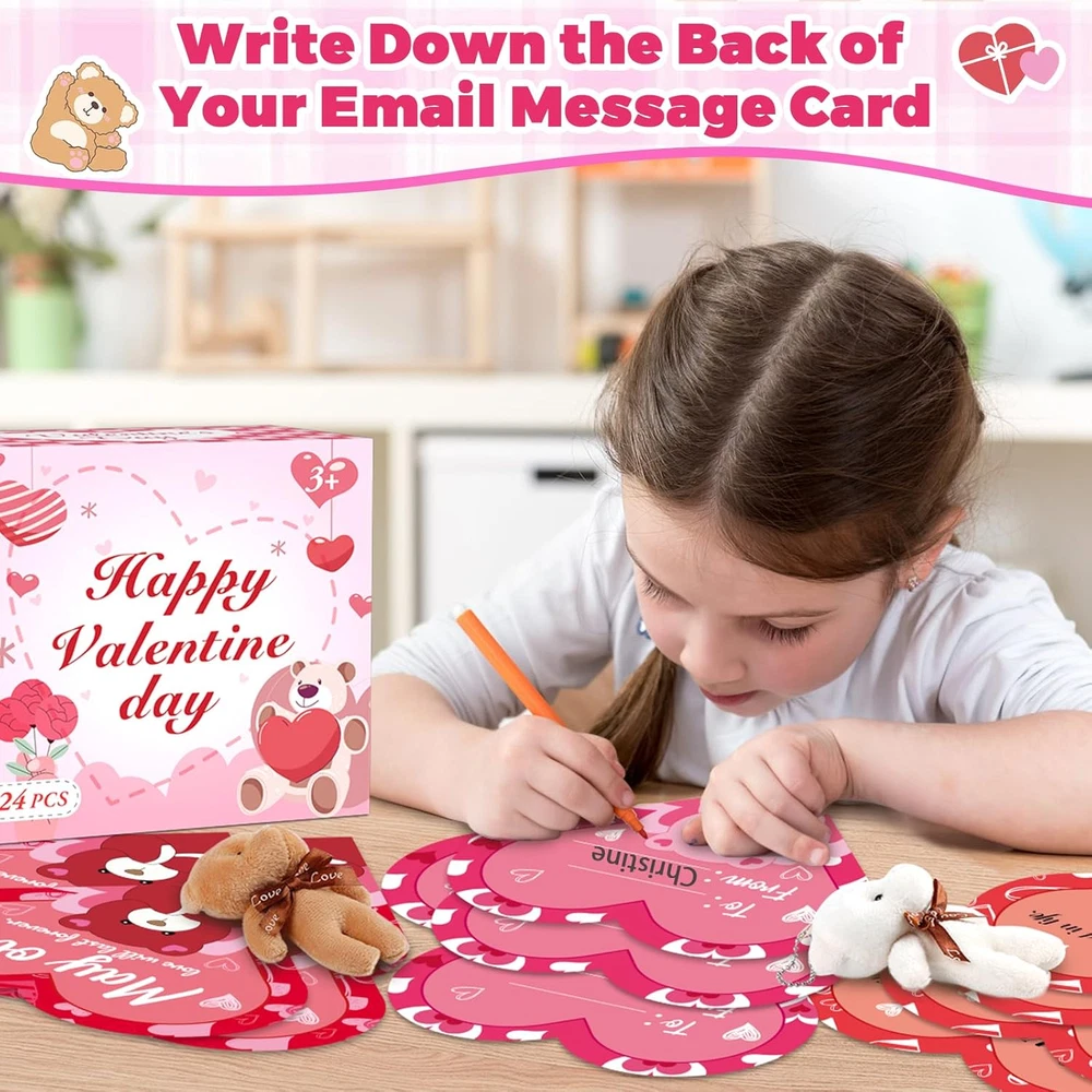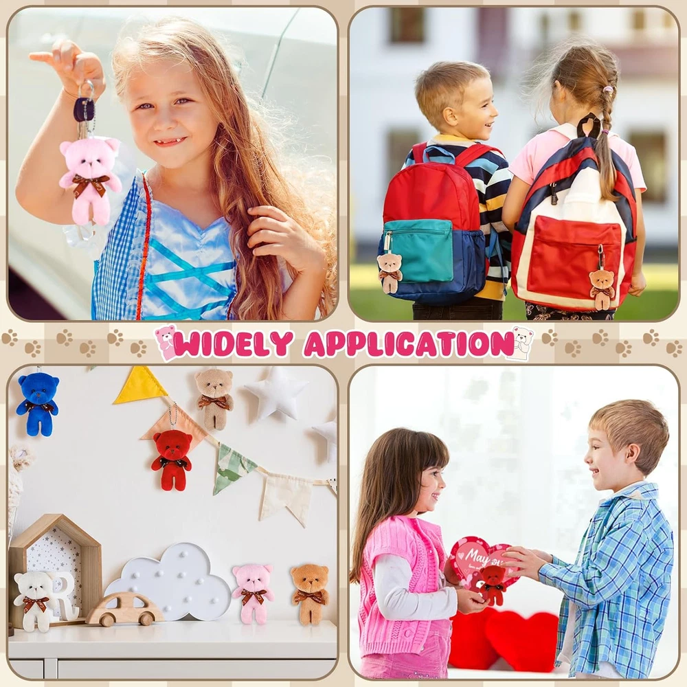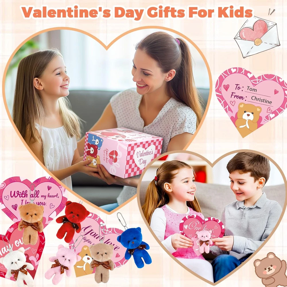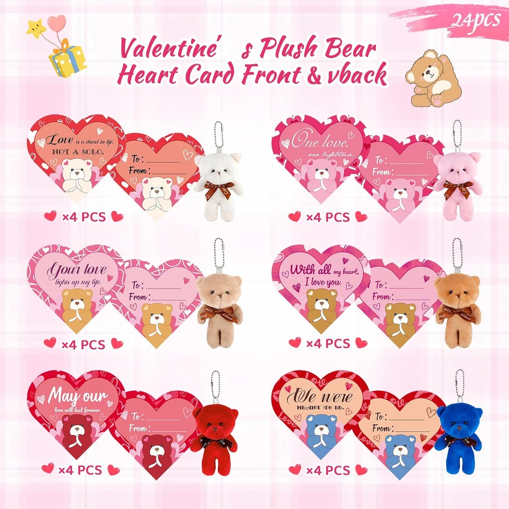 Unique Valentines Party Favors Set: Our Valentine's day gift set includes 24 Valentine mini plush bears (6 styles), 24 cute greeting cards (6 styles), 24 individual packages. These cute Valentines plushies and card for kids are an excellent way for Valentines exchange gifts for kids and Valentines party favors Valentines Cards for Kids School: No need to buy extra kids Valentines day cards, the kids can write their names and the recipient's name on the back of the card, put the write-completed Valentines day card and bear together into the bag, then give the packed Valentines treat bags to the classmate and firend, the kidsvcan enjoy the process of packing and sending kids Valentines gifts set by themselves, experience the meaning of Valentine's gifts Widely Application: Our Valentines day teddy bear has a wide range of uses, each bear has a chain on top for easy hanging on a schoolbag, key chain, also be used as a bedroom, study table, holiday scenery decoration and much more, providing practical daily use that goes beyond Valentines Day gifts Comfortable and Soft: Each mini plush bear has a bow on the neckline, stylish and cute in design, have designed mini bears in white, brown, pink, khaki, red, bule colors. It is not easily damaged, and very comfortable and soft, can accompany your kids for a long time. The Valentines lovely stuffed animal can bring more fun to your kids Perfect Idea Gift for Children: The cute mini teddy bear and gift card is great Valentine party favors and nice gift for boys and girls. They are perfect Valentines cards set for kids classroom, Valentines exchange gift, school classroom prize and any occasions. And is a fun way to spread the love and joy or express gratitude to family, friends, classmates and teather, and boost their social skills Product Description