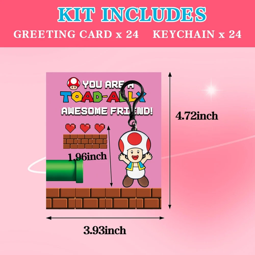 Valentines Day Gifts for Kids Package Includes: 24 Pcs (6 designs) cards with 24 Pcs (6 designs) keychain. Double Sided figure keychain : figure come with accurately colors, highly detailed and very cute. The Valentines cards come with holes so you just have to insert the keychain. Perfect for kids Valentine's Day, class events, cards exchange, gifts exchange, school classroom prize, love notes, party favors and so on.