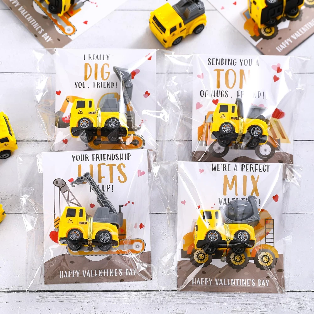 Package includes 24 Valentines day cards, 24 construction vehicles toys car, 24 clear bags and 24 golden ties.Cards size 5x3.9 inch. This 24-pack Valentine’s Day card set features a construction vehicle theme, with each card displaying adorable sayings. It adds creativity and fun to kids' Valentine’s Day celebrations. Includes four different types of construction vehicle toys—excavators, cement mixers, cranes, and dump trucks—adding variety and excitement for kids during exchanges. Simply use a ties to attach the toy car through the hole on the card, making it easy for kids to assemble themselves, adding an interactive touch to their Valentine’s experience. Ideal for preschool and elementary school Valentine’s Day exchanges, this card and toy combination creates a fun way for kids to interact and share friendship, making it perfect for classroom parties.