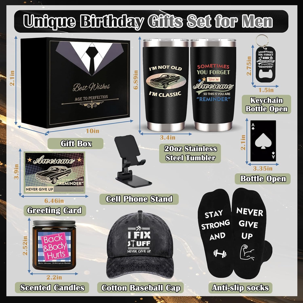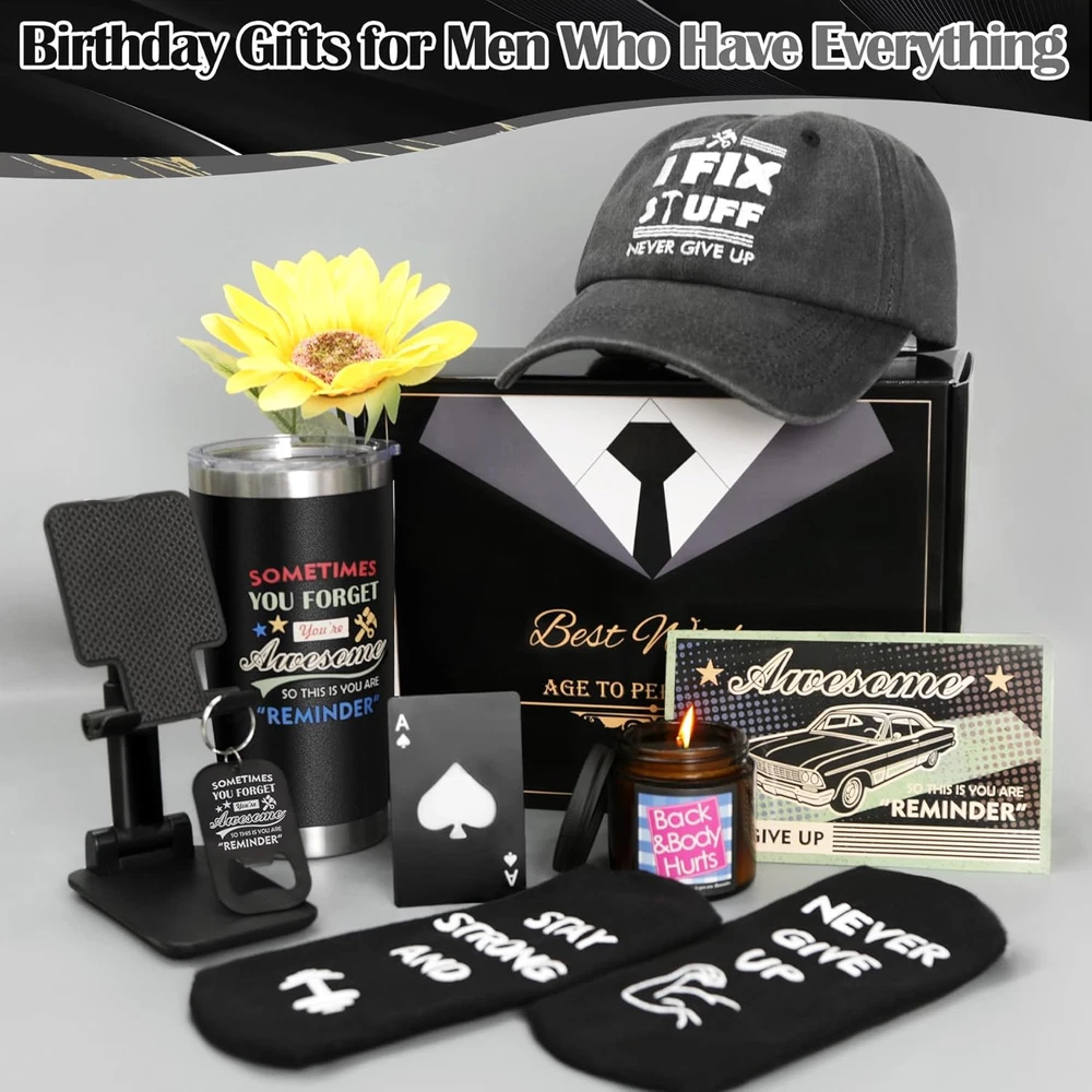 Valentines Day Gifts for Mens Him Who Have Everything, Unique Birthday Gift Baskets for Men Dad Husband Brother Boyfriend, Funny Grandpa Uncle Father Presents Man Black Thank You Gifts Ideas 【GIFTS FOR MEN WHO HAVE EVERYTHING】The mystery gift boxes for men includes |1*20oz Car Tumblers | 1*Baseball Hats| 1* Cotton Socks | 1* Keychain Bottle Opener| 1* A Beer Bottle Open | 1*Phone Holder | 1* Happy Birthday Card | all thing put in a personalized box package with some colorful raffia paper filling. Every item is carefully selected with good quality and special design to give him a suprise. 【UNIQUE BIRTHDAY GIFTS FOR MEN】Surprise your loved one with a gift box – because he deserves nothing but the best! this funny gifts for men is designed to bring joy to any special man in your life.Whether he’s your son, nephew, or husband, brother, boyfriend, papa, uncle, grandpa, coworker, boss, teacher or any male you care about. From 18 to 21, or 30, 40, 50, 60,70,80 year old adult men, this gag gifts stands out in a sea of presents. 【DAD & HUSBAN BIRTHDAY GIFTS】The dad birthday gifts come with 20oz stainless steel tumblers, suitable for many outdoor or indoor occasions such as home, car, office, picnic, hiking, fishing; Baseball cap can be used at outdoor activites; Foldable phone holder is easy to carry and can free your hands when you watch a video; All things in the boyfriend gifts box is very practical and interesting. 【ANNIVERSARY GIFTS FOR MEN】Life is full of moments worth celebrating, comforting, and cherishing. Whether it's a joyful birthday, an exciting milestone, or a challenging time when he needs extra love, our Black Gift Boxes are the perfect way to show you care,8 pcs gifts for him suitable as: birthday gifts, Christmas gifts, anniversary gifts, get well soon gifts, after surgery recovery gifts, cheer up gifts, Thank you gifts, Father's day gifts, Valentine's day gifts, Teachers' Day gifts. 【PERSONALIZED GIFTS FOR GRANDPA GIFTS】Who doesn't love receive an suprise? This cool dad present with joyful Inspirational, funny, novelty, cheerful, we believe that is a best gifts for man. Our gifts box come with exquisite present boxes, no need to repack. Don't forget to leave your sincere blessings on the greeting card! If you have any questions about our products, please contact us and we will handle it for you in 24 hours. Product description Reusability Reusable Unit Count 1.0 Count Style Modern Capacity 1.3 Pounds Customer Package Type Birthday Gifts box Color Black Included Components Lid Material Glass, Stainless Steel Item Weight 9.6 ounces Material Feature Insulated, Reusable Age Range (Description) Adult Product Care Instructions Hand Wash Only Item model number mens gifts Size 20 Ounces Special Feature Sliding Lid Product Dimensions 2"W x 6"H Cartoon Character birthday gifts for men anniversary gifts for men gifts for boyfriend mens birthday gifts boyfriend gifts dad birthday gift mens gifts for birthday funny gifts for men teacher gifts for men gifts for dad gifts for men birthday present gifts for him mens birthday gift ideas boyfriend birthday gifts husband birthday gift grandpa gifts uncle gifts dad hats for men gifts for men who have everything garden gifts for men thank you gifts for men Number of Items 1 Shipping Fast shipping is very important for us. Our standard US shipping service is FREE. Your order will be shipped within 2-3 business days upon full payment received. Your order will be delivered within 2-3 business days after the handling time. We only ship to the confirmed PayPal address. We reserve the right to cancel any order for any reason at any time. We are not responsible for undeliverable addresses. Returns and payment We offer a 30 days return policy from checkout winning date. We allow only PayPal as payment method FeedBack Your feedback very important to us, after you get your package and you are satisfied with our service please leave us positive feedback If you have any problem with your order / any questions please before leave any type of feedback For any questions, using eBay contact system Please visit our eBay store to check out other items for sale! Thank you for shopping at our store.