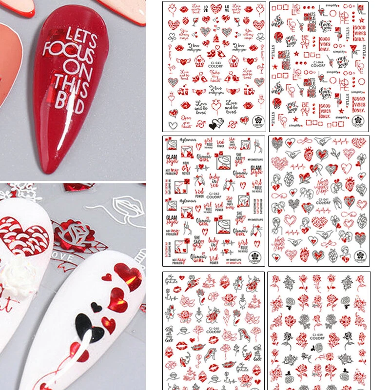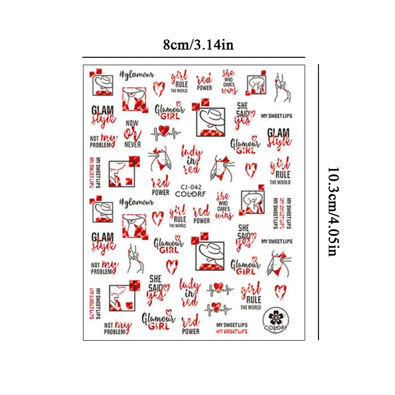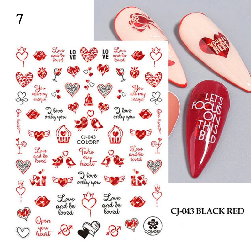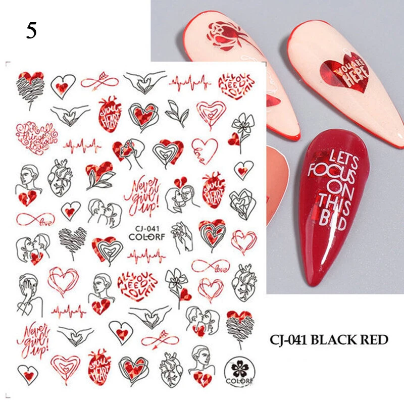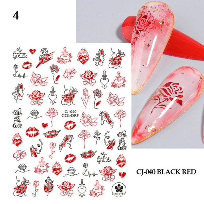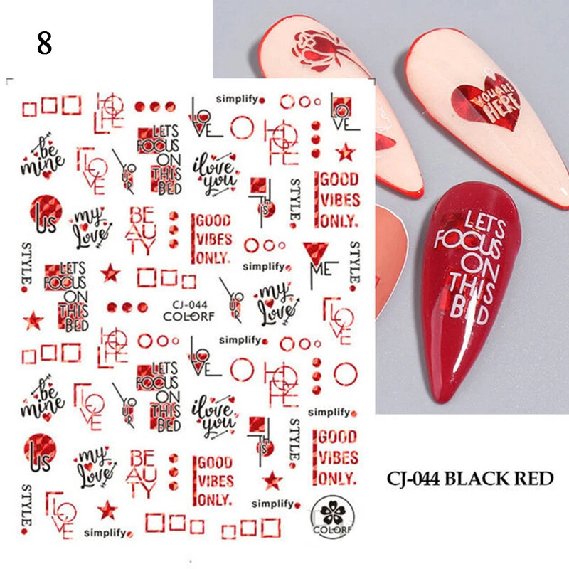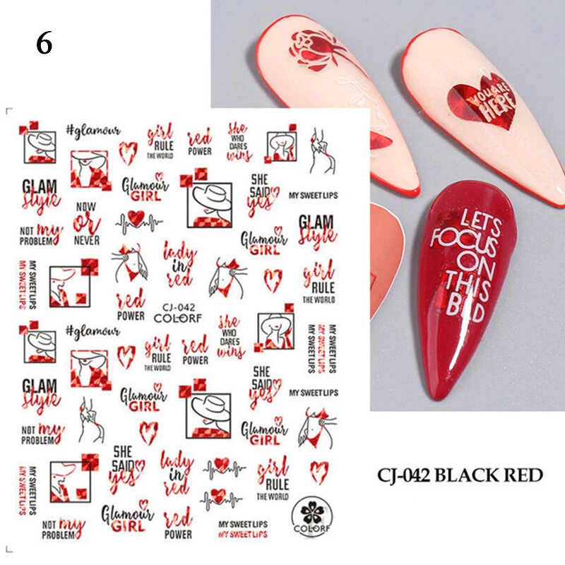 100% Brand New Type: Self adhesive nail sticker Color: Black,Red Type: 3D Nail sticker Usage: Nail Decoration Feature:Self-Adhesive Quantity: 1 Pc Sticker Package Contents: 1 Sheet Nail Stickers How to use: 1. Pick up a part of the sticker. 2. Applying a base gel and wait it dry completely. 3. Select a base color that your like and apply it onto your nails, then wait until it 90% dry. 4. Use tweezers to gently remove the prepared sticker place it onto your nail and press it. 6. Apply top coat for a perfect effect. NOTE: Do not apply stickers to sensitive skin. Not recommended for little children.