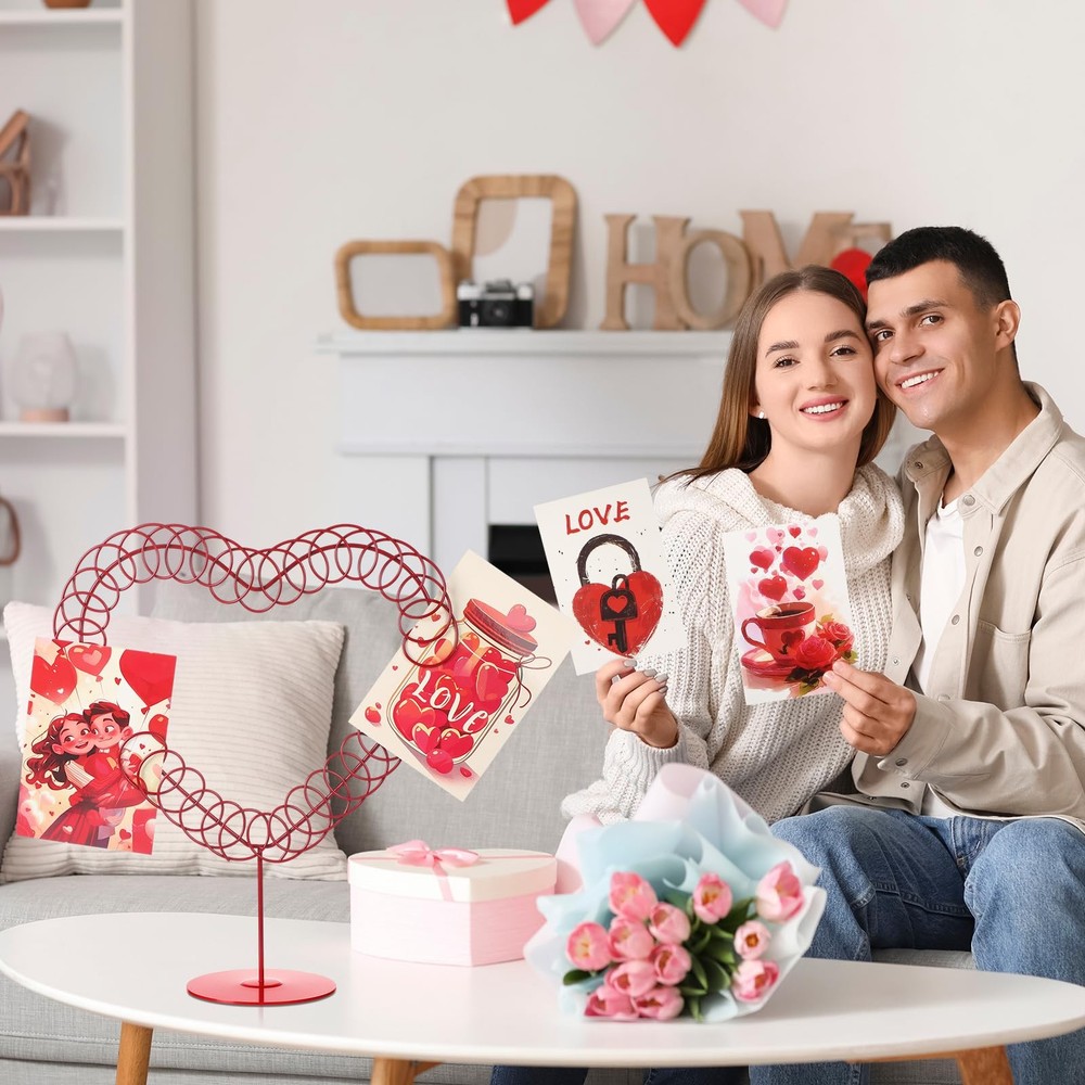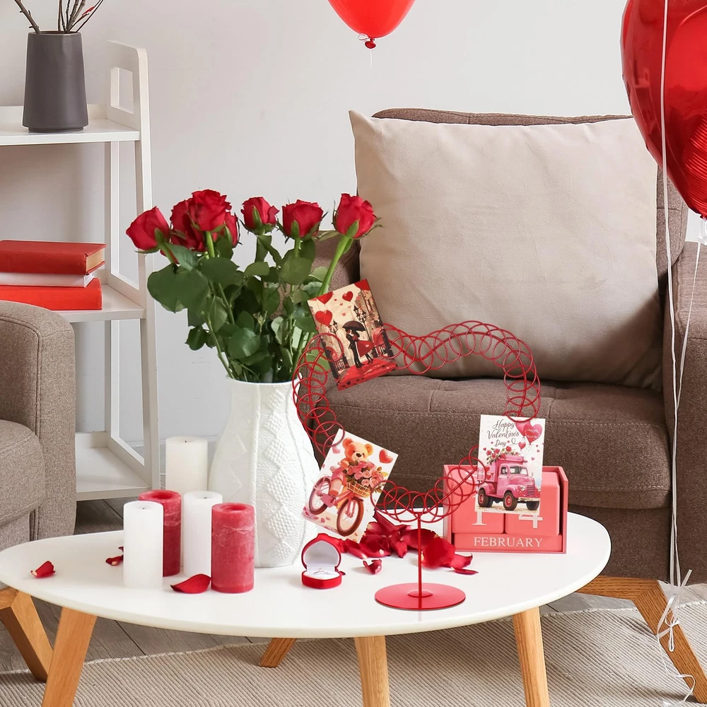 Features: The valentine card display stand is suitable for greeting cards, photos, postcards, etc., which encourages you to display and share your beautiful valentine cards without worrying about space constraints. The sturdy base of our valentine picture holder provides good bearing capacity, ensuring that the holder stays intact. This heart shaped is easy to install and doesn't take up much space. Specifications: Material: metal Color: red Size: approx. 11.81 x 15.75 inches/ 30 x 40 cm (D x H) Package includes: 1 x Valentine Notes: Manual measurement, please allow slight errors on size. The color may exist a slight difference due to different screen displays. Heart Shaped Card Wreath Holder: the overall height of our Valentines Day card wreath holder is about 15.75 inches/ 40 cm, and the diameter of the wreath is about 11.81 inches/ 30 cm; The wreath section comes with a spiral design with multiple spiral slots, enough to place multiple cards, photos and pictures Strong Material: the heart shaped is made of metal wire, strong, not easy to deform, break, rust or fade, ensuring long life; The removable metal base can allow you to move it anytime and anywhere, with the scene you want to use, to display your Valentines Day cards beautifully Unique Design: the charming red color and elegant heart shape add a fresh and sophisticated feel to your Valentines Day card holders; It displays your pictures in a stylish way, and adds a little Valentines Day atmosphere to your home or office, suitable for extending valentine celebrations Versatile Usages: the valentine card display stand can be applied to display , cards, pictures, photos, tickets, etc., easy to match other decorations, to bring you a good mood; You can also use it as a background to help you take many beautiful photos, and show your good aesthetic taste Wide Applications: the metal valentine gift card holders can be placed in various places, such as mantels, tables, windowsills, etc.; It is also suitable for offices, gift shops, and other places, to add a touch of elegance and charm to your place, creating a warm and festive atmosphere