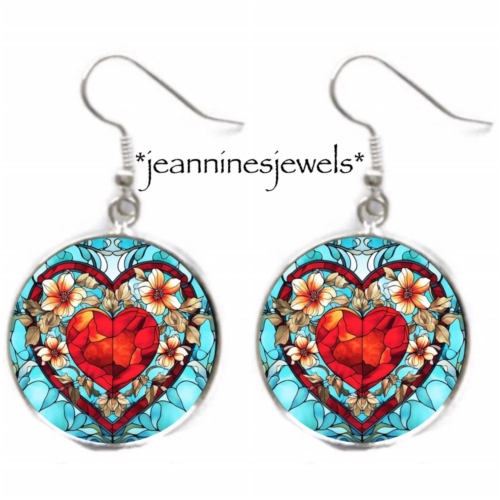Valentines Day Silver Dangle Earrings Red Heart Faux Stained Glass Art Wife Gift