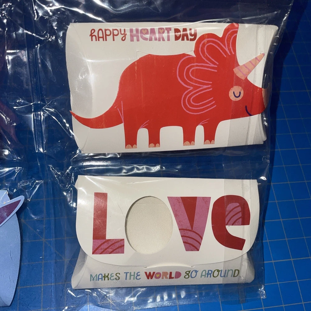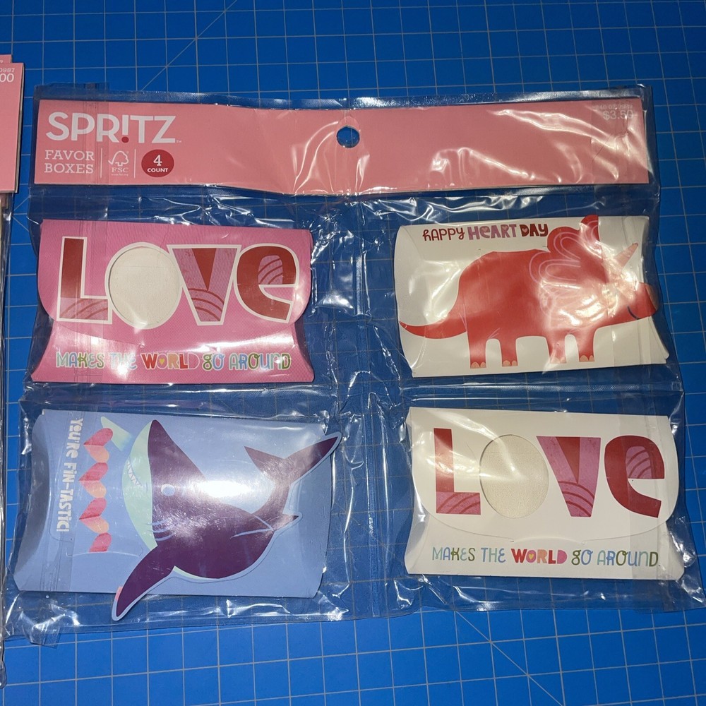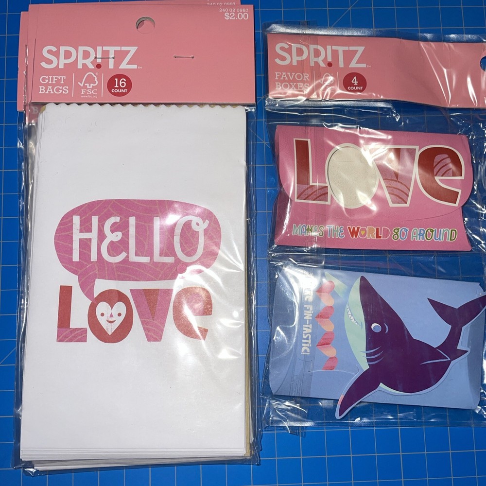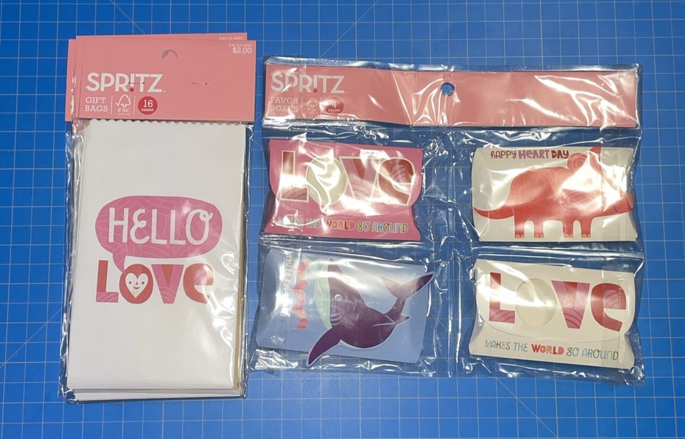 Four packages of 16 ‘Hello Love’ gift bags. Size approx 7 x 4in One package of four favor boxes. Size approx 4 x 2 in Some damage to boxes (wrinkles folds, slight crushing)