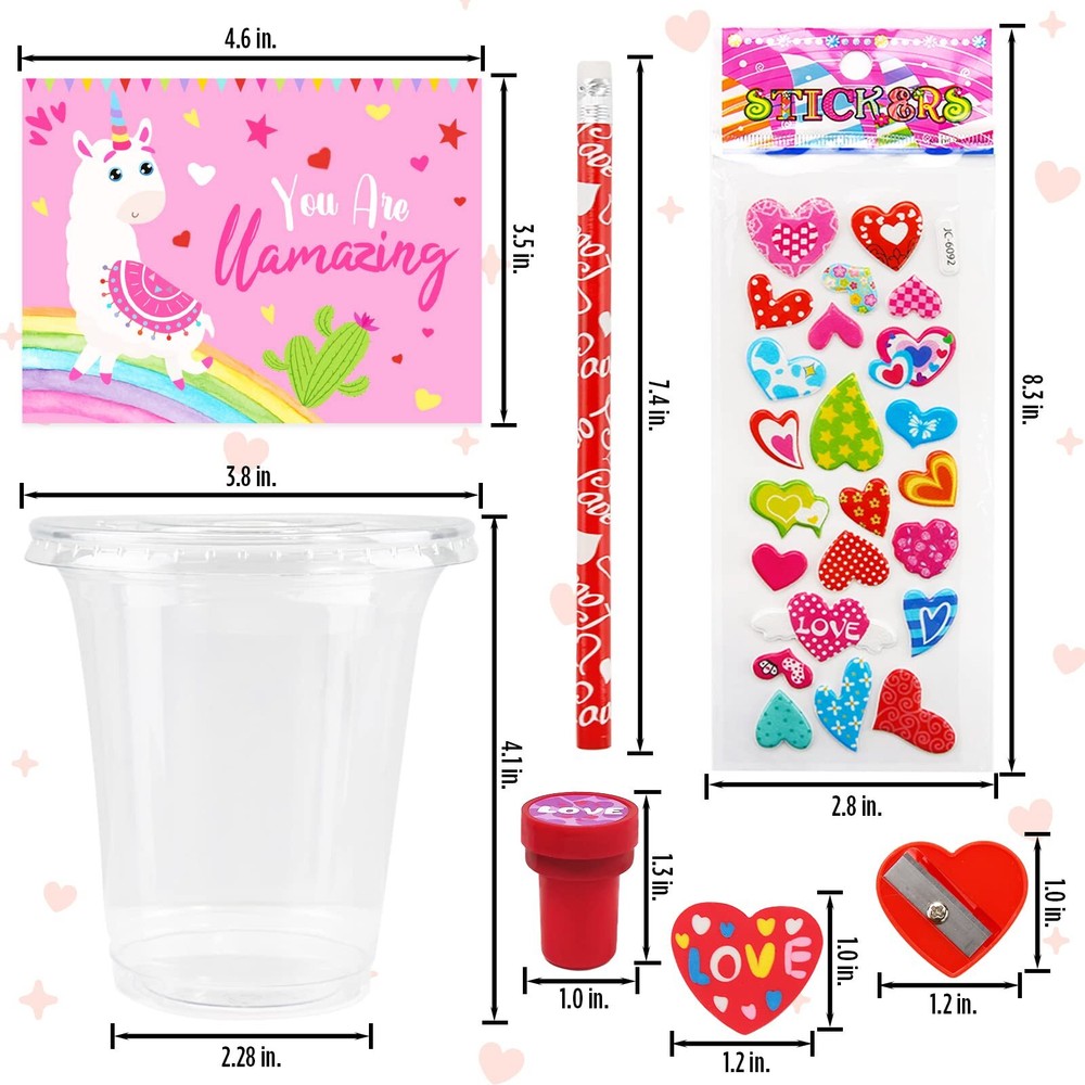 Valentine's Day stationery set includes 24 cups, 24 pencils, 24 cards, 24 stickers, 24 stampers, 24 sharpeners and 24 erasers. Total of 168 pieces. Plastic cup measures 4.1" tall. Holds a variety of stationery Card measures 4.8" x 2.2". 4 styles of unicorn design Bulk cards and stationery are great for DIY unique gifts with kids Ideal for school exchange, teacher classroom prizes, Party Favors Supplies