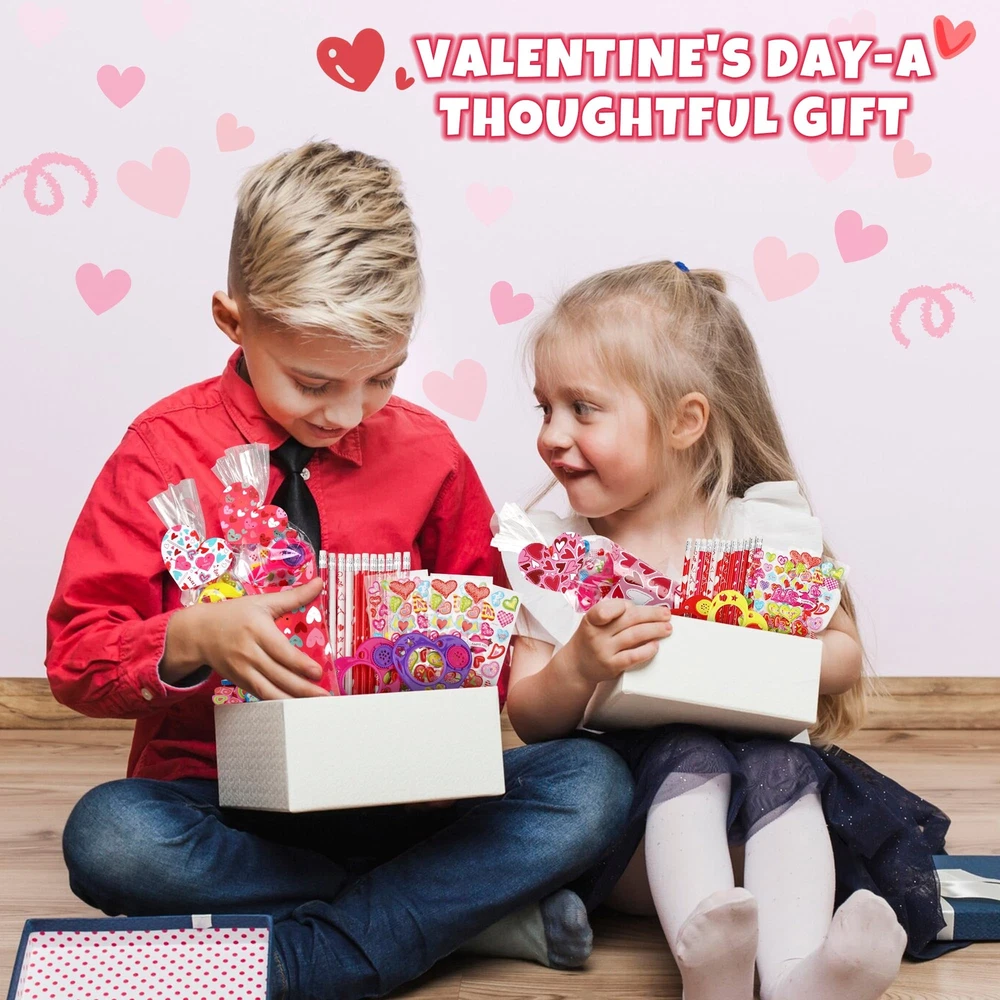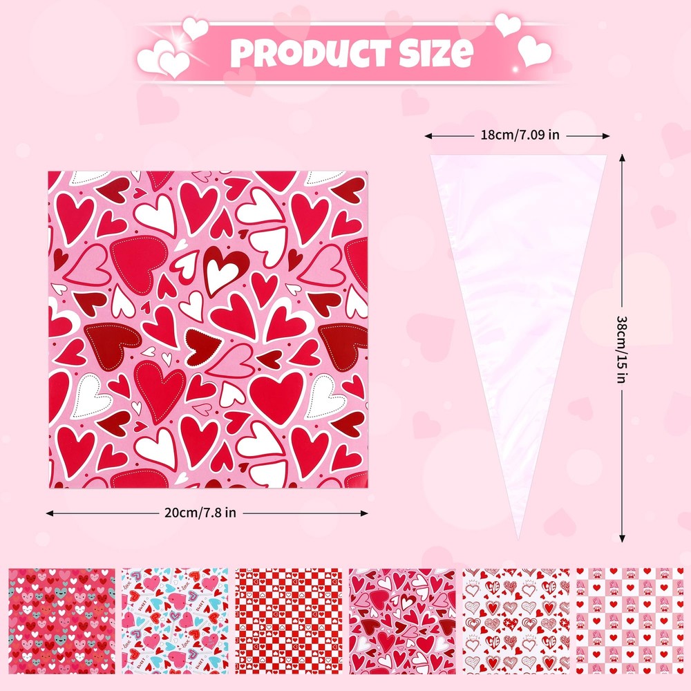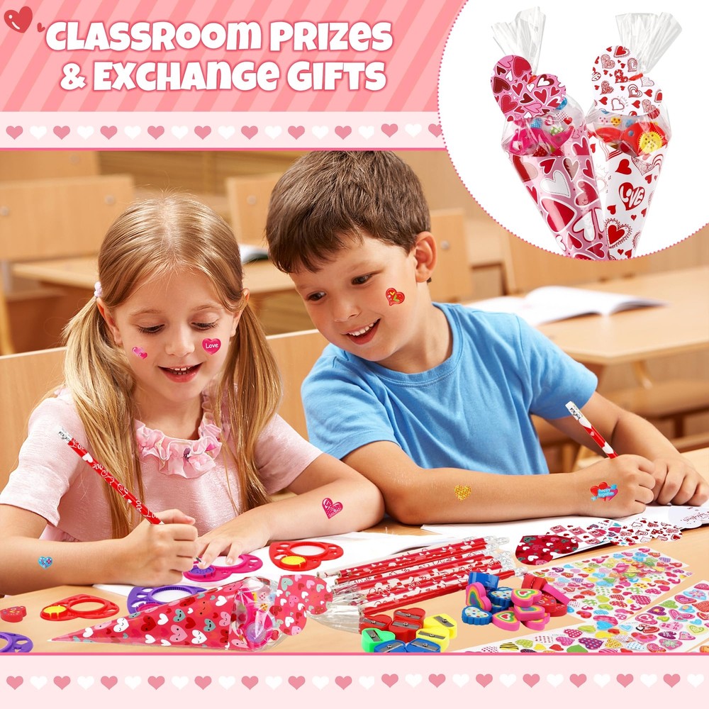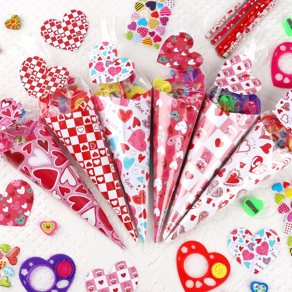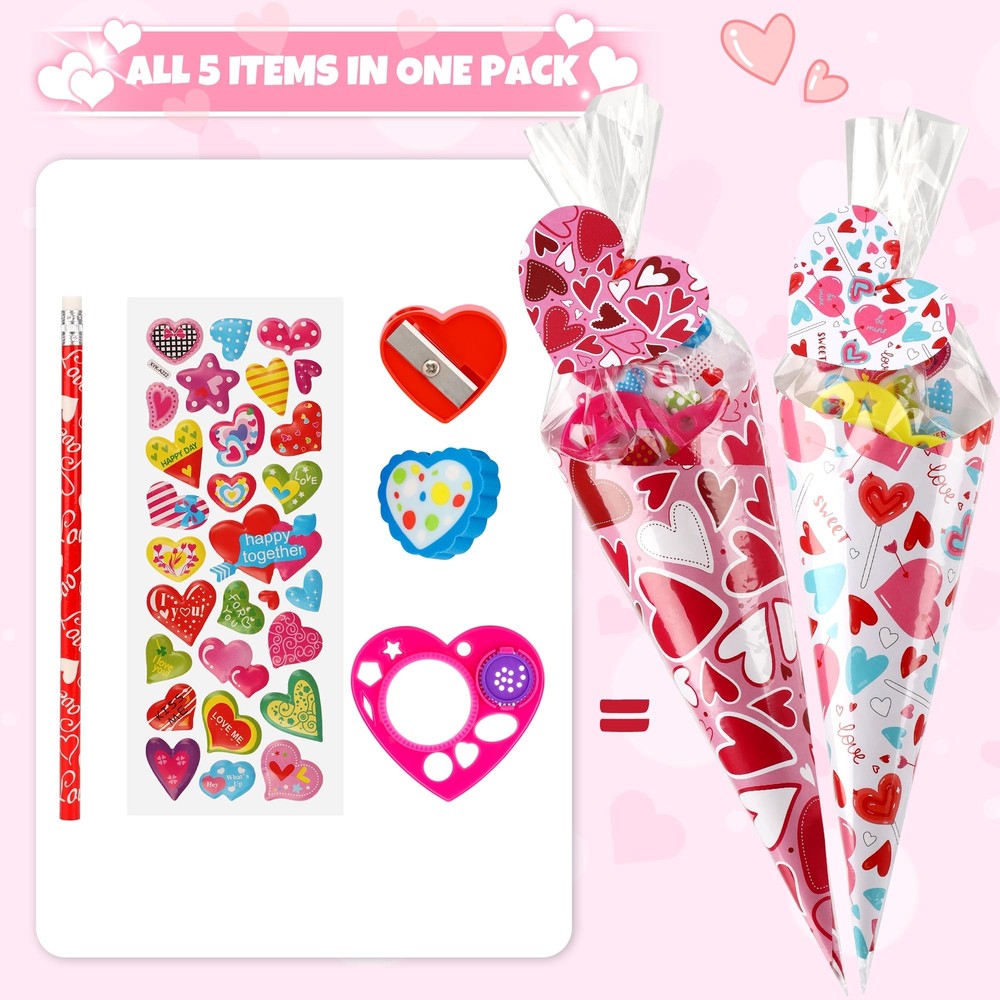Creative Valentine's Day Stationery Gift Exchange Set-This Valentines sweet sones stationery set includes 30 cellophane cone shaped treat bags, 30 heart shaped gift tags, 30 valentines card papers ( 6 style ), 30 pencils, 30 stickers, 30 sharpeners, 30 rulers and 30 erasers. Total of 240 pieces. Valentines DIY Crafts Exchange Gift Set Idea-This valentines gift set is packed with an assortment of valentines themed card papers and stationeries, which are put into the included clear cones treat bags, then close by the included ties and heart shaped gift tags, this cute DIY cone stationery gift is sure to bright everyone. Valentines Day Gift with Giant Size-The clear cones shaped treat bag meatures 15 inch tall, the valentines themed card paper measures 7.8 inch x 7.8 inch, 6 styles of design, candies or sweets could also be added. The finished sweet cones shaped stationery treat bag measures 14 inches tall , a giant valentine's gift for kids parties. Unique Valentines Day Exchange Gift Ideas-Combine with the idea of traditional valentine's day gift card and creation of sweet cones, packing stationery into the sweet cone shape treat bags, this unique valentines stationery cones kit contains everything, which is great for school aged children. Valentine's Day Arts Crafts Party Fovors-This Valentine's Day cones shaped stationery bulk set is ideal for school exchange, kids Valentine's Day, Teacher’s Classrooms, classroom prizes, kid’s Valentine’s Day parties, Home School party favors, Valentine’s Stationery Gift, Birthday Party Gift and so on.