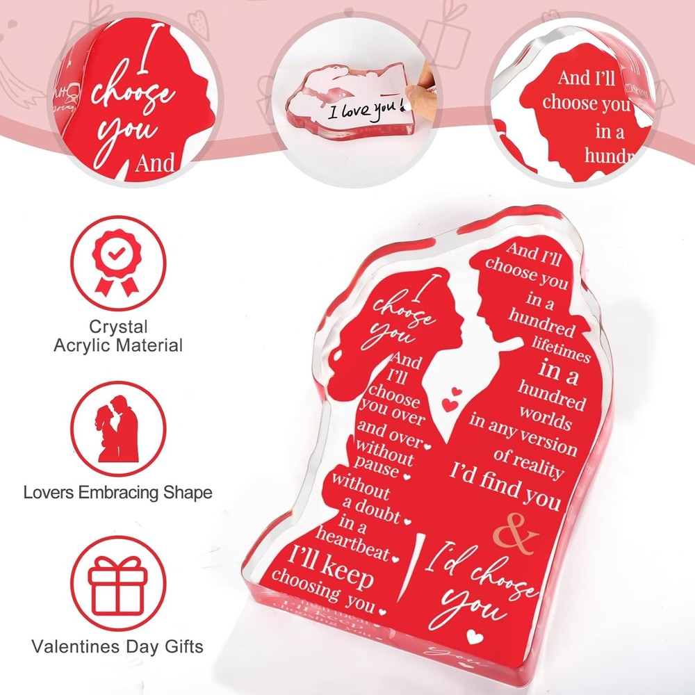 Free eBay listing template designed by dewiso.com Valentines Day Wife Gifts for Him Husband Valentine's Day for Her Girlfriend Couples, Romantic I Love You Gifts Anniversary Wedding Gifts for Couples 2026 Fiance Christmas Birthday Gifts FREE AND FAST SHIPPING! About this item Unique Valentines Day Gifts: acrylic lovers plaque with heartfelt message "I Choose You" is a special way to convey commitment to your lover. It stands out from traditional flowers or chocolates, offering a more personal and lasting expression of affection. Perfect Valentines Day gifts for her/Him Gifts for Boyfriend & Girlfriend: designed into lovers embracing shape in vibrant red color, a symbolizes of heartbeats, intimacy and endless love between couples. Romantic gift for girlfriend on Valentines Day, sentimental gifts for boyfriend Wife/ Husband Valentine's Day Gifts: love is a choice that lasts a lifetime, "I Choose You" plaque is a symbol of eternal love. This small gift will bright her smile on your first year together or decades celebrating, birthday, Christmas, Valentine's Day Wedding Anniversary Gift, Engagement or Proposal Gift: it symbolizes the promise of love, elegant lettering, bold color with a heartfelt messages, brings warmth and romance to any space like wedding reception tables, proposal scene, engagement party, bedroom or office I Love You Gifts for Her: Size 4.6 x 3 x 0.6", made of quality acrylic, smooth surfaces, durable and anti-scratch. Placing it in living room as part of home decor reminders your unwavering love and commitment to each other. A special birthday gifts for wife, cool Valentine's Day Gifts for her Product We offer a 30-Day Return Policy on items which you are not completely satisfied with. You have the option for a full-refund or an exchange of the item. No returns are available on items shipped outside of the US . Shipping We offer Free Shipping to the US and ship within 2 business days of payment, usually sooner. We use UPS express shipping. That's why your products are usually delivered within 3 days . Contact We try our very best to make sure every customer is completely satisfied. If there's a problem , message us! We're happy to help. 24/7 live chat available.
