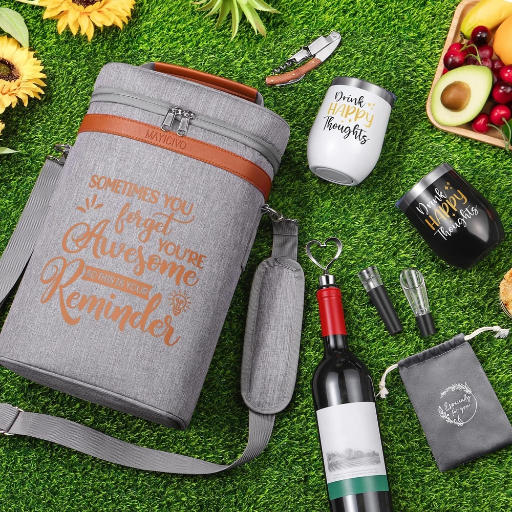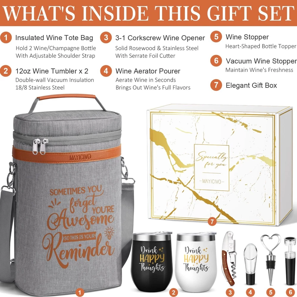 Valentines Day Wine Lovers Gifts for Women Wine Gifts Baskets, Birthday Gifts for Sister Friends Mom Dad Coworker Girlfriend Housewarming Gifts Set, Wine Cooler Bag Wine Tote Carrier w/Wine Tumblers Product Details Style Name: A1.You Are Awesome Brand: MAYICIVO MPN: Does not apply UPC: Does not apply EAN: Does not apply Brand: MAYICIVO Material: Oxford Fabric, Extra-Thick Padded Insulation, Seamless Leakproof EVA Liner Color: Black/White Special Feature: Insulated Style: A1.You Are Awesome Brand: MAYICIVO Material: Oxford Fabric, Extra-Thick Padded Insulation, Seamless Leakproof EVA Liner Color: Black/White Special Feature: Insulated Style: A1.You Are Awesome Theme: Holiday Recommended Uses For Product: Travel, Home Included Components: Insulated Tumblers, 3 in 1 Corkscrew Wine Opener, Wine Aerator Pourer, Heart-Shaped Wine Stopper, Vacuum Wine Stopper, Drawstring Storage Bag Specific Uses For Product: Wine, Hot & Cold Beverages Shape: Rectangular Pattern: Solid Material Feature: Insulated Reusability: Reusable Number of Items: 9 Embellishment: Glitter Package Type: Standard Packaging Manufacturer: MAYICIVO Package Dimensions: 12.52 x 10.55 x 4.02 inches Item Weight: 2.53 pounds Date First Available: March 3, 2024 PERFECT & CUTE BIRTHDAY GIFTS FOR WOMEN MEN: Still looking for an upscale wine lover gifts as birthday gifts for your love ones? MAYICIVO Insulated Wine Cooler Bag Wine Tote Carrier with Wine Tumbler Wine Accessories Gift Set is a prefect & cherished Christmas or birthday gifts for best friends mom dad sister couples wife girlfriend coworkers teacher nurse, etc. Great as Mothers day gifts for mom, valentines day gifts. This essential Wine Gifts Set is ideal for wine enthusiasts & sommeliers 9PCS WINE LOVER GIFTS FOR WOMEN MEN: MAYICIVO Best Friend Birthday Gifts for Women Friendship contains all carefully-designed thoughtful goodies, including 2x 12oz insulated tumblers, insulated wine tote bag, 3 in 1 corkscrew wine opener, wine aerator pourer, heart-shaped wine stopper, vacuum wine stopper, drawstring storage bag and elegant gift box. Such a heart-warming Wine Gifts for Women! Send this Inspirational Gifts For Women Men to convey your blessings and let them enjoy tasty wine FINE INSULATED WINE TRAVEL BAG: MAYICIVO Wine Bottle Cooler Bag is made of high quality waterproof & dustproof oxford fabric, extra-thick padded insulation & seamless leakproof EVA liner to protect bottles of wine from external collision, durable, lightweight, thermal insulated to effectively keep bottles of wine stay cold, warm & fresh for hours. Suitable for wine, liquor, champagne, whiskey, beer, coffee, etc. Also great as Christmas Gifts for Women Friends Sister Mom, Graduation Gifts CONSIDERATE DESIGN & MULTIFUNCTIONAL: MAYICIVO Insulated Wine Carrier Tote Bag (8.7L x 4.3W x 14.6H) can hold 2 standard 750ML wine bottles or wine and tumblers at the same time. Interior removable divider keeps 2 bottles separate and avoid colliding. 4 elastic straps on the top designed for wine accessories storage. The removable adjustable shoulder strap (16" to 28") & comfort handle make it portable to carry wine for dinner, party, bar, picnic, camping, beach, travel or road trip INSULATED VACUUM TUMBLER: Made of 18/8 food-grade sturdy stainless steel, with double-walled vacuum insulation, these sweat-free insulated tumblers can preserve beverage temperature up to 8h for cold and 4h for hot, great for wine, champagne, whiskey, beer, iced coffee, juice, smoothies, etc; Drink Happy Thoughts positive quote printing put glowing smiles on the face of recipient, making it an unique Birthday Gifts Idea for Sister Mom Dad Valentines Day Gifts for Her Him Girlfriend Wife PRACTICAL WINE ACCESSORIES GIFT SET: Our Wine Lovers Gifts for Women Men offers everything wine lovers need to enjoy wine time! The premium 3 in 1 corkscrew wine opener cuts foil & opens wine easily. The vacuum wine stopper keeps wine fresh & preserves its flavor. The wine aerator pourer instantly enriches wine's aroma & texture and reduces drips & spills. The delicate heart-shaped wine stopper airtight seals & decorates wine bottle. A drawstring bag can storage all small wine accessories DELUXE WINE BAG GIFT SET: This Wine Cooler Bag Wine Carrier Tote Gift Set with Glasses, wrapped in our high-end gift box, is perfectly presented as Birthday or Christmas Gifts for Women Men, Mothers Day Gifts for Mom, Valentines Day Gifts for Her Him Girlfriend wife couples, Cheer Up Gifts, Inspirational Gifts for Women Men or Appreciation Gifts.