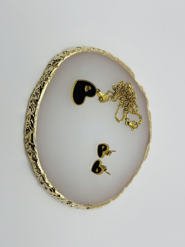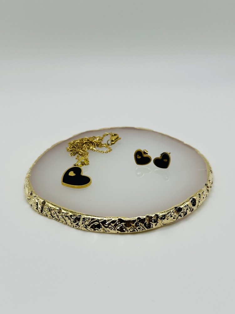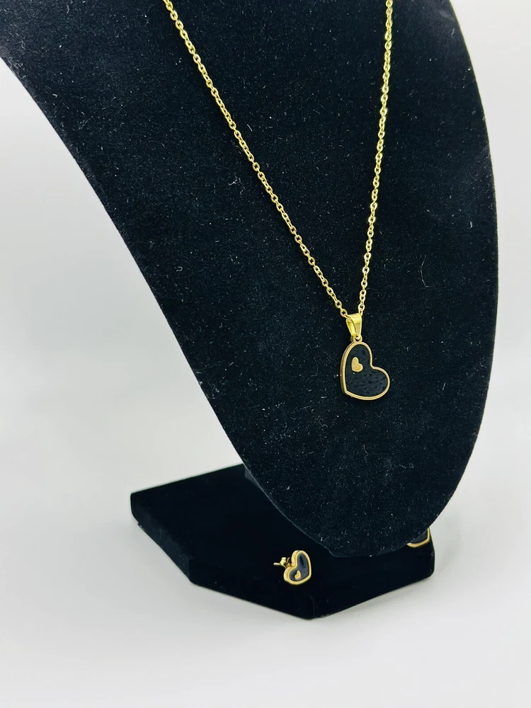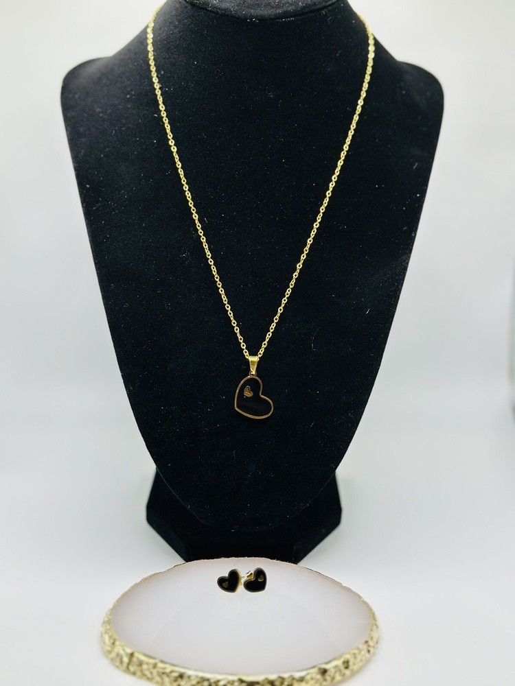 This beautiful jewelry set is perfect for any special occasion, whether it's Mother's Day, an anniversary, a birthday, or Valentine's Day. The set includes a charming black heart-shaped pendant necklace and matching black enamel stud earrings, both made of high-quality stainless steel with an excellent cut grade. The necklace has a length of 17 inches and the set comes in a stunning gold color.The jewelry set is designed with a fashion-forward look that is perfect for those who love jewelry and fashion. The pendant necklace and earrings are a perfect match with any outfit, making them the ideal gift for any special woman in your life. Surprise your loved one with this charming jewelry set and show them how much you care.