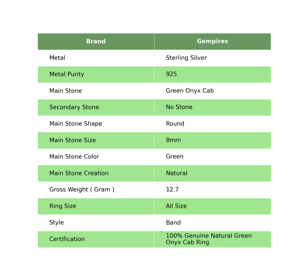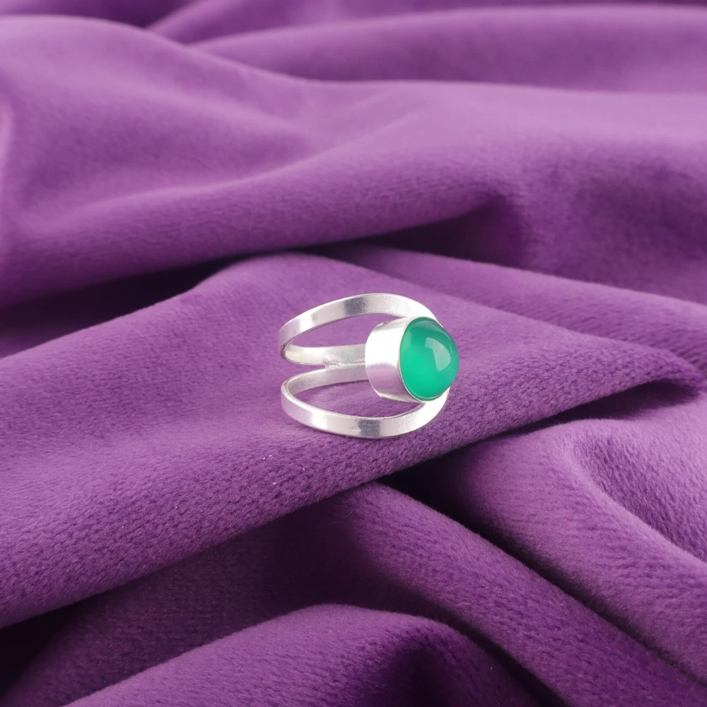 Welcome To Our Shop Gempires ------------------------------------------- Get this stylish and fashionable statement Ring studded with Green Onyx Cab to make you look graceful. Add this unique ornament to your jewelry collection to match this with any of your casual dresses. Valentines Deal Green Onyx Cab Gemstone 925 Silver Band Wedding Ring US All Size Check My Other Ring Listings : Click Here SKU:- RR-55-21 Metal:- Sterling Silver Metal Purity:- 925 Gemstone:- Green Onyx Cab Gemstone Color:- Green Gemstone Shape :- Round Gemstone Creation :- Natural Stone Setting :- Bezel Ring Size:- All Size US ___________________________________________________________________ Shipping Handling - Free Standard Shipping all over the world Handling Time - 2 to 5 BUSINESS Days Delivery Time - 7 to 20 Days ( Various on destination ) _________________________________________________________________ Returns - 1.We provide a 100% Money Back Guarantee, excluding shipping costs, within 30 days from the date of item receipt. 2.The item must not be altered or damaged in any way shape or form. 3.Upon receipt of the aforementioned items, your payment will be promptly refunded. 4.Please be so kind as to contact us via email in order to acquire comprehensive return instructions before proceeding with the return of the merchandise. 5.Kindly be advised to allocate a maximum period of 1 business day for the processing of all returns, in order for the appropriate credit to be applied. 6.Sizing does not affect the return policy. _________________________________________________________________ FAQ's - Q.1 ARE THE ITEMS YOU ARE SELLING BRAND NEW? We exclusively offer brand-new products, refraining from the sale of pre-owned jewelry. Our entire jewelry collection is composed of 100% natural, conflict-free pieces. We do not engage in the trade of imitation or lab-grown gemstones and diamonds. Q.2 WHAT ARE YOUR BUSINESS HOURS? we operate 24x7 as we have a dedicated team who works in different shifts to deliver the services to our valuable customers. ________________________________________________________________ Gempires is committed to delivering customers an unparalleled experience through the provision of exquisite handmade jewelry, meticulously crafted to uphold the most exacting standards of quality. Our operations encompass dual roles as both discerning connoisseurs and skilled artisans within the realm of jewelry making. We proudly hold an extensive proficiency in the fine art of enhancing gemstones, allowing us to harmonize them seamlessly with diverse aesthetic inclinations. We are delighted to extend to you the privilege of curating your very own jewelry collection. This collection will be graced by the presence of genuine and splendid natural gemstones, each possessing an innate authenticity and beauty that is truly unparalleled. **** STAY BLESSED ALWAYS*****