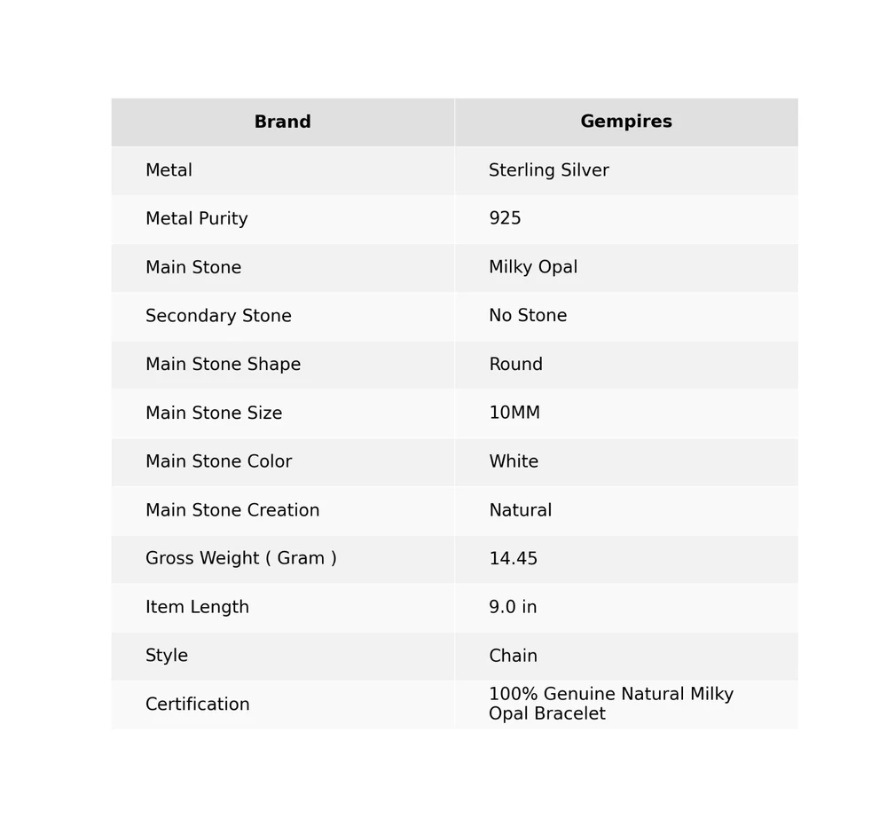 Welcome To Our Shop Gempires ------------------------------------------- Make your look hypnotic and charming with this classy Bracelet studded with Milky Opal featuring fascinating alluring 925 Sterling Silver finish. Stylish floral design make it flamboyant and elegant that you can wear it on parties or on a special event. Valentines Deal Sterling Silver Milky Opal Gemstone Wife Chain Bracelet Jewelry Check My Other Bracelet Listings : Click Here SKU:- RB-7-15 Metal:- Sterling Silver Metal Purity:- 925 Gemstone:- Milky Opal Gemstone Color:- White Gemstone Shape :- Round Gemstone Creation :- Natural Stone Setting :- Bezel Bracelet Length:- 9 Inches Bracelet Width:- Inches ___________________________________________________________________ Shipping Handling - Free Standard Shipping all over the world Handling Time - 2 to 5 BUSINESS Days Delivery Time - 7 to 20 Days ( Various on destination ) _________________________________________________________________ Returns - 1.We provide a 100% Money Back Guarantee, excluding shipping costs, within 30 days from the date of item receipt. 2.The item must not be altered or damaged in any way shape or form. 3.Upon receipt of the aforementioned items, your payment will be promptly refunded. 4.Please be so kind as to contact us via email in order to acquire comprehensive return instructions before proceeding with the return of the merchandise. 5.Kindly be advised to allocate a maximum period of 1 business day for the processing of all returns, in order for the appropriate credit to be applied. 6.Sizing does not affect the return policy. _________________________________________________________________ FAQ's - Q.1 ARE THE ITEMS YOU ARE SELLING BRAND NEW? We exclusively offer brand-new products, refraining from the sale of pre-owned jewelry. Our entire jewelry collection is composed of 100% natural, conflict-free pieces. We do not engage in the trade of imitation or lab-grown gemstones and diamonds. Q.2 WHAT ARE YOUR BUSINESS HOURS? we operate 24x7 as we have a dedicated team who works in different shifts to deliver the services to our valuable customers. ________________________________________________________________ Gempires is committed to delivering customers an unparalleled experience through the provision of exquisite handmade jewelry, meticulously crafted to uphold the most exacting standards of quality. Our operations encompass dual roles as both discerning connoisseurs and skilled artisans within the realm of jewelry making. We proudly hold an extensive proficiency in the fine art of enhancing gemstones, allowing us to harmonize them seamlessly with diverse aesthetic inclinations. We are delighted to extend to you the privilege of curating your very own jewelry collection. This collection will be graced by the presence of genuine and splendid natural gemstones, each possessing an innate authenticity and beauty that is truly unparalleled. **** STAY BLESSED ALWAYS*****