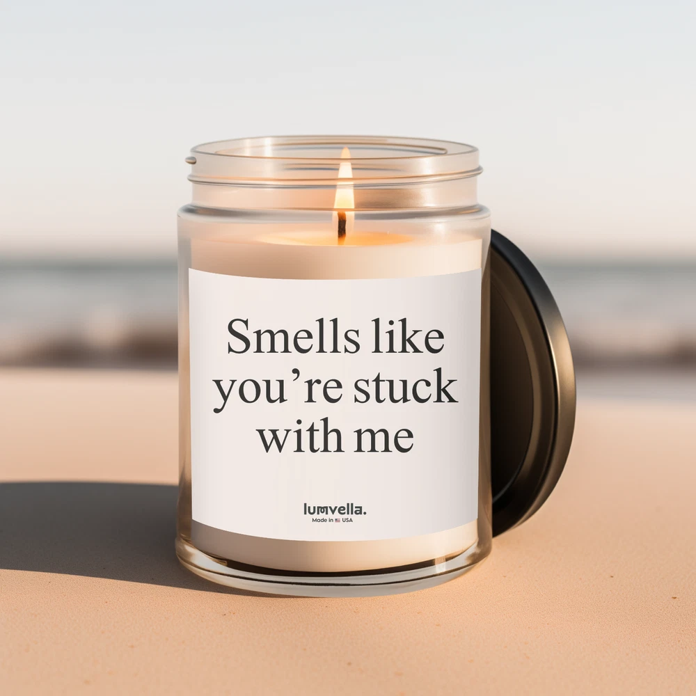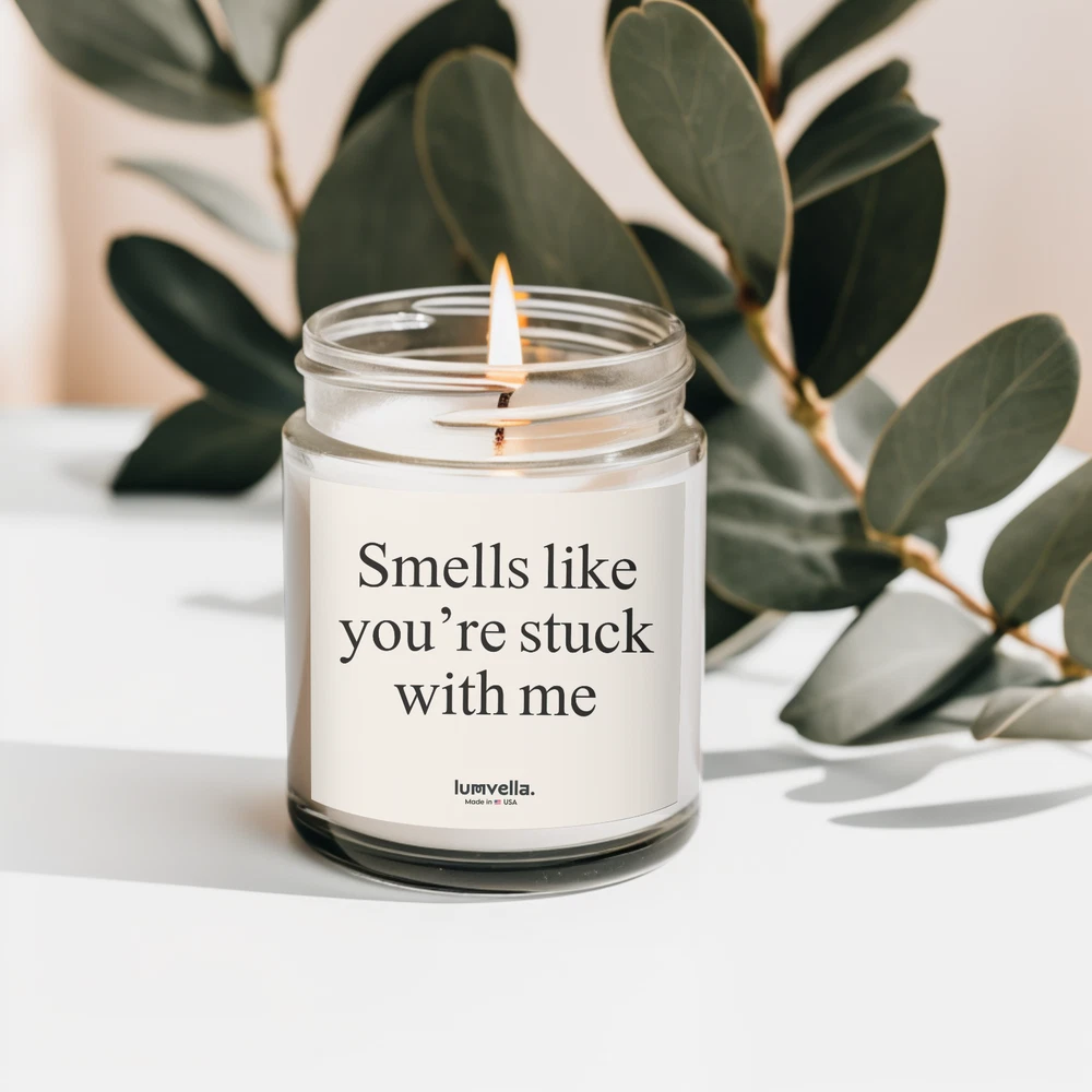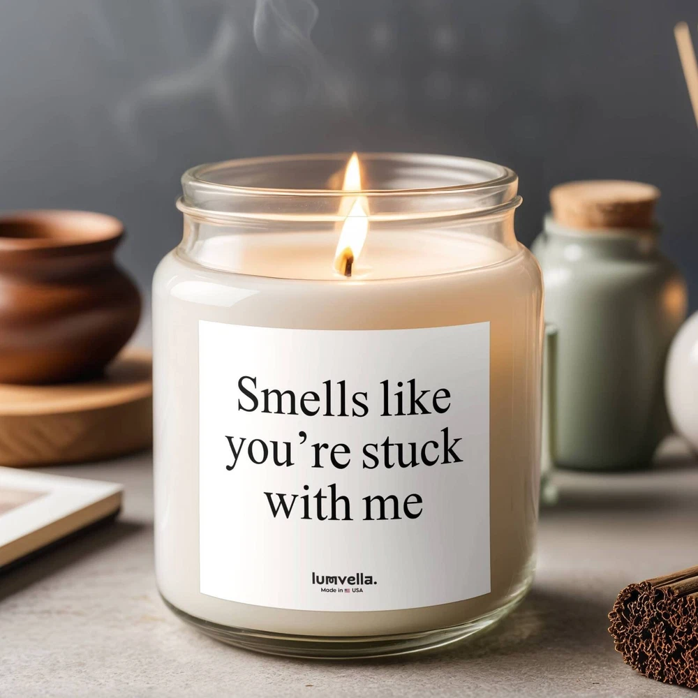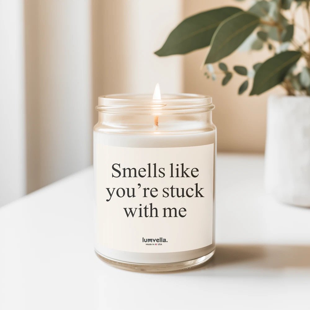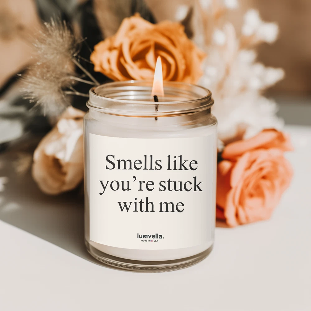 Smells Like You're Stuck With Me. Valentine's Gift for Her, Valentines Gift for Him, Romantic Valentine's Ideas, Anniversary Gift, Personalized Valentine's Gifts, Last-Minute Valentine's Gifts, Cute Valentine's Day Surprises, Unique Valentine's Day Gifts for Couples, Luxury Valentine's Gifts, Valentine's Day Date Night Ideas, Valentine's Day Gifts for Friends, Gift Valentines Day, Valentines Gift For Her, Gift Couple, Gift Boyfriend Gift Girlfriend, Best Friend Birthday Gifts Product Details 1- Materials: coconut apricot wax, cotton wick 2- Lid color: gold 3- Vessel color: amber and clear 4- Burn time: up to 20 hours (4oz), up to 50 hours (9oz) 5- Compliant with ASTM safety standards 6- Assembled in the USA from globally sourced parts 7- Please note: All scents have the same natural color About These scented candles are hand-poured in the USA, and made from premium coconut apricot wax with cotton wicks that are lead and zinc-free. With a burn time of approximately 20 hours, they provide long-lasting fragrance and warmth. The candles come in 9 scents, as well as in elegant amber and classic clear vessels, topped with a stylish gold lid, making them a beautiful, ambient addition to any space. Scent Descriptions : 1- Midnight Blackberry This scent opens with the zesty brightness of lime and orange. Fragrance features a blend of blackberry, raspberry, and champagne. As the scent evolves, a sweet and comforting base of sugar, praline, and pine emerges, creating a rich and cozy atmosphere 2- Fraser Fir This scent begins with a refreshing burst of cypress and lemon peel. Brings the robust and earthy tones of evergreen and cedar. As the fragrance settles, a comforting base of fir, amber, and moss lingers, enveloping your space with warmth and tranquility 3- Cinnamon Chai A blend reminiscent of a steaming cup of spiced chai, it marries notes of zesty orange peel and rich black tea. Hints of nutmeg and peppercorn. Finally, the alluring base notes of vanilla, clove, and cinnamon offer an embrace of comfort and nostalgia 4- Cashmere Musk As its top notes of bergamot and saffron, the heart comes alive with violets and lily of the valley. The fragrance settles with a soothing blend of dark musk and vetiver 5- Beachwood Bask in the essence, zest of sea salt and orange peel, harmonizing with the crisp scents of grass. As the bouquet deepens, invigorating waves of eucalyptus and sage begin their sparkling dance, tempered by the grounding ambiance of teakwood and patchouli 6- Mango Coconut Opening with the uplifting zest of orange and pineapple, it seamlessly transitions to the juicy accord of peach and mango. As the aroma unfolds, a sweet base of sugar and creamy coconut milk lingers 7- Unscented Scent profile includes fragrance-free illumination, offering a subtle glow to any space without the distraction of scents 8- Vanilla Bean Introducing Vanilla Bean, the essence of warmth and comfort. A harmonious blend of rich buttercream and sugary cake at the top, a heart note of pure unadulterated vanilla, and the smooth sophistication of bourbon at its base 9- Lavender Refreshing burst of citrus and bergamot. As the scent unfolds, notes of camphor and eucalyptus weave through the air and are rounded off by a soft touch of cedar. This is in preparation for the heart of the experience - pure, mesmerizing lavender Care instructions Before burning, always trim the wick to ¼ inch. Keep the wax pool clear. Always use a candle holder, it should be heat resistant, sturdy, and large enough to contain any drips or melted wax. Burn candles in a well-ventilated room. Never burn a candle for longer than three hours, cool for at least two hours before relighting. Never leave a candle unattended, keep it away from anything that can catch fire. Keep candles out of the reach of children and pets. Don't burn a candle all the way down. Use a candle snuffer to extinguish a candle, it's the safest way to prevent wax from splattering. Follow us and tag us. Instagram: @Lumvella Thank you for visiting our store! We appreciate your support and are here to assist you with any questions or needs. Please feel free to reach out anytime.