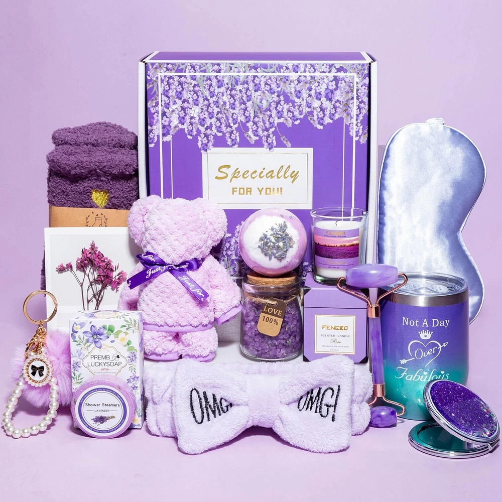 【An Unforgettable Unboxing 】: The unique gift basket contains 1X 12 oz Insulated Stainless Steel Tumbler ,2X Bath Bomb, 1X Sleep Eye Mask,1X Soap,1X Scented Candle,1X Fuzzy Socks,1X Greeting Card,1X Bear Shaped Towel,1X Mirror,1X Cute bow headband,1X Jade Roller,1X Pompom Keychains, 1X Bath sea salt. 【Fragrant and relaxing bath time】 : Life must be tiring at times and she needs a bath to relax her body and mood. Let's remind her to enjoy a happy day. She will surely appreciate your thoughtful birthday gift when bathing in the fragrance and cozying up.ღ 【Premium Material and Elegant Box】: Insulated Wine Tumbler is made of food-grade stainless steel, bath bombs help relax your body. The delicate purple box is designed for women, elegant and sophisticated, Every woman who receives it will feel the heart of the gift giver. 【Memorable Gifts For Who Have Everything】 :This appreciation gifts is perfect for giving to anyone who is special to you, as a present for someone's Birthdays, or as Mother's day gift sets, Thank you gift, Nurse gift, Graduation gift, Retirement gift, Valentine's Day gift, Friendship gift, etc. 【Perfect Gifts for women】: Pamper yourself or someone you care about with this luxurious purple gift basket. This purple gift basket is a perfect gifts for the special women in your life, including your mom, sister, wife, daughter, friend, colleague, neighbor, nurse,teacher.