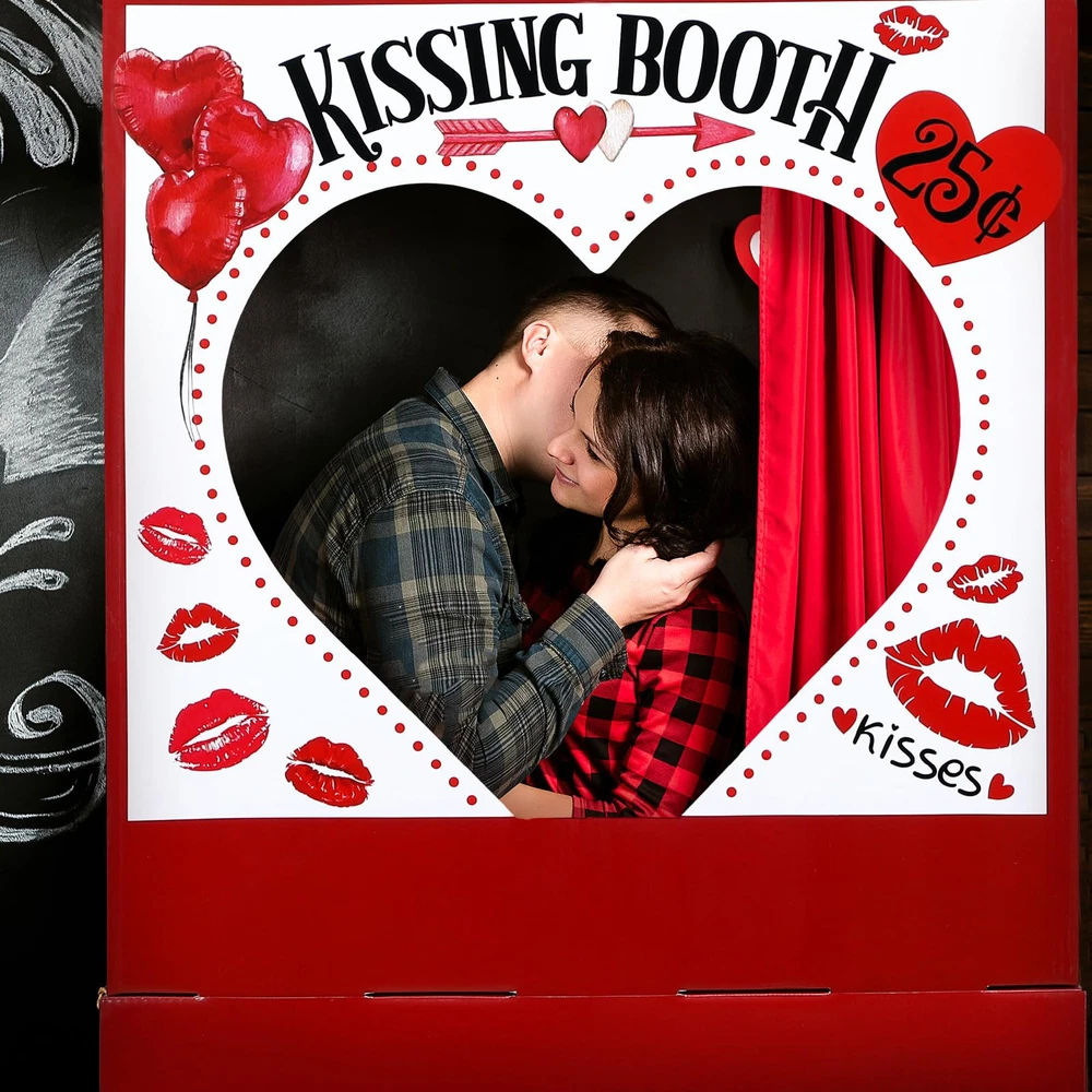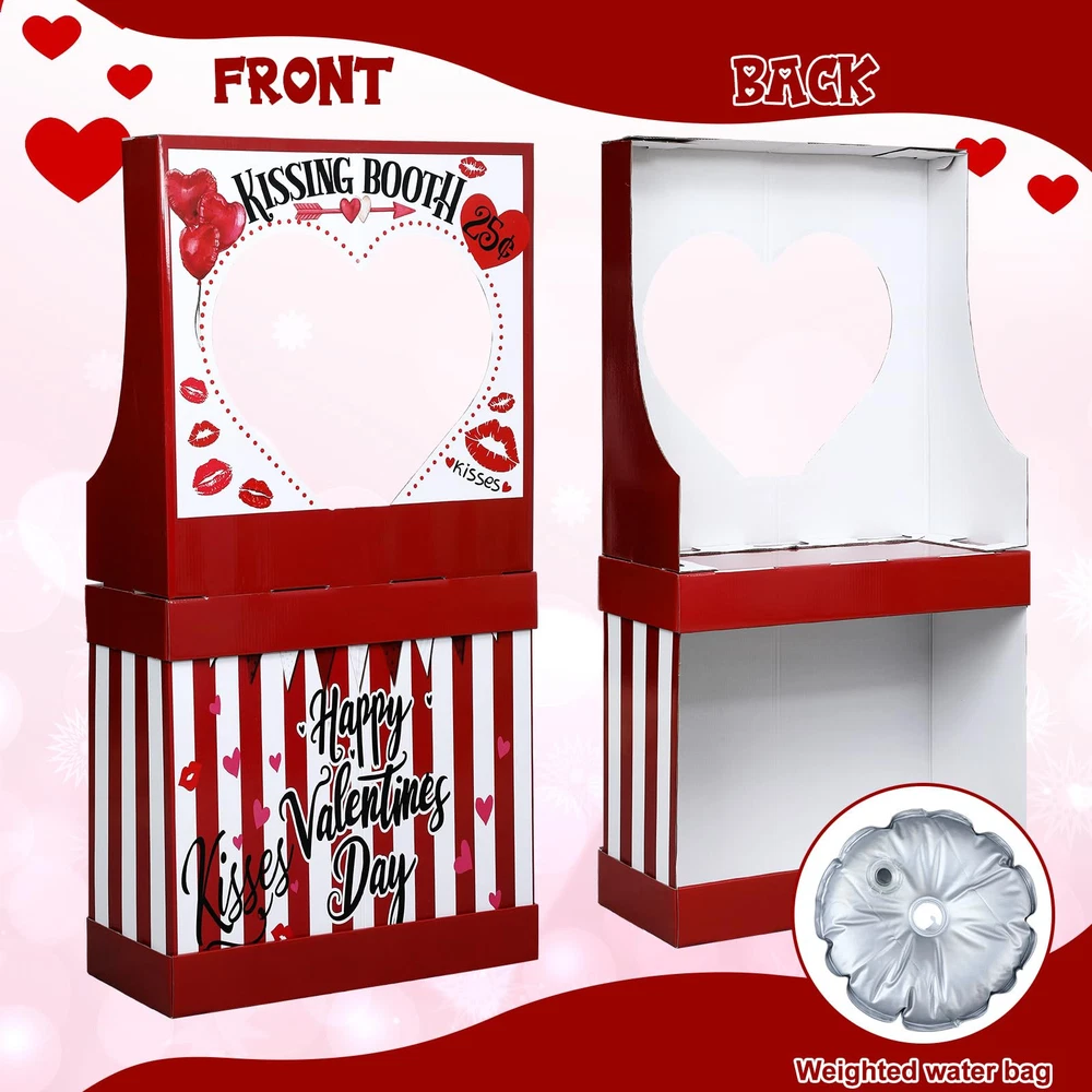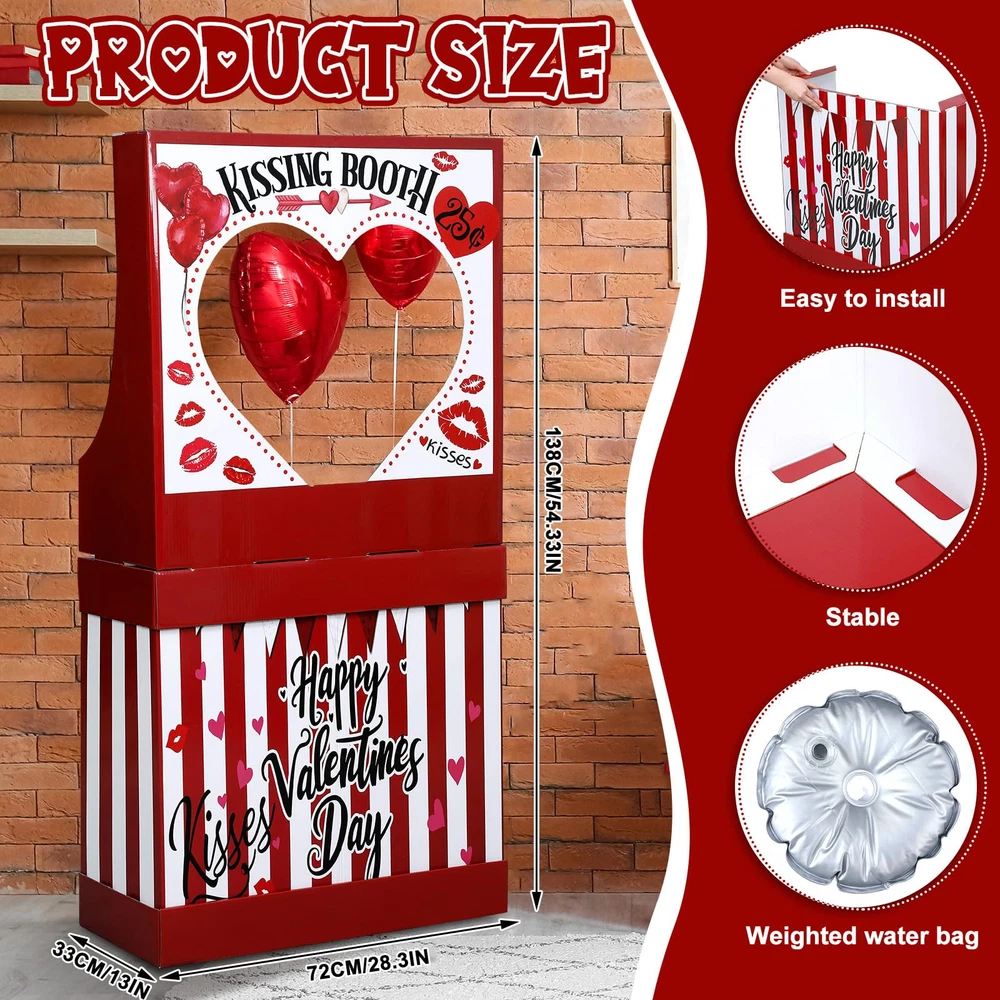 Features: Fandom Outlet with a Romantic Twist Our kissing booth sign satisfies fandom enthusiasts with its photo-realistic design and quality build. Whether it's for a romantic Valentine's day setup or a striking display for carnivals, this Valentine's kissing booth stand is a charming addition to your décor. Artistry, Convenience, and Versatility, All in One Adding a beautiful combination of artistry, convenience, and versatility, our carnival ticket booth is a favorite among fans, marketers, and event planners. Its striking design and easy setup make it an effective tool for creating a uniquely engaging and romantic atmosphere. Specifications: Material: Cardboard Color: red and white Size: 54.33 x 28.35 x 12.99 Inches (H*D*W) Package includes: 1 PCS Cardboard Kissing Booth Stand Notes: Manual measurement, please allow slight errors on size. The color may exist a slight difference due to different screen displays. Valentine's Day Decorations: Experience Valentine's Day with our Cardboard Kissing Booth stand. With its vibrant red and white hues, this one-of-a-kind decoration will instantly make your celebration more romantic. Its cute and playful design will beautifully capture the essence of the occasion, making this kissing booth the heart of your party Impressive Size: Our Valentine's Day Cardboard Stand Decoration takes pride in its large size, measuring approximately 54.33 x 28.35 x 12.99 inches. This kissing booth is designed to capture attention even from afar, ensuring that your display will be noticed Easy Setup and Stability: Our kissing booth prop is skillfully cut to provide a 3D effect, presenting a visual appeal for your celebration. It's straightforward to assemble, backed with strong cardboard for support. Plus, it comes with a water-filled weight bag to keep your kissing booth stand secure and stable against wind and crowds Photo Prop: This kissing booth stand is not just a decoration but a nice photo prop as well. It provides an ideal setting for capturing unforgettable moments on Valentine's Day. Share your sweet memories on social media, letting your friends, family, and even customers see the fun and love shared on the day Portable Decoration for Any Occasion: Our lightweight and easy-to-move cardboard kissing booth stand fits effortlessly into any space. It's not only suitable for Valentine's Day but also an excellent choice for carnivals and ticket booth prop. It's a favorite among event planners for its versatility in doubling as displays and point-of-sale marketing tools