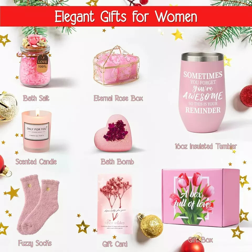 đăHeartfelt Valentines Day Gift for Heră The meticulously curated gift boxes are devised to forge a memorable and delightful day, bringing a beaming smile. Ideal for demonstrating your abundance of love and appreciation. Excellent gifts for wife, mom, grandma, girlfriend, daughter, sisters, friends, teachers, colleagues, and more. Great womens gifts for Valentine, Valentines Day gifts for women wife girlfriend đăStress Relief Spa Gift SetăTreat your loved ones to the ultimate relaxation experience with our spa gifts for women. Immerse her in the serene aromas of sea salt, bath bomb, and soy wax candle. Crafted from natural ingredients, including 100% soy wax and essential oils, allow her to indulge in a rejuvenating spa retreat that soothes the senses and revitalizes the spirit đăRadiate Love and Warmth Valentine Gift BoxăThe premium 16oz vacuum-insulated coffee cup is crafted from 18/8 food-grade stainless steel, ensuring her favorite beverage maintains the ideal temperature. Paired with soft fuzzy socks and adorned with a heart-shaped box of preserved rosesâan expression of everlasting love đăGifts for Women on Any OccasionăMake her day brighter and unforgettable! The gift box labeled "A box full of love,", the coffee mug is embellished with the message "SOMETIMES YOU FORGET YOU'RE AWESOME", showing love, thoughtfulness and a warm reminder to inspire her. Great gift baskets for women for any occasions on Valentine, Christmas, birthday, Mothers Day, thinking of you, get well, thank you, I love you, anniversary, retirement, Thanksgiving, and more đčăCharming Scented Roses Soap BoxăIndulge in the delicate charm of our Scented Roses Box! Crafted in the likeness of a real rose and nestled within a charming heart-shaped gift box, it's a beautiful decoration to add a touch of romance to any room without the concern of wilting. Paired with a greeting card that serves as a heartfelt conduit for conveying sentiments of love and joy đăConvey Happiness and AffectionăEach item is carefully selected to delight, including a pink gift baskets, 16oz insulated coffee mug, fragrant soy candle, preserved roses in a heart-shaped gift box, scented sea salt, scented bath bomb, snug fuzzy socks, gift card. Valentines Day gifts for her, birthday gifts for women, Mothers Day gifts, get well gifts for women, thank you gift, I love you gift, anniversary gift, retirement gifts