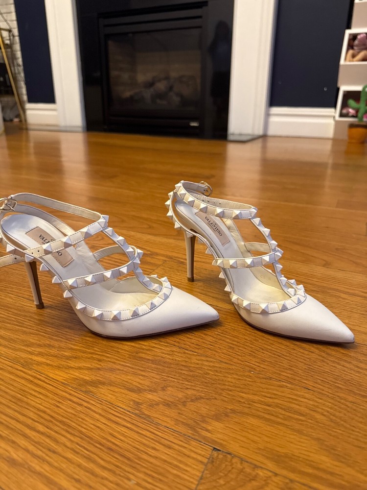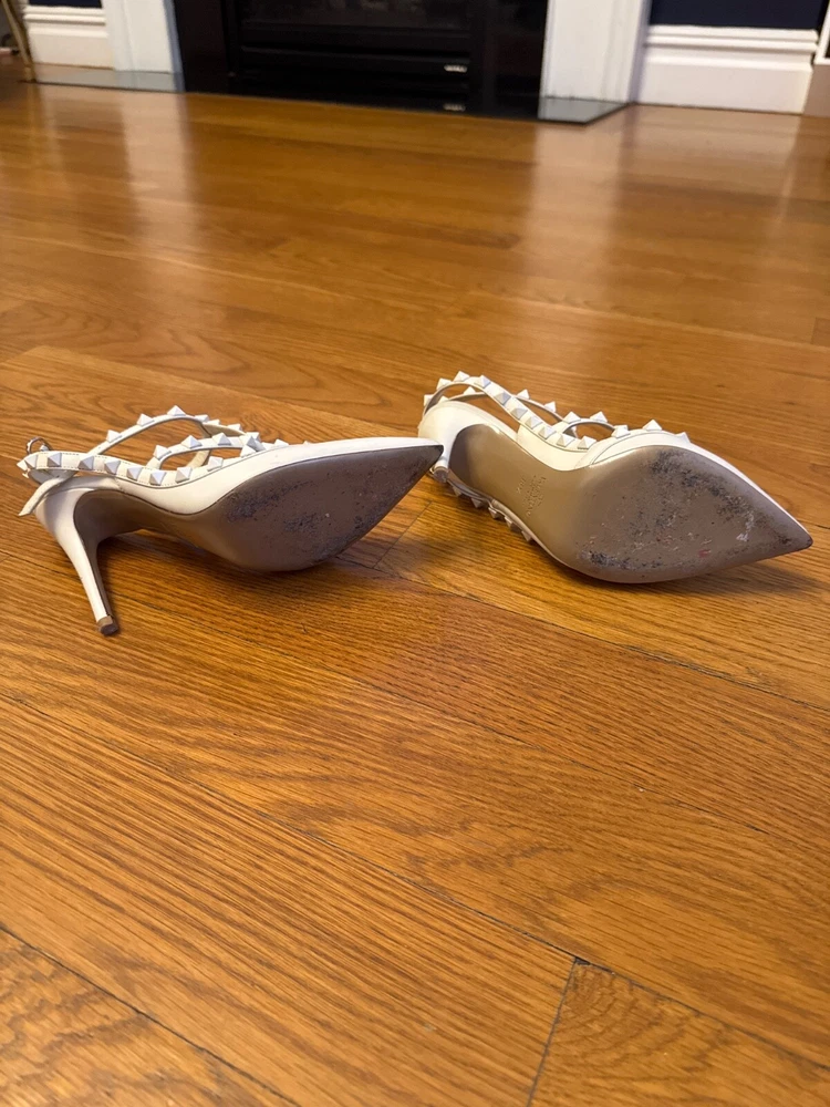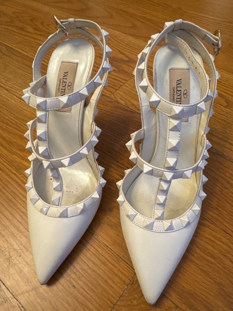 1. These Valentino Rockstud Heels in off-white are absolutely stunning! The perfect mix of elegance and edge, they instantly elevate any outfit. The 36.5 fits true to size and feels surprisingly comfortable for heels this chic. The iconic stud detailing adds just the right amount of glam without being overpowering. I love how versatile they are - equally perfect with jeans for brunch or a little black dress for date night. The quality is impeccable, exactly what you'd expect from Valentino. After wearing them all night, my feet weren't screaming to take them off - a miracle for designer heels! Already planning my next outfit to show them off again. Worth every penny for this timeless investment piece.