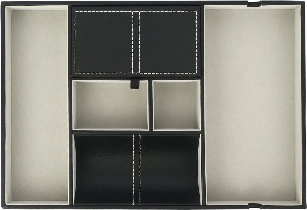 Number Of Pieces: 1 Target Audience: Men Special Feature: Nightstand Organizer, Gifts For Young Men Under 25 Inner Material: Suede UPC: Does Not Apply Item Package Quantity: 1 Department: Men Color: Black Product Dimensions: 9.6"d X 13.75"w X 1.6"h Number Of Compartments: 5 Special Features: Nightstand Organizer, Gifts For Young Men Under 25 Shape: Rectangular Batteries Required?: No Jewelry Storage Type: Jewelry Tray gtin13: Does Not Apply Brand: Unbranded Finish Type: Polished Batteries Included?: No Number Of Items: 1 Material: Faux Leather, Suede Occasion: Engagement, Mother's Day, Wedding, Birthday Mounting Type: Table Top Finish: Polished Item Weight: 1.5 Pounds Type: Details In Description Style: Large Recommended Uses For Product: Ring Theme: Gift