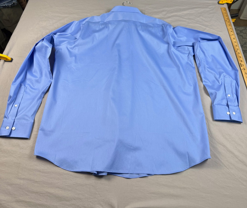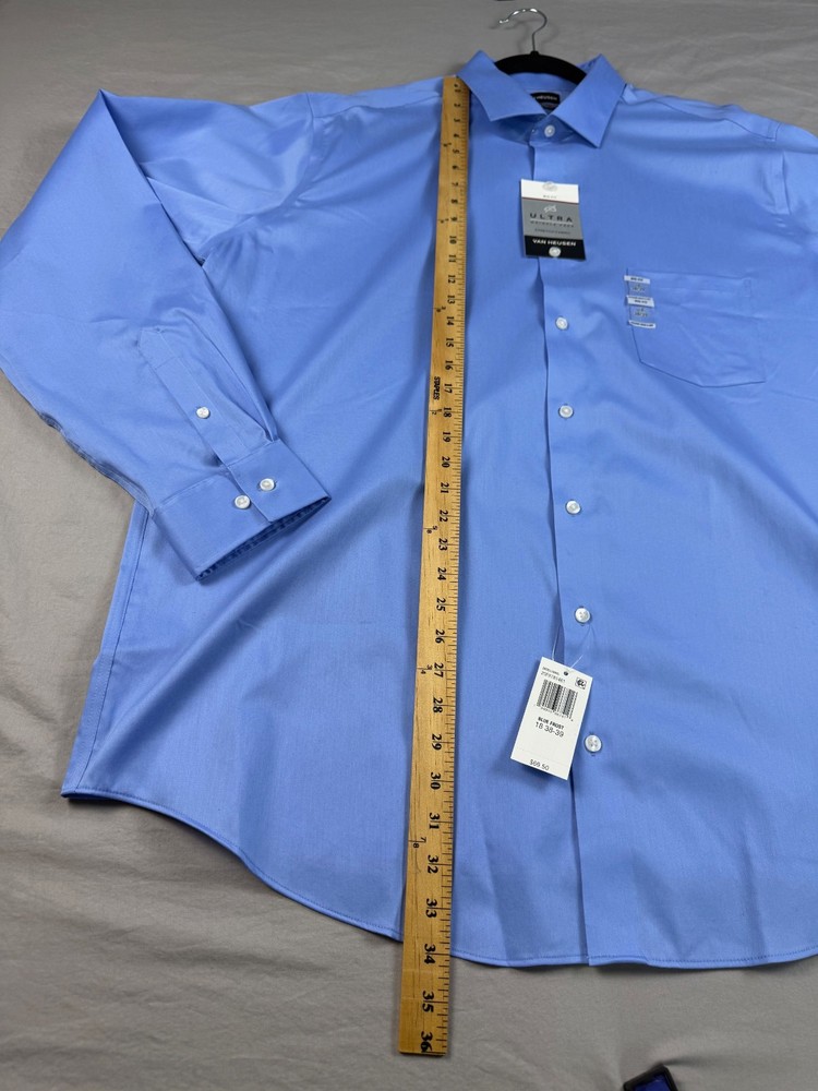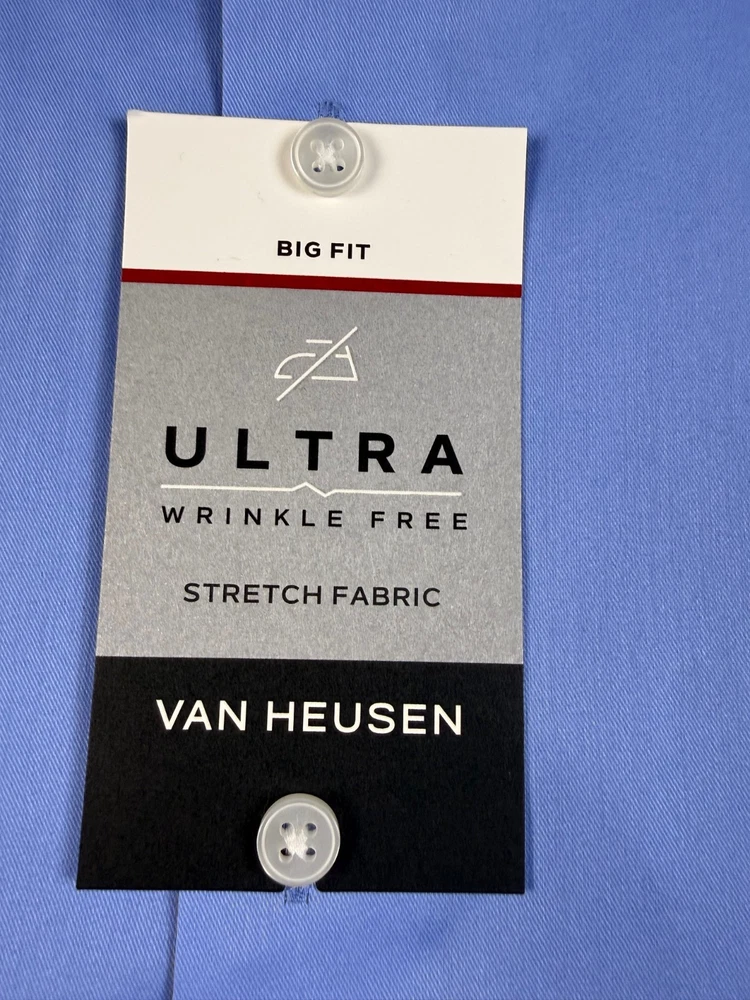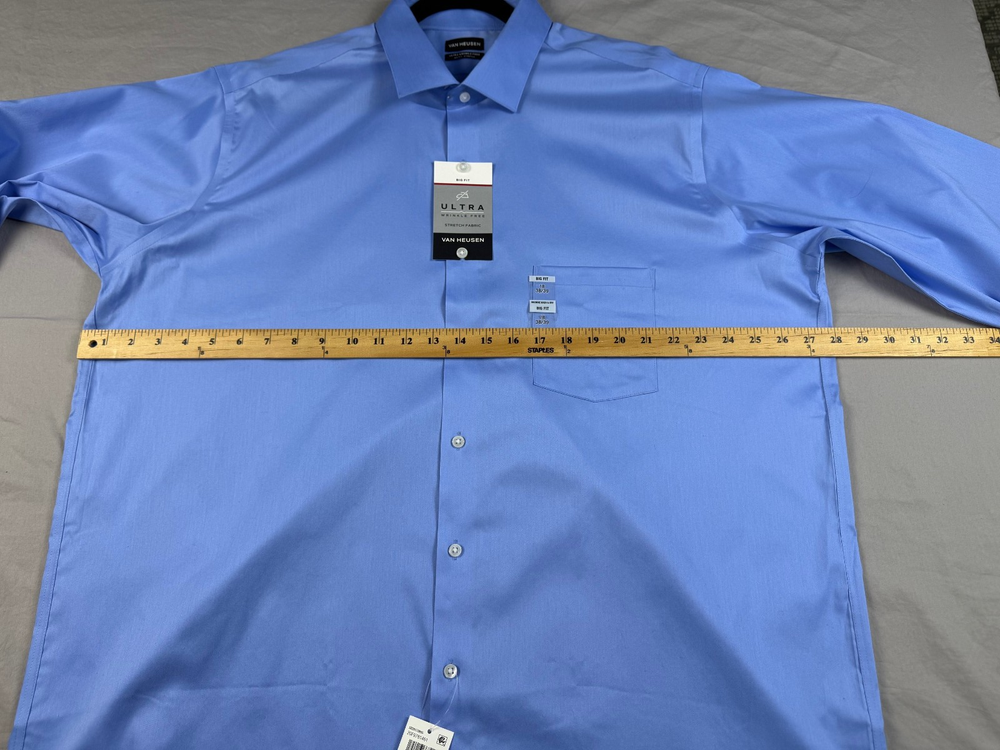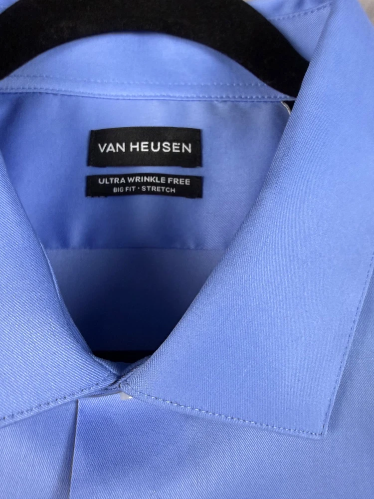 The Van Heusen Big Fit dress shirt in size 18 with a chest size of 56 inches is a stylish and versatile option for both casual and business occasions. Made from a comfortable cotton blend fabric, this shirt features a solid blue color, collared neckline, button closure, and long sleeves with a barrel cuff style. The regular fit and big and tall size make it a flattering choice for men looking for a high-quality and wrinkle-free shirt. Perfect for adding a touch of professional flair to any outfit. See pics for measurements.