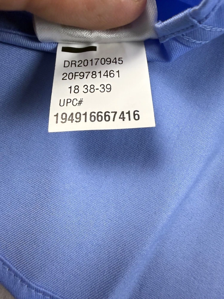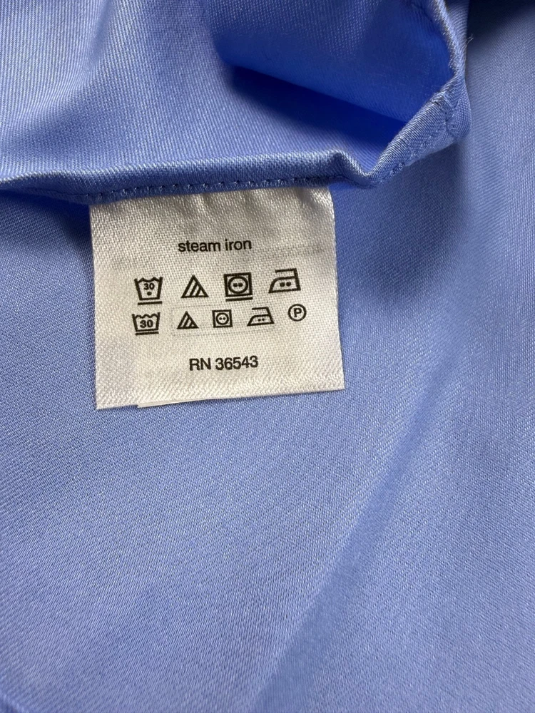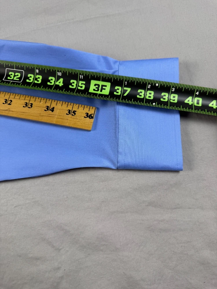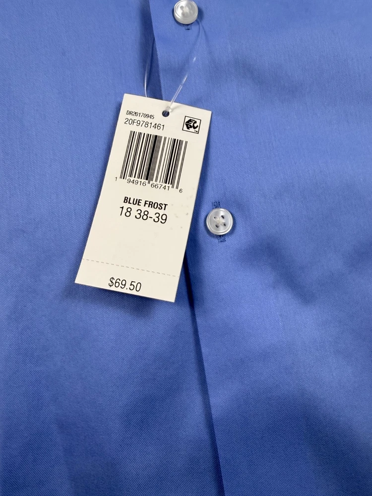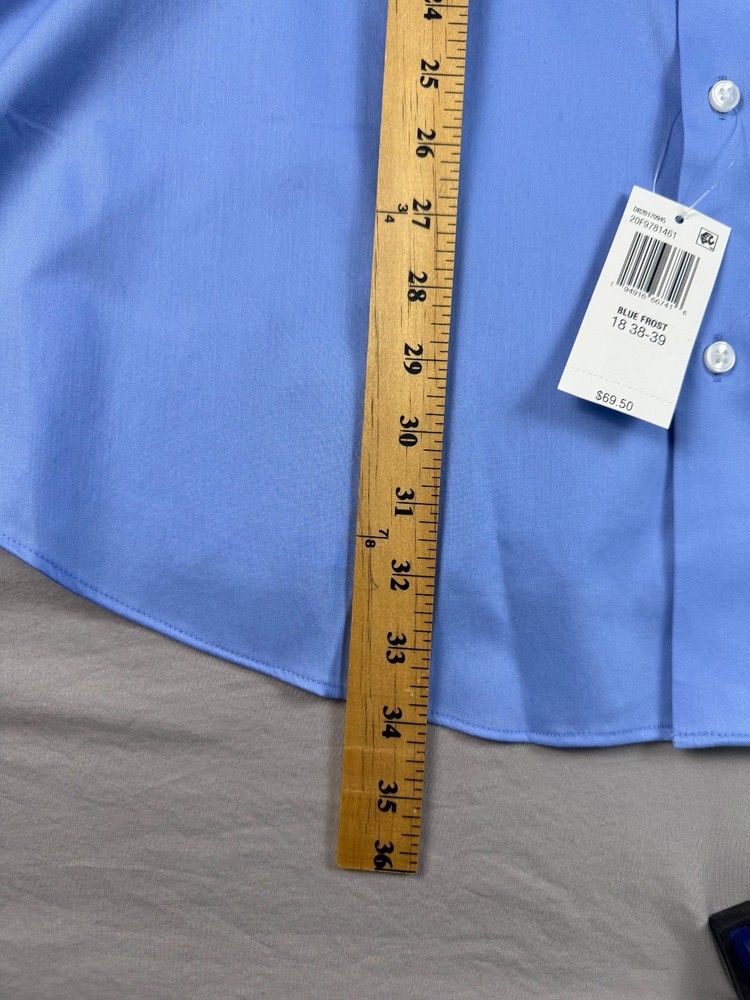 The Van Heusen Big Fit dress shirt in size 18 with a chest size of 56 inches is a stylish and versatile option for both casual and business occasions. Made from a comfortable cotton blend fabric, this shirt features a solid blue color, collared neckline, button closure, and long sleeves with a barrel cuff style. The regular fit and big and tall size make it a flattering choice for men looking for a high-quality and wrinkle-free shirt. Perfect for adding a touch of professional flair to any outfit. See pics for measurements.