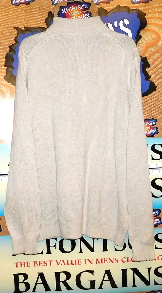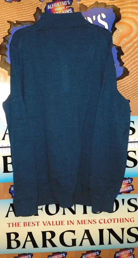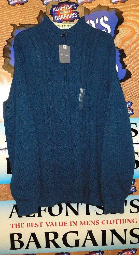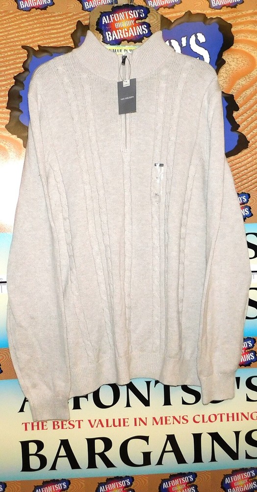 YOU SNOOZE YOU LOSE SALE Van Heusen 1/4 Zip Mock Neck Sweaters. Beautiful Cable Knit front motif. Medium-heavy weight warmth Machine washable. Stock photos representative of color and style, not size. Elevate your wardrobe with the classic comfort of Van Heusen's cable knit sweaters, designed for the modern man. These pullovers feature a versatile mock neck with a convenient 1/4 zip closure, perfect for quick layering or a touch of sophistication. Crafted with a cozy blend of 60% cotton and 40% polyester, they promise to keep you warm without compromising on style. With their long sleeves and distinctive cable knit pattern, these sweaters are an ideal choice for a range of occasions. Meticulously made in Jordan, they reflect the brand's commitment to quality and enduring style. Whether dressed up for the office or styled casually for a relaxed weekend, these sweaters offer the perfect combination of warmth and elegance.