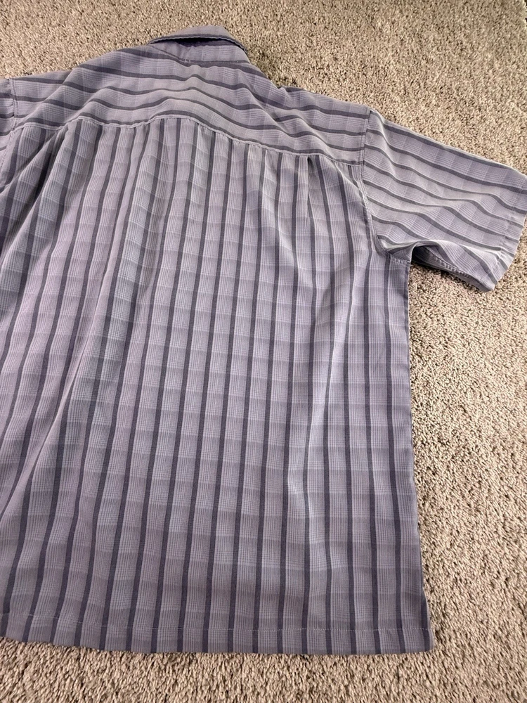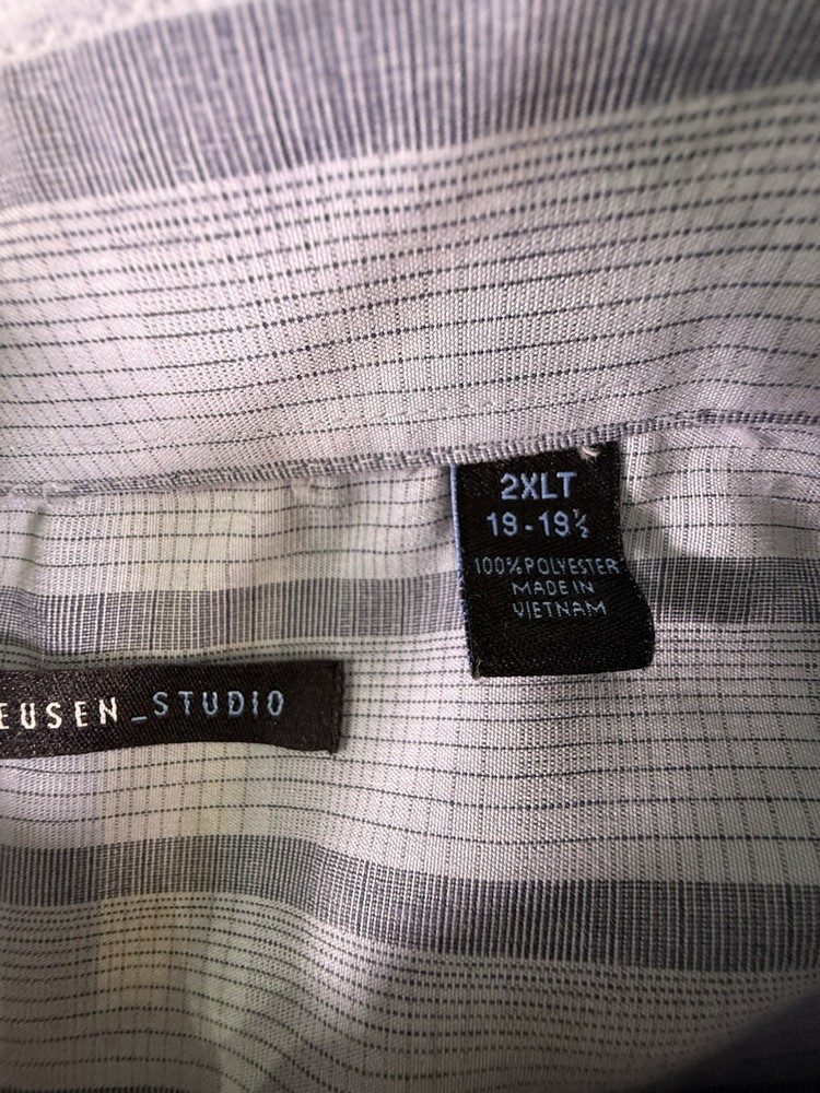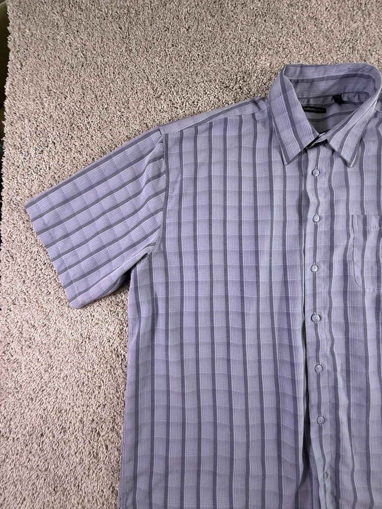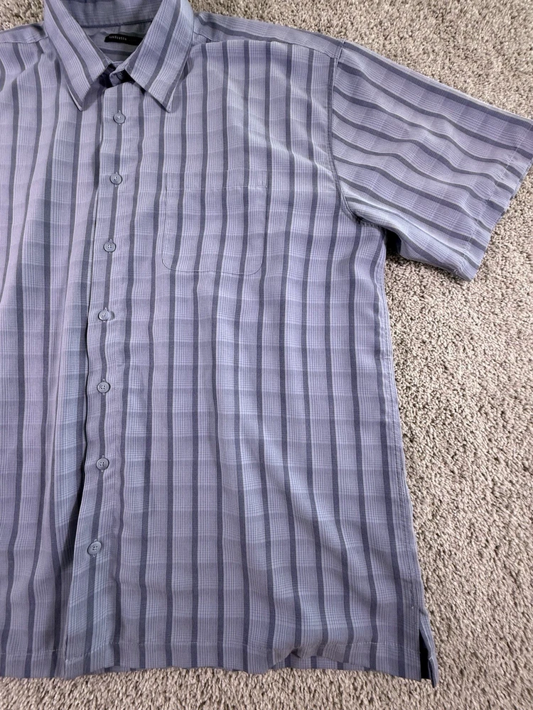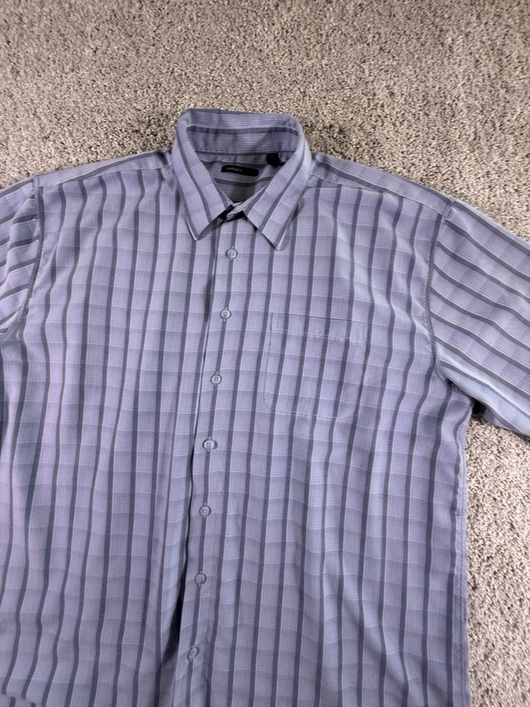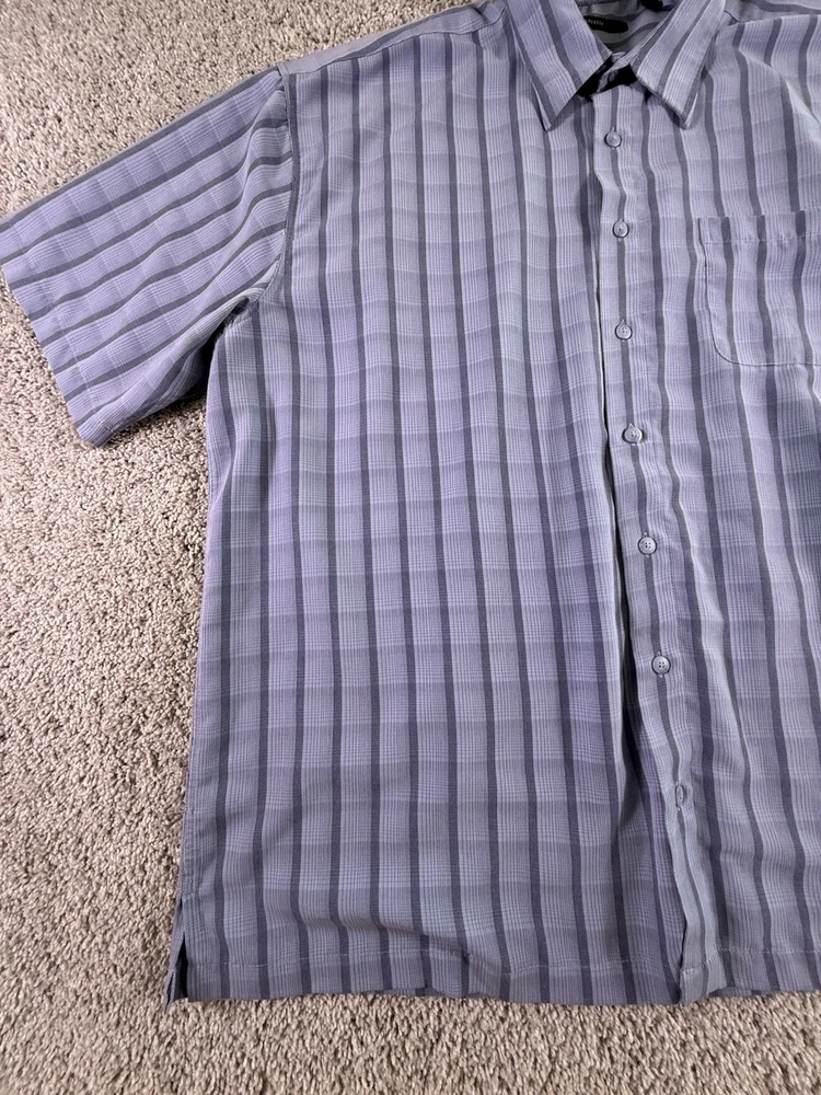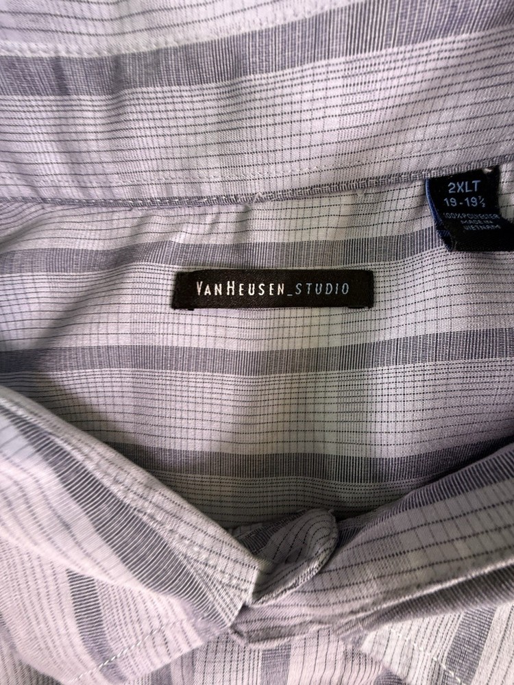 The Van Heusen Studio Men’s Short Sleeve Button Down in Blue Gray Check is a stylish and versatile dress shirt perfect for big and tall men. Made from durable polyester material, this shirt features a classic collared neckline with a button-down closure for a polished look. The gray check pattern adds a touch of sophistication, while the machine washable design makes it easy to care for. Perfect for various occasions, this regular fit shirt from the reputable brand Van Heusen is a must-have addition to any man's wardrobe. 5138