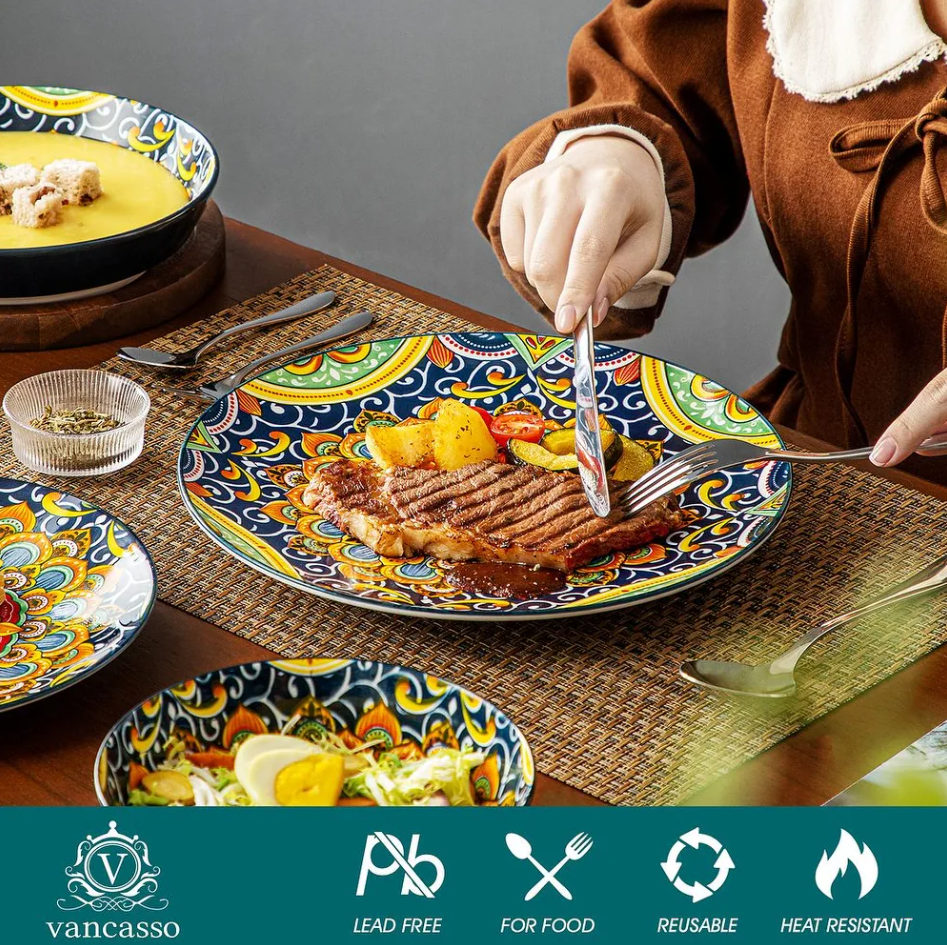Details: The vancasso SIMI Porcelain Dinnerware Set is a beautiful and functional addition to your dining experience. Eclectic designs inspired by traditional Bohemian art,this set features four different colors added to the classic charm of the popular. Features: The dinnerware is made from high-quality porcelain Available in 24 or 48-piece set. Lovely embellishments for pop of classic charm Microwave, freezer, dishwasher and oven safe The set is designed to provide everything needed for a complete dining experience. Set Includes: Dinner Plates: 0.9"H x 10.5"L Dessert Plates: 0.8"H x 8.5"L Bowls: 2.7"H x 6.3"L ,26 Oz. Pasta Bowls:1.7"H x 8.25"L ,32 Oz.