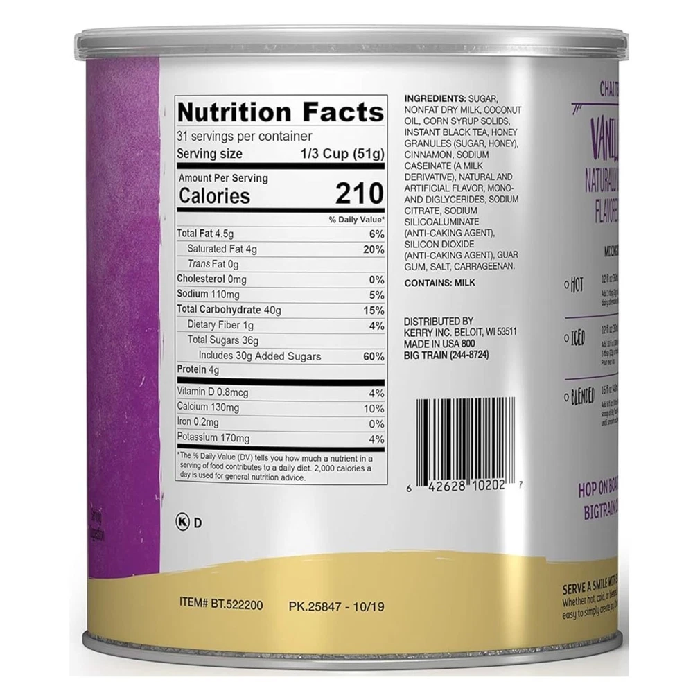 Enjoy a creamy blend of honey, vanilla, black tea and exotic spices. Delicious hot of iced. Just add water. Drink chai, embrace life. Be inspired, refresh your body and soul. 99.8% caffeine free. Made in USA. Vanilla Chai: Our Vanilla Chai Tea Mix is made with a blend of milk, honey, black tea and spices for a vanilla chai tea latte that you can mix in an instant. Drink hot and steamy or pour over ice for the best chai latte Wherever Beverages Are Served: Vanilla Chai Mix is ideal for home kitchens, office kitchens, cafés, coffeeshops & restaurants. Our Vanilla Chai Mix makes it easy to enjoy chai tea lattes wherever you are - just add water, mix and serve Blend, Pour, Serve: mixes make it easy to serve up delicious drinks. From our variety of chai lattes, to our blended crème and coffee frappes, provides quick to prepare beverage solutions for coffee shops, restaurants and at home Try Every Flavor: Our entire line is crave-worthy. Seasonal delights like Spiced or Vanilla Chai Tea Lattes, classic Blended Ice Coffee, kid-friendly and more – mixes come in all kinds of on-trend flavors to satisfy any kind of appetite Quality: Better beverages are a blend away. For over 30 years, has made it easy to provide high quality beverages made with people and the planet in mind. We're committed to consistency and sustainability in each mix we create
