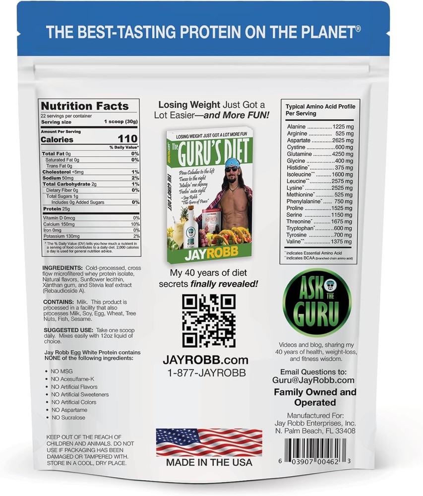 JAYROBB Whey Vanilla Isolate Protein Powder, Low Carb, Keto, Vegetarian, Gluten Free, Lactose Free, No Sugar Added, No Fat, No Soy, Nothing Artificial, Non-GMO, Best-Tasting (24 oz) Grass-Fed Specs Brand JAYROBB Flavor Vanilla Item Weight 1.5 Pounds Material Type Free Gluten Free Features Includes 1 (24 oz) Jay Robb Vanilla Whey Isolate Protein Powder. 25g of cold-processed cross-flow microfiltered Whey Protein Isolate, 0g Fat, 2g of Net Carbs, <1g of Sugar, 180mg Potassium, 110 Calories per serving Farm Raised Pasture Grazed Cows, NO Fat, NO Soy, NO Added Sugar, NO MSG, NO Casein, NO Artificial Ingredients, Gluten Free, Lactose Free, Non-GMO, Low Carb, KETO, VEGETARIAN Whey Protein helps build muscle faster, repairs and nourishes your body, and supports metabolism. Perfect when you are on-the-go or looking for a quick and outrageously delicious meal or snack. Perfect for Men and Women (on-the-go meal or snack), Teens (can assist in reducing acne), Kids (nutritious snack during the day). Easy to Mix with milk, water, juice or your favorite liquid. Blend with fruit, nuts, seeds, veggies, and/or starch for a delicious and nutritious meal replacement