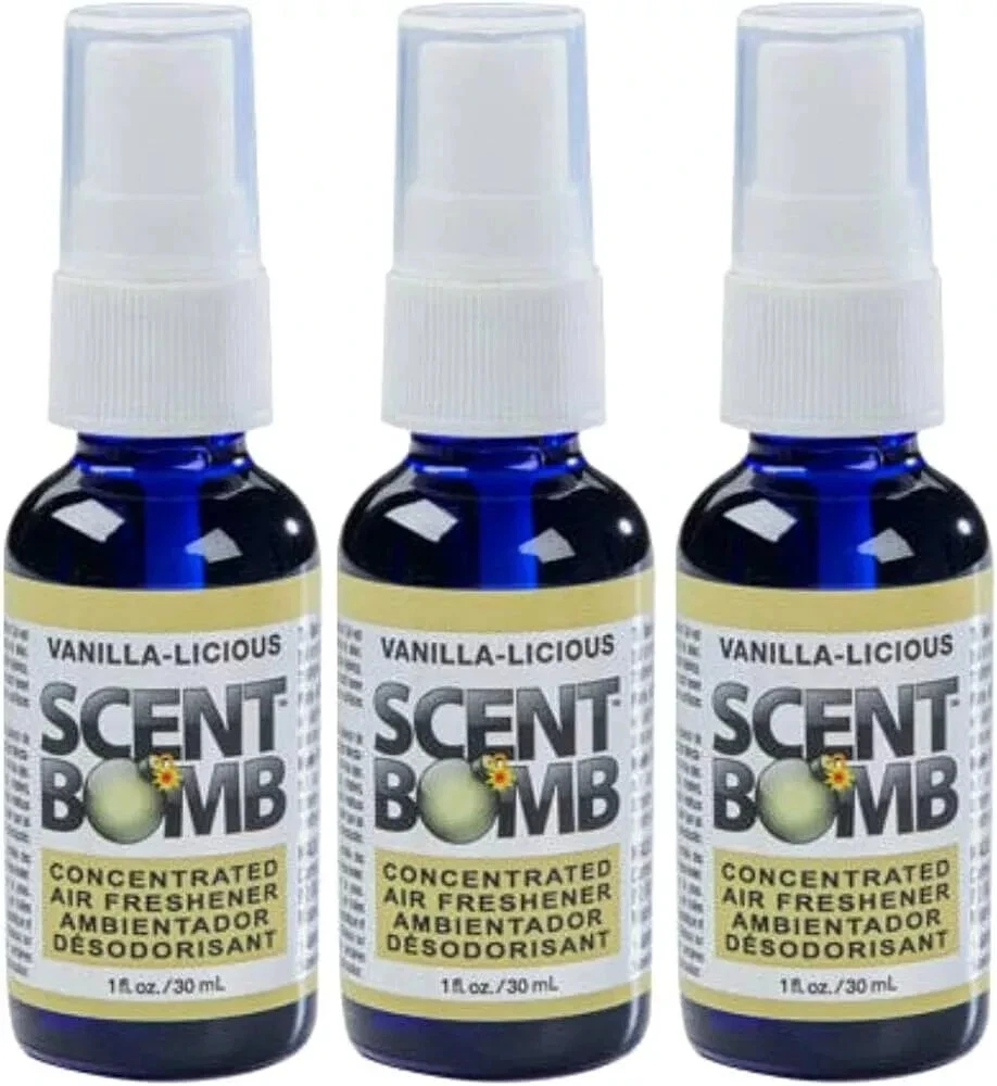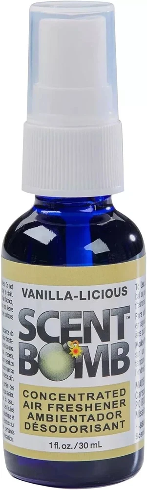 Scent Bomb 100% Oil Based Concentrated Air Freshener Spray, Vanilla-liscious , Pack of 3 Scent Bomb Air Freshener Spray, Vanilla-liscious 3 Bottle Product Info Scent Bomb air freshener spray refreshes your car, home, and anywhere you want to mask odor. Our air freshener spray is oil based, that is designed for its long lasting fragrance that will give you a fresh and calming ambience. This is intended to fill your home, car, or office with incredible scents that covers all types of odors and smells. Made in the USA. Just a few sprays and it will last for days! Features QUALITY FORMULA: Scent Bomb air freshener uses a scented oil-based formula that is created for long lasting fragrance that will give you a fresh and calming ambience. Just a few sprays and it will last for days! HOME AND CAR AIR FRESHENER: This air freshener spray is ideal to refresh your car, home, room, or office with incredible scents that eliminate all types of odor and smells! LUXURIOUS SCENTS: Scent Bomb air freshener will help you relieve stress, help you stay alert, and improve your mood. Remove odor and freshen your life that gives you a pleasant scent. PACKAGE CONTENT: Each pack contains Vanilla-liscious , 1 fl.oz. spray air freshener bottles. Great use for car freshener, room spray, bathroom spray, or spray for your gym bag! A great air freshener for home, work or on the go! TRUSTED BRAND: All Scent Bomb Air Fresheners are made in the USA and designed for its long lasting fragrance. A great air freshener spray for your car and home
