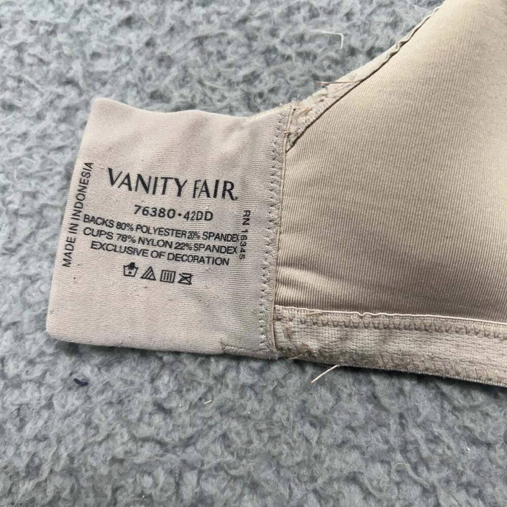 Material: Nylon Blend Strap Type: Bra Strap Band Size: 42 Vintage: NO Type: Bra Department: Women Closure: Hook & Eye Opacity: Opaque Cup Size: DD Size: 42DD Season: Spring, Summer, Fall, Winter Country/Region of Manufacture: Indonesia Fabric Type: Woven Garment Care: Hand Wash Only Color: Beige Style: Full Coverage Pattern: Solid Product Line: 76380 Brand: Vanity Fair Underwire Type: Underwired