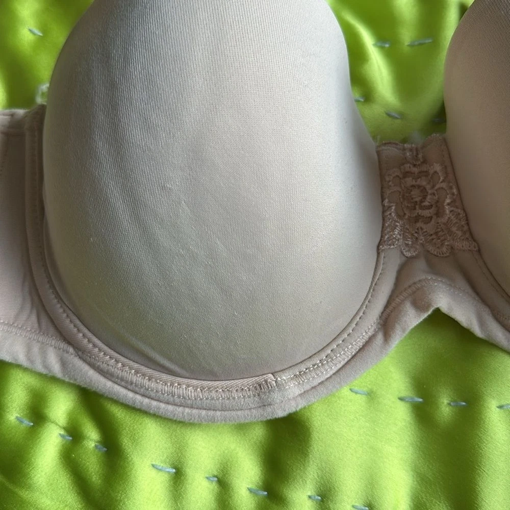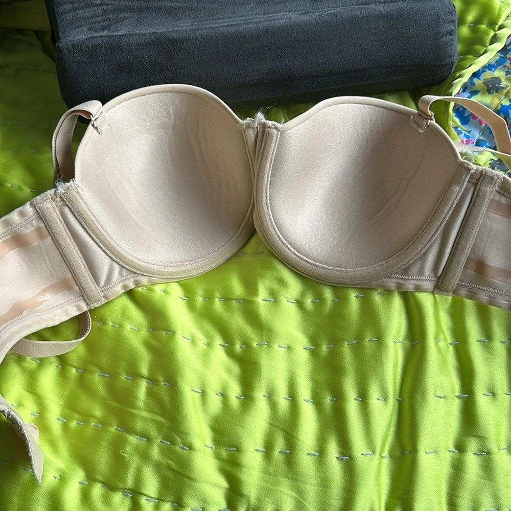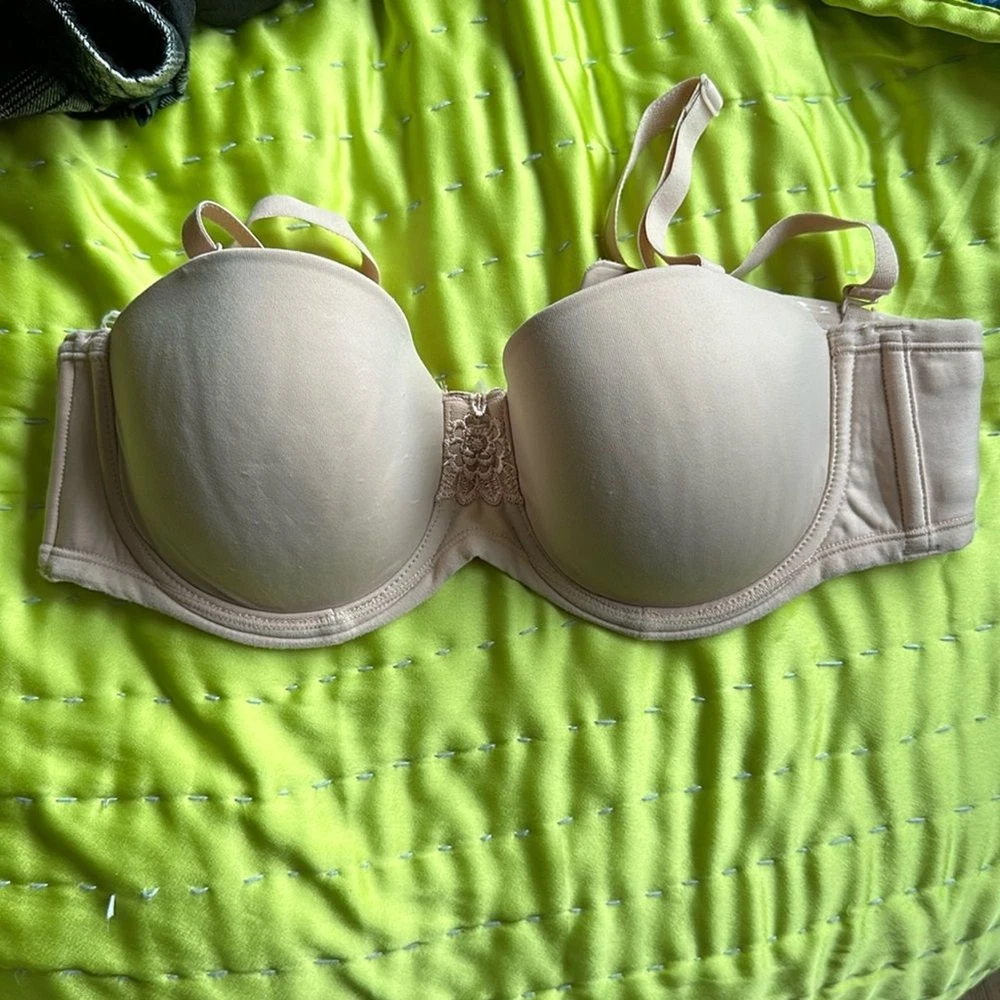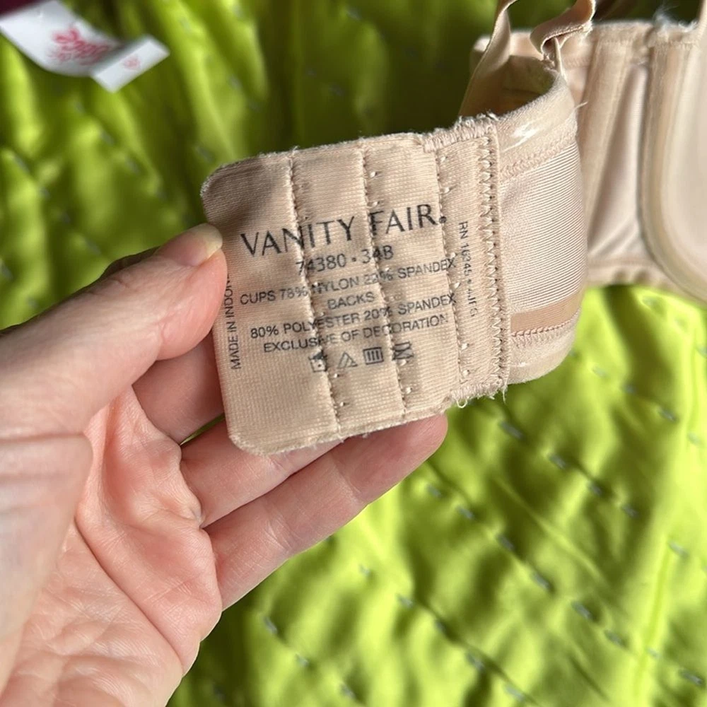 Vanity Fair Beauty Back Strapless Bra. hook and eye closure, adjustable straps, full coverage, and is underwired for extra support. Beige 34b GUC - some piling and loose threads