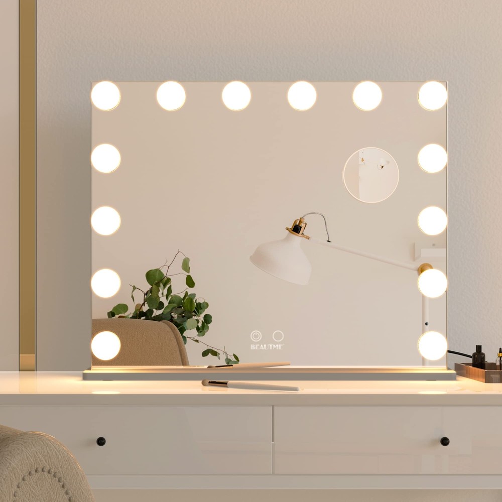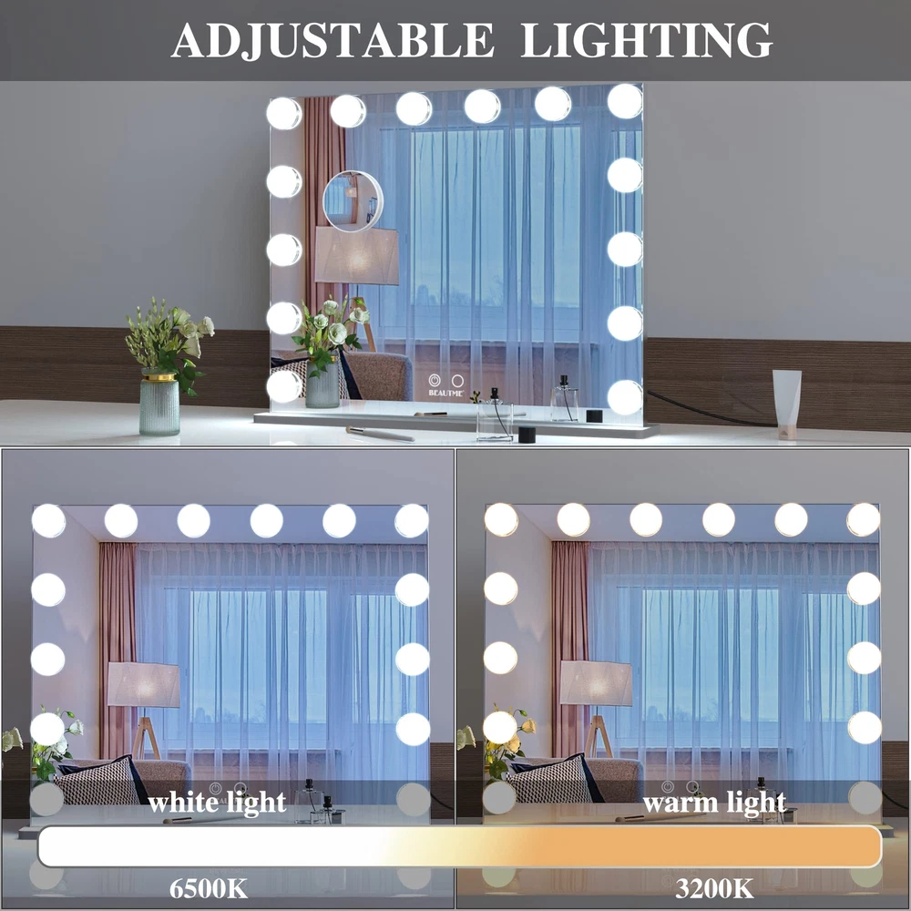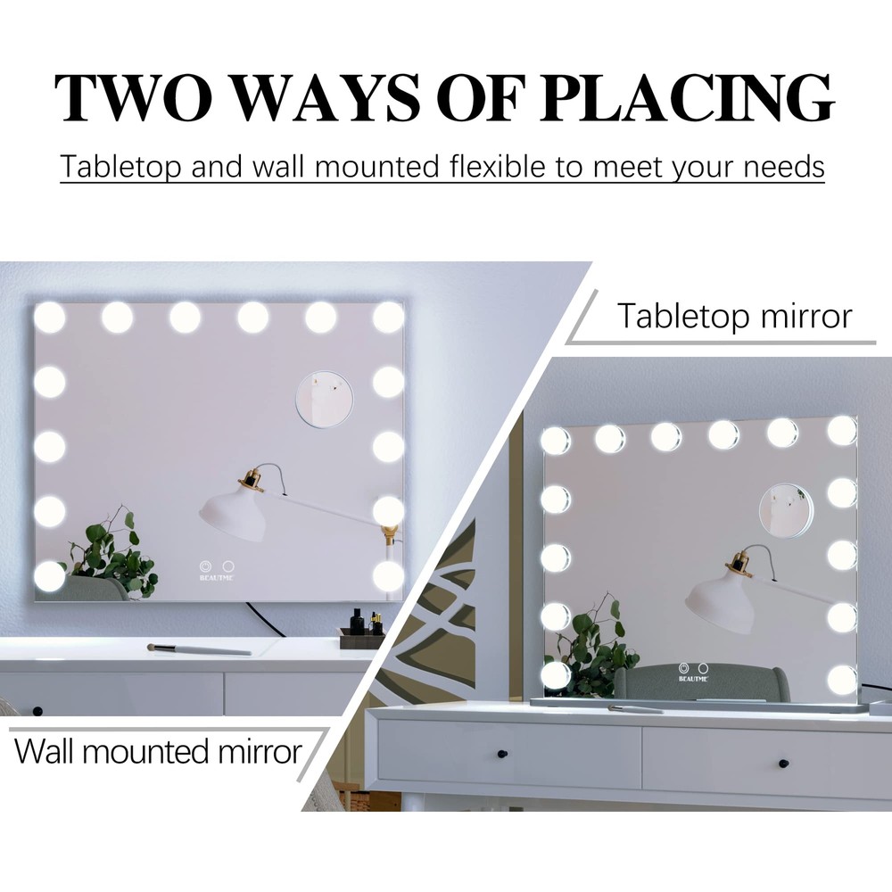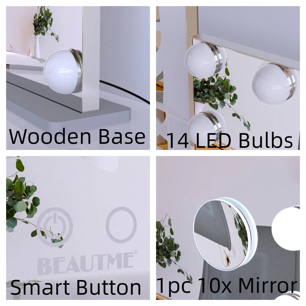 Large Size & Frame Design: Optic mirror 23.62''(L) x 19.69''(W) and overall frame,Strong, solid feel with metal frame, Gorgeous and superior reflective mirror built to last with top quality material. Vanity mirror for easy to use - Plug and play with the included 12V 1A adaptor. LED mirror with smart touch control and memory function. 2 Kinds of Setting Up, Wall Mounted / Tabletop Vanity Mirror. The Makeup Mirror Is Versatile Since It Can Be Placed on a Makeup Desk or Hung on The Wall,The Wooden Base is Easy to Install. Large Long Lasting Countertop / Wall Mirror. Optic Mirror 600mm(Width) X 500mm(Height) And Overall Frame, Strong, Solid Feel with Metal Frame And Wooden Base, Gorgeous And Superior Reflective Mirror Built to Last with Top Quality Material,No Need to Exchange The Bulbs. 14pcs Hollywood Vanity Mirror Led Lights and 1pcs 10X Round Mirror.Surrounded by 14X1.2W Led Lights, with Warm Light ( 4000K Color Temperature) / Daylight (6000K Color Temperature) Settings.Bulbs Provide Enough Brightness to Makeup in Dark. It Is Soft and Not Dazzling. A Good Gift for Family And Friends: for Women And Girls, Having Such A Make-Up Mirror Is Their Own Dream.With The Lighted Vanity Mirror, We Can Get A Better View of What We’Re Doing And This Is The Main Purpose of Such A Lighted Mirror-To Recreate The Natural-Lighting Environment We Need for Applying A Flawless Makeup.
