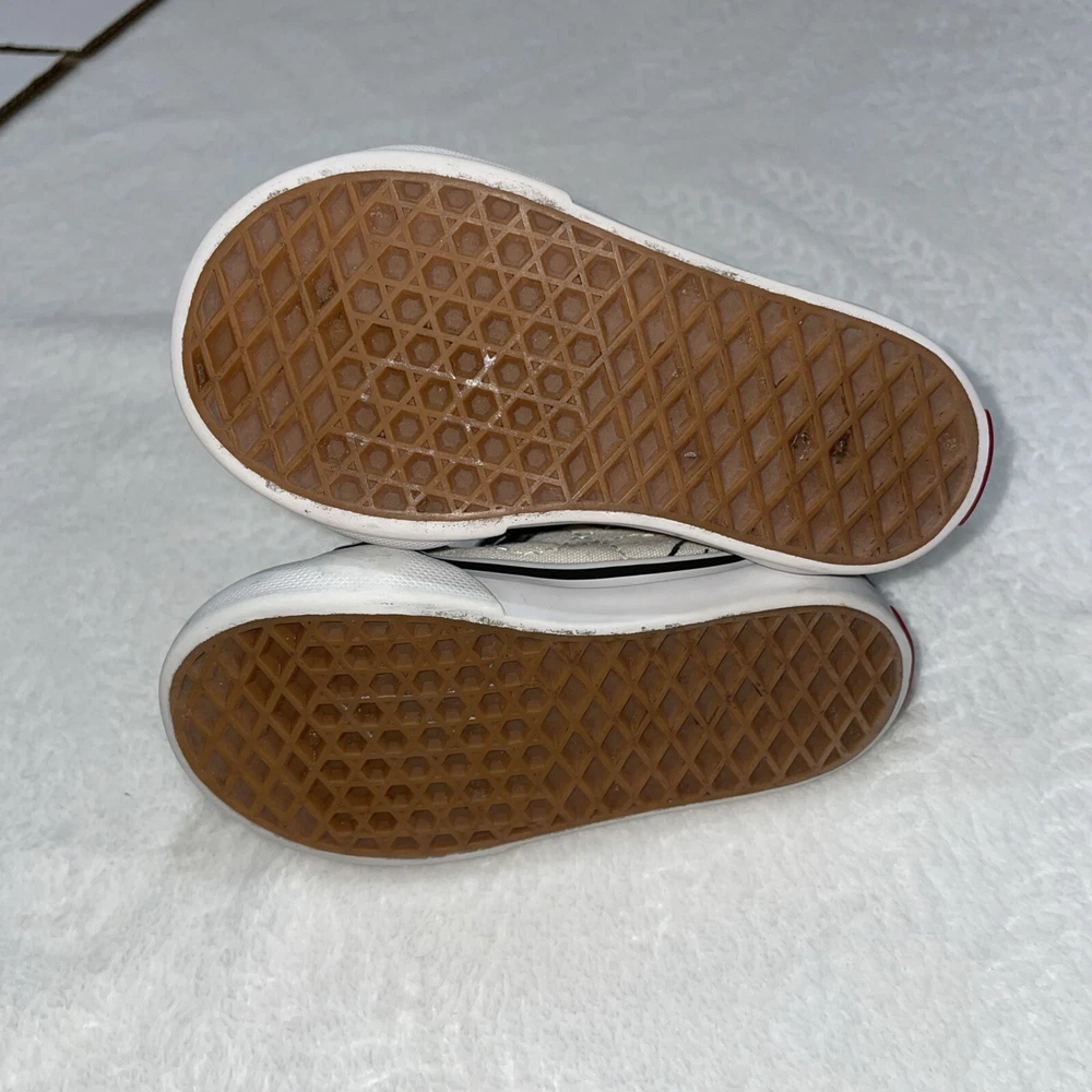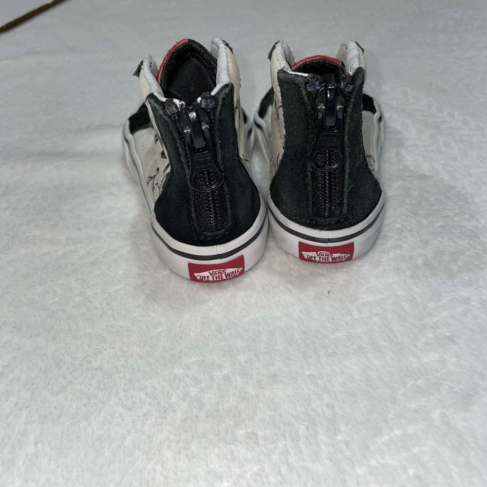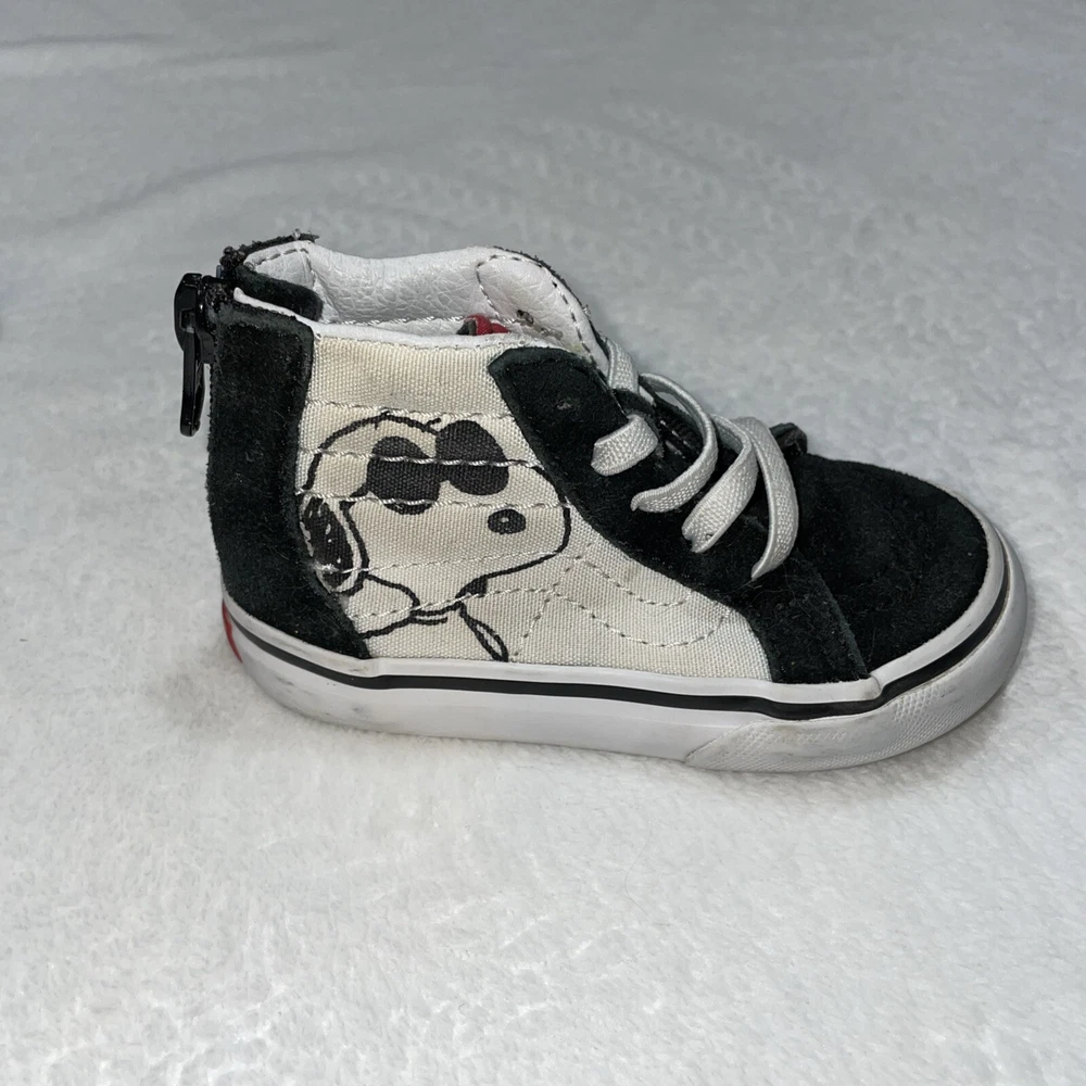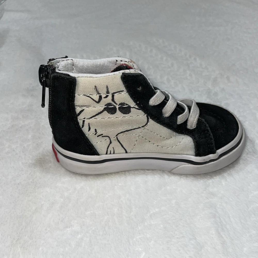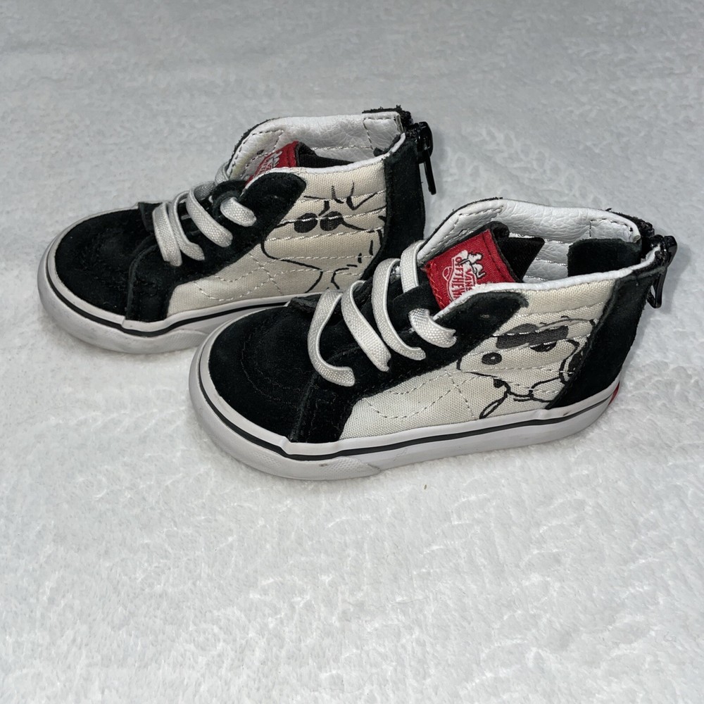 The Vans 2017 PEANUTS Snoopy Woodstock SK8 Zip Up Toddler 5 sneakers feature a Round Toe design with Elastic Shoelaces and a Zip closure for easy wear. These Unisex Kids shoes in Black/White showcase a Snoopy theme from the Peanuts character family. Made with Canvas and Suede materials, they are part of the VANS Sk8 product line, manufactured in Vietnam in 2017. Perfect for little ones, these athletic sneakers embody a playful and comfortable style for young fans of the iconic Snoopy and Woodstock characters.