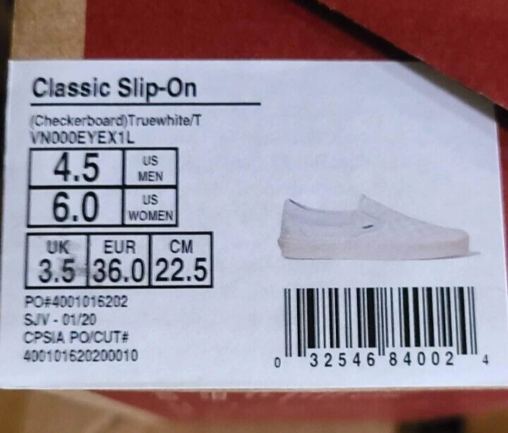 Item available today is the, Vans VN000EYE Classic Slip On White Checkered Shoes Men's SZ 4.5, Ladies SZ 6 . This is a new pair of shoes, ready to wear . Please see photos for more details. Items in photos are what come with the listing. Thank you for shopping small business. There are other sizes available in our store. Terms of Sale Listing is for item and/or accessories shown in photos only. Some states may require a tax be charged at the time of checkout, this is eBay automated. We ship and answer questions Mon-Fri 8am-4pm EST We stand behind our products and would be happy to assist you if you experience an issue. Please contact us first. We ship to your confirmed PayPal address only using UPS or USPS. Items over $200 may require signature upon delivery. There are no returns on items sold for parts. A RESTOCK FEE UP TO 20% MAY BE CHARGED FOR RETURNS THAT ARE NOT OF FAULT OF THE SELLER OR ITEMS NOT RETURNED IN THE SAME CONDITION. Thank you for shopping small business! Shipping Information Only ships within the Continental United States with one business day processing time. 11/19/2024 (, ADN) I-108 (B)