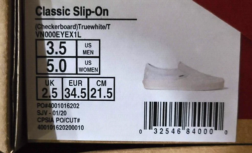 Item available today is the, Vans VN000EYE Classic Slip On White Checkered Shoes Men's SZ 3.5, Ladies SZ 5 . This is a new pair of shoes, ready to wear . Please see photos for more details. Items in photos are what come with the listing. Thank you for shopping small business. There are other sizes available in our store. Terms of Sale Listing is for item and/or accessories shown in photos only. Some states may require a tax be charged at the time of checkout, this is eBay automated. We ship and answer questions Mon-Fri 8am-4pm EST We stand behind our products and would be happy to assist you if you experience an issue. Please contact us first. We ship to your confirmed PayPal address only using UPS or USPS. Items over $200 may require signature upon delivery. There are no returns on items sold for parts. A RESTOCK FEE UP TO 20% MAY BE CHARGED FOR RETURNS THAT ARE NOT OF FAULT OF THE SELLER OR ITEMS NOT RETURNED IN THE SAME CONDITION. Thank you for shopping small business! Shipping Information Only ships within the Continental United States with one business day processing time. 11/19/2024 (, ADN) I-108 (B)