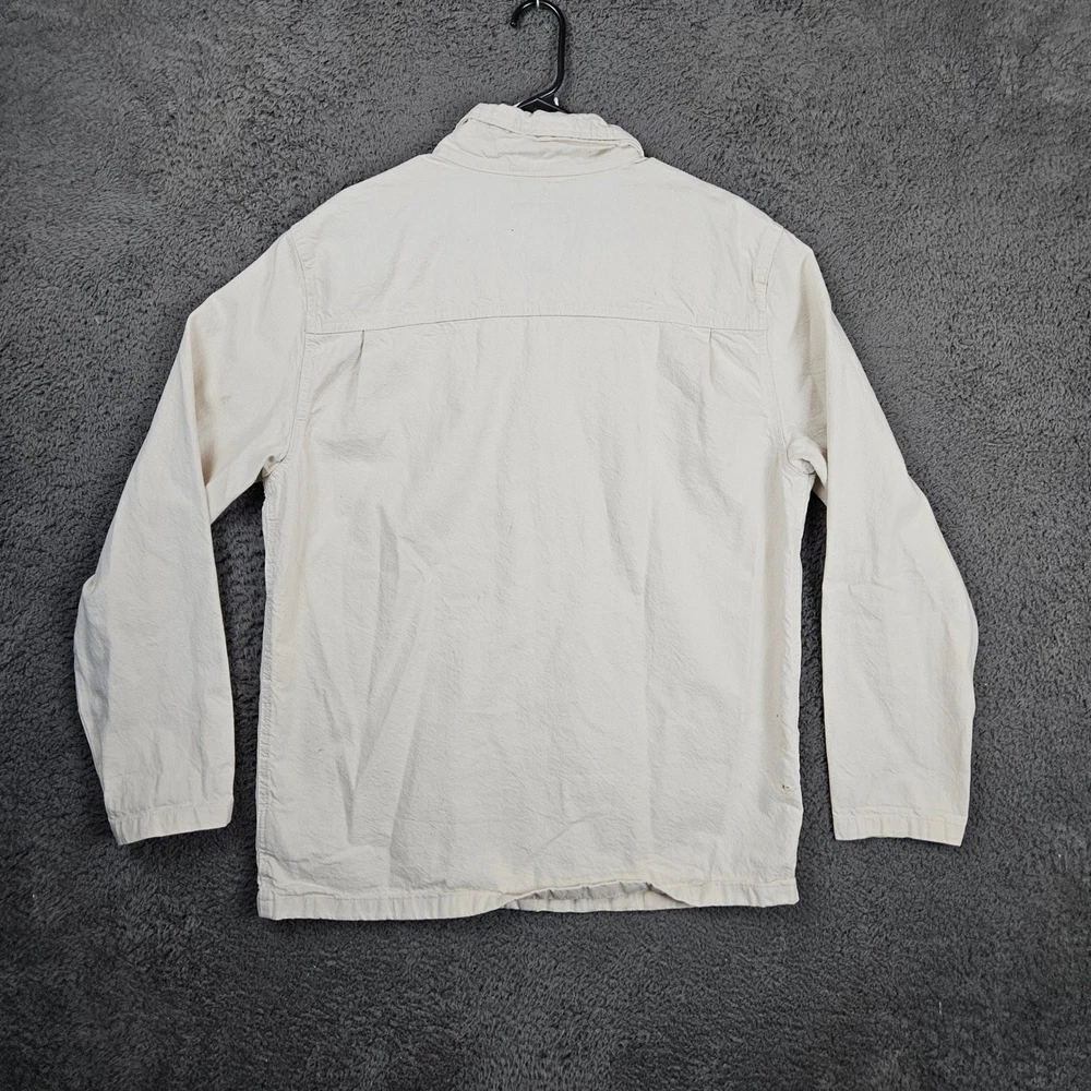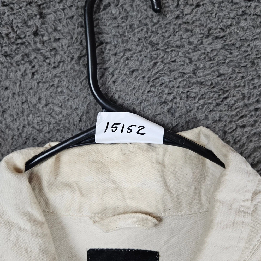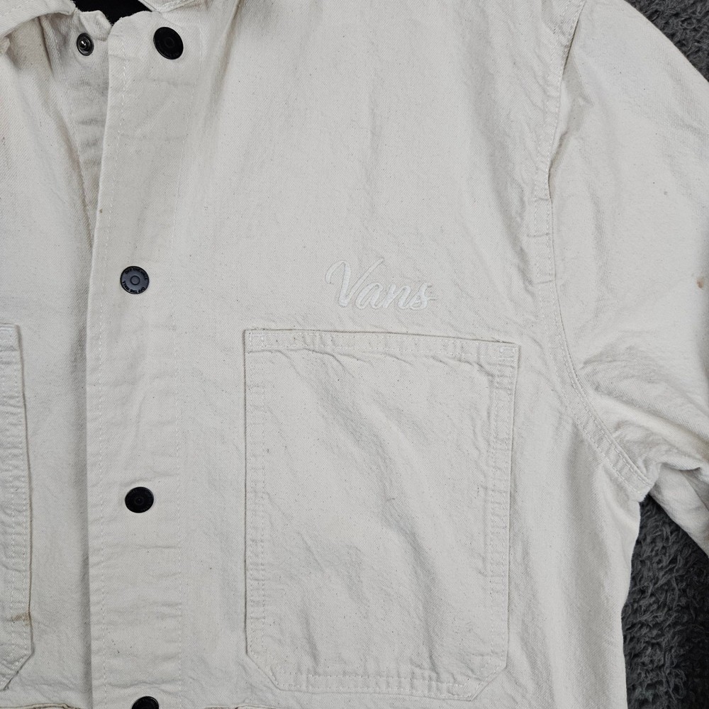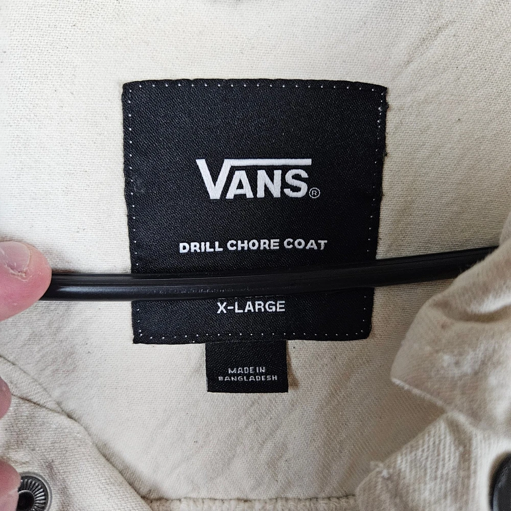 Type: Jacket Style: Military Jacket Outer Shell Material: Cotton Department: Men Closure: Button, Snap Fabric Type: Canvas Occasion: Casual, Workwear Performance/Activity: Skateboarding Accents: Embroidered, Button, Logo Collar Style: Point Country of Origin: Bangladesh Features: Pockets, Collared Fit: Regular Keywords: Vans jacket, Chore coat, Workwear, Men's outerwear, Beige jacket, Button up, Casual, Streetwear, Utility jacket, Durable, Fashion, X Large