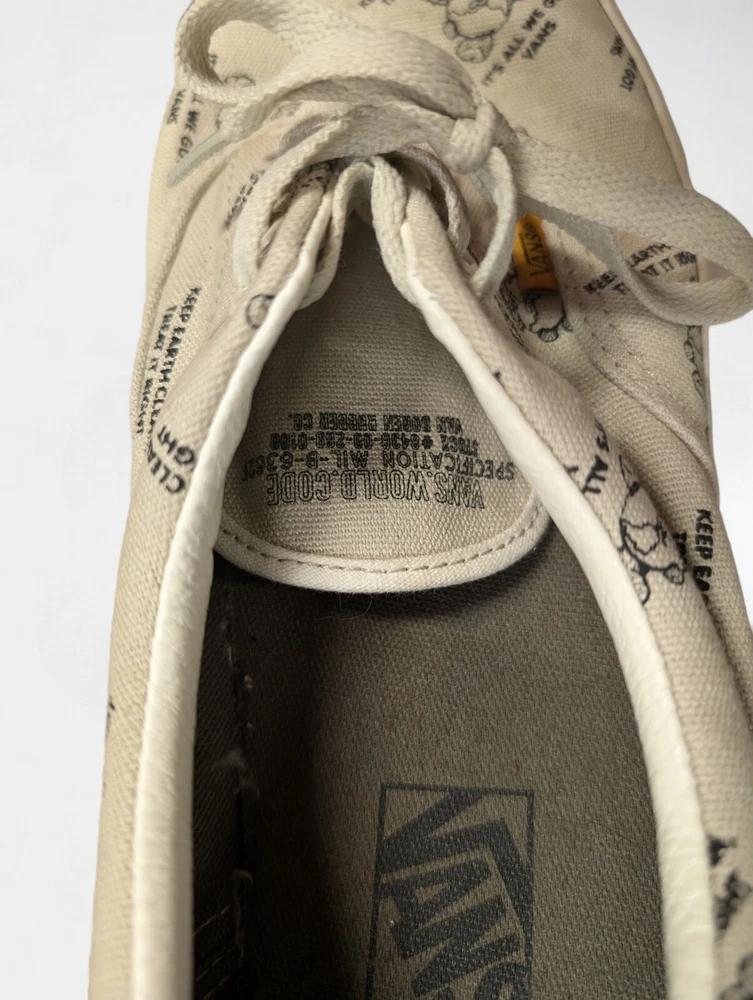 Elevate your style with these Vans Era shoes in a natural beige colorway. Featuring a lace-up closure and low-top shaft, these sneakers are perfect for any occasion from casual wear to workwear. The canvas upper material is adorned with Vans World Code graphics and the iconic oatmeal marsh design, paying homage to the brand's hippie and preppy roots. These shoes are not just stylish, but also functional with a medium (D, M) shoe width and cushioned insole for comfort. The rubber outsole ensures durability for gym and training activities, walking, yoga, and even driving and skateboarding. With a product line of Vans Era, these shoes are a must-have for any sneaker enthusiast who values nature and environmental awareness.